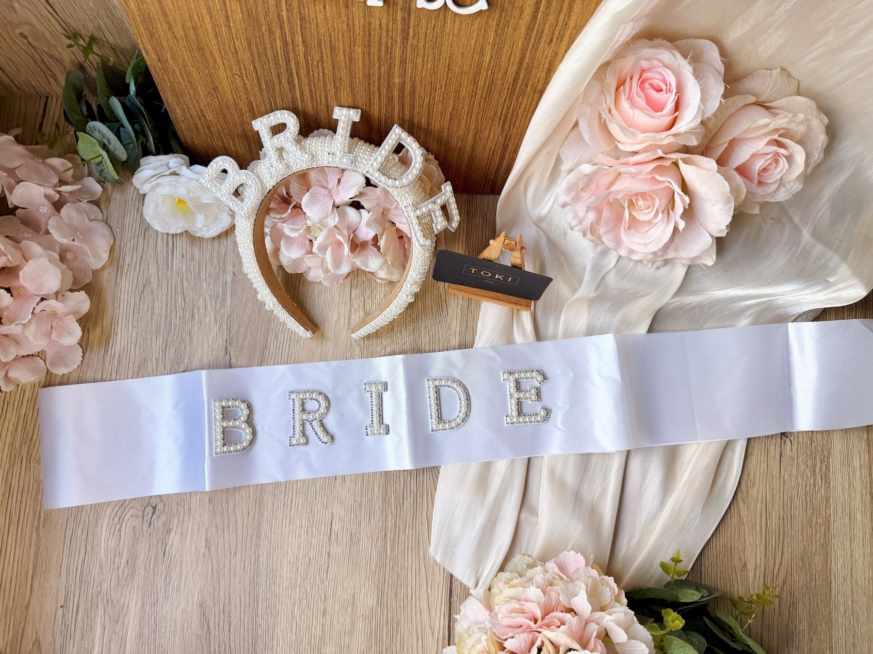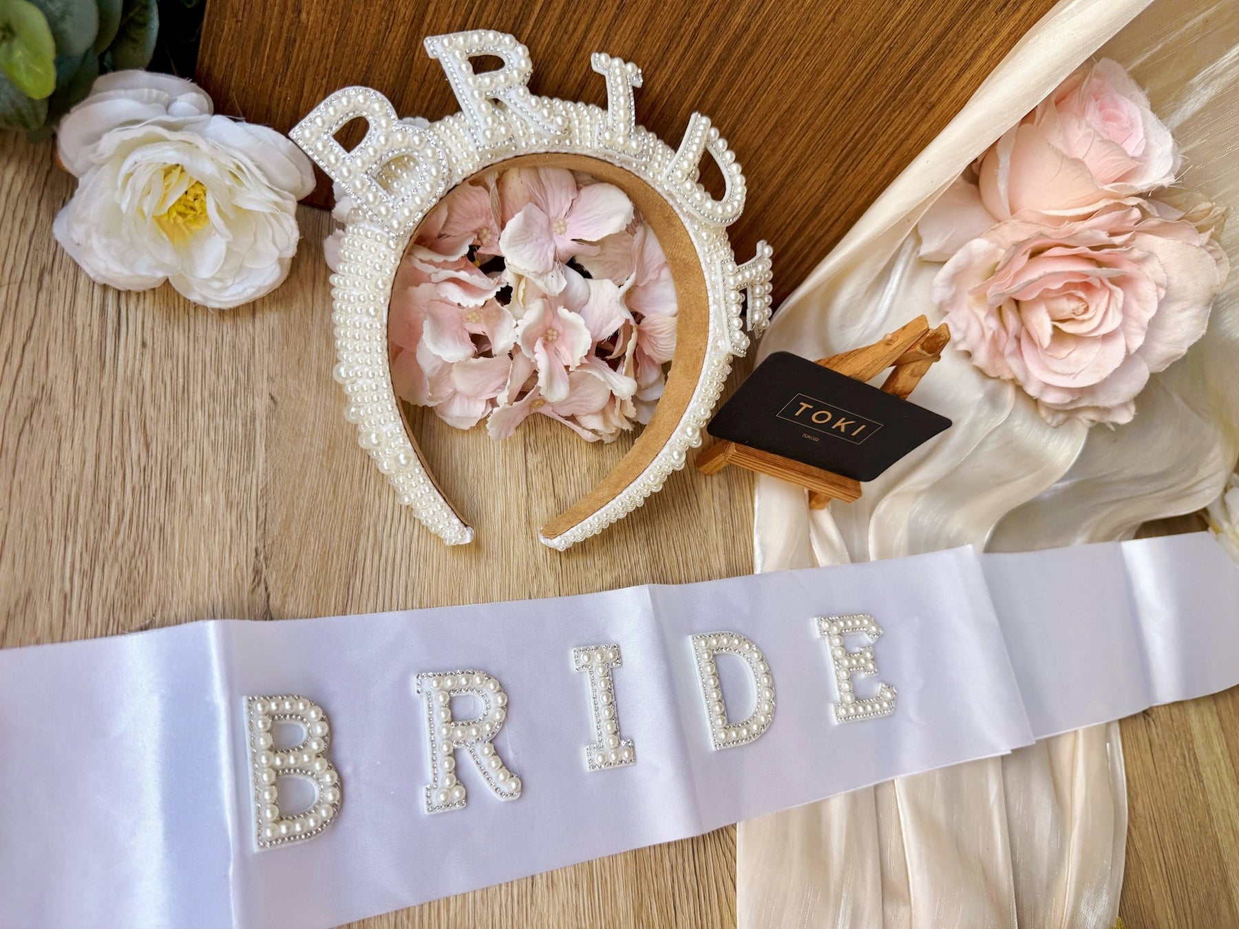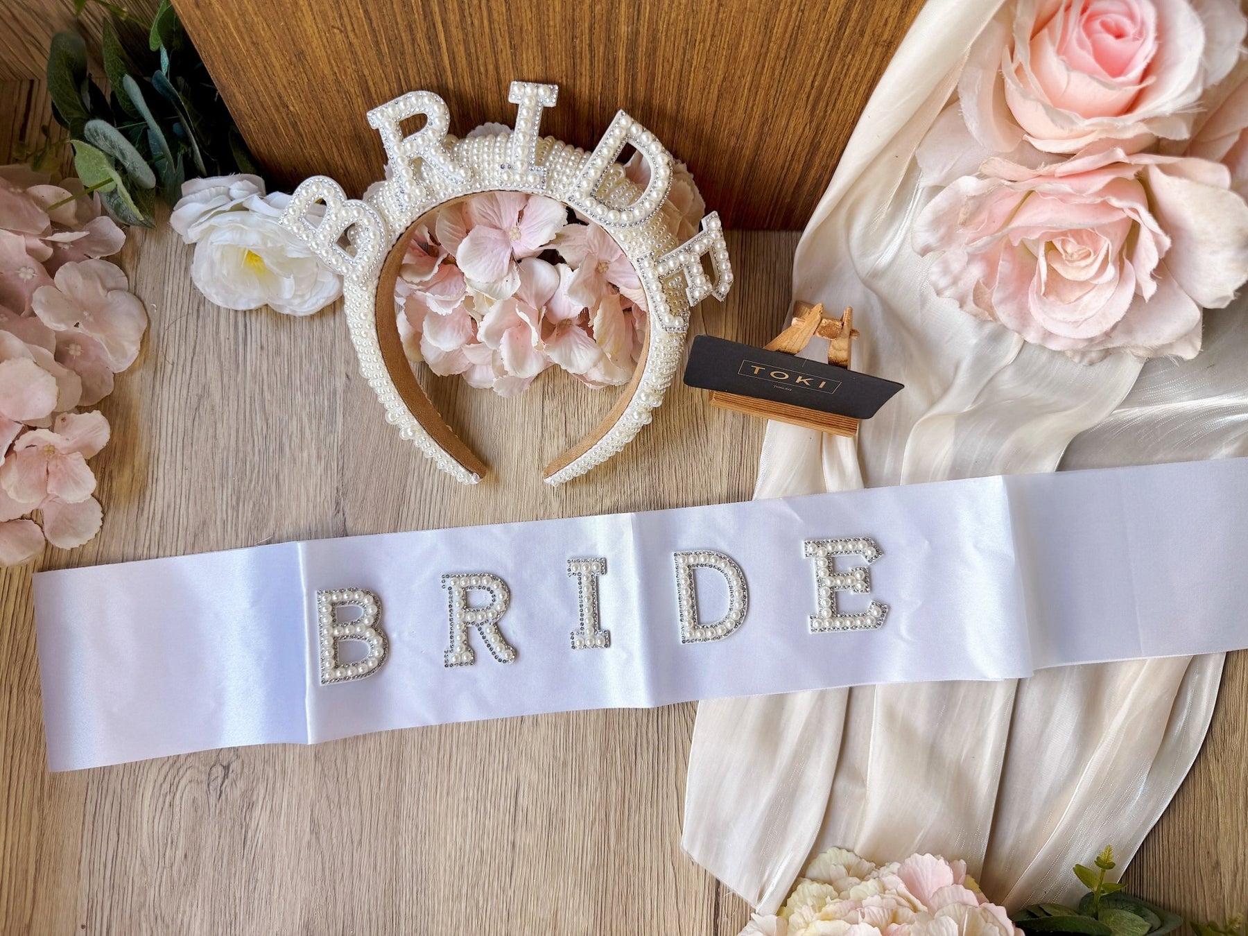 Celebrate your bachelorette party in style with this elegant set featuring a "Bride" sash and matching hairband adorned with pearls. The delicate pearls add a touch of sophistication, making you stand out on your special day. Comfortable and lightweight, this set is perfect for a memorable and fun celebration.