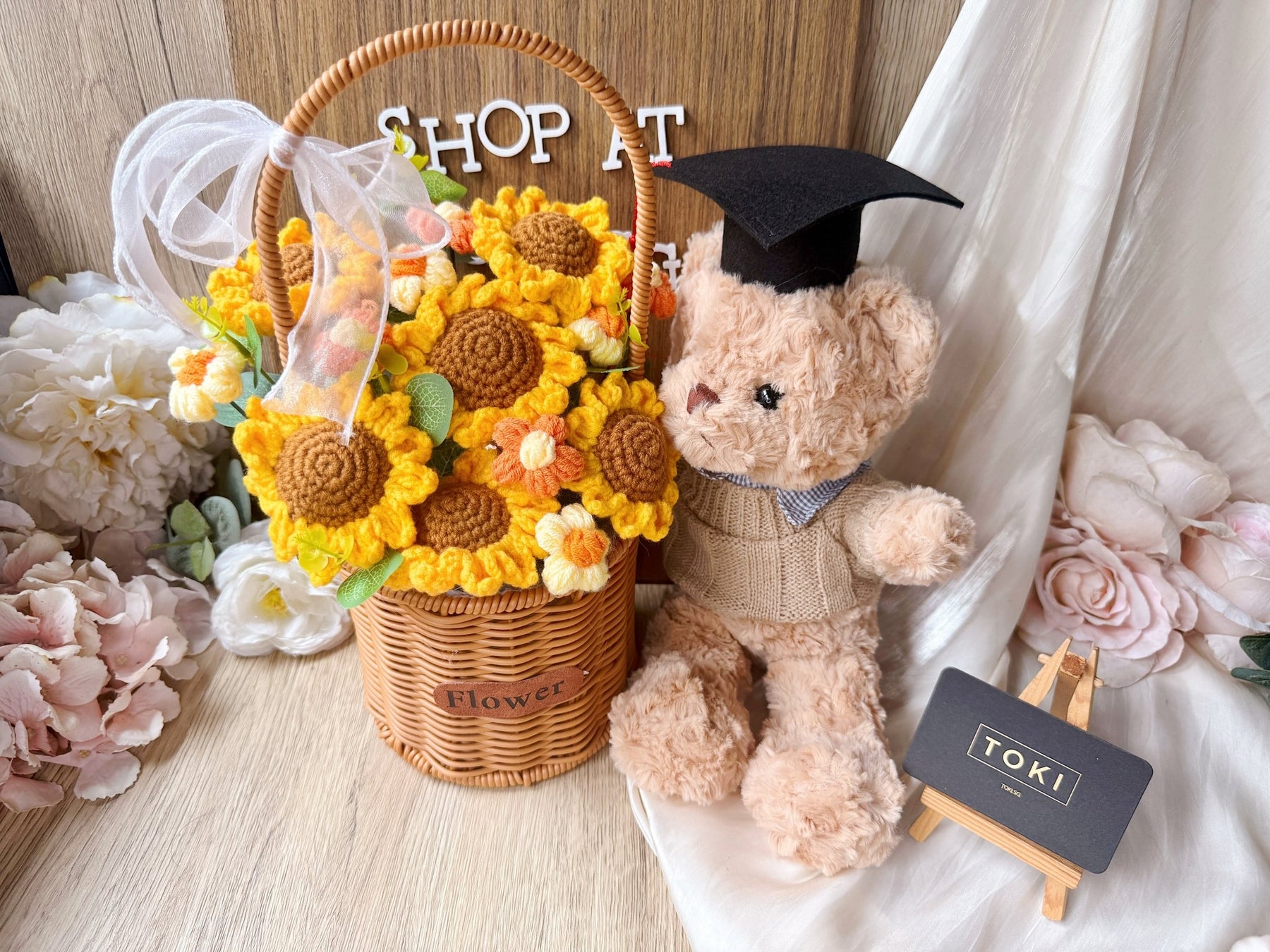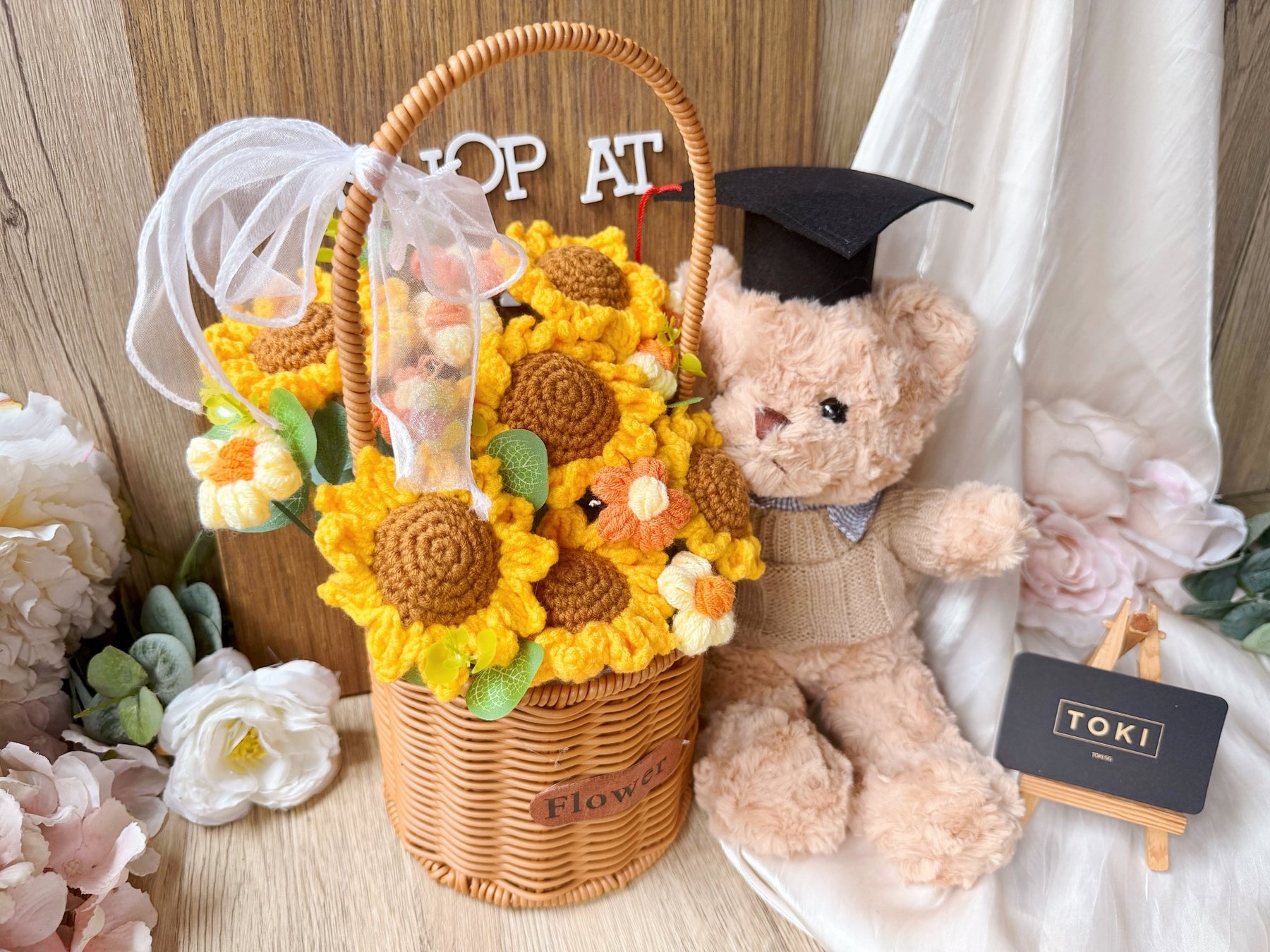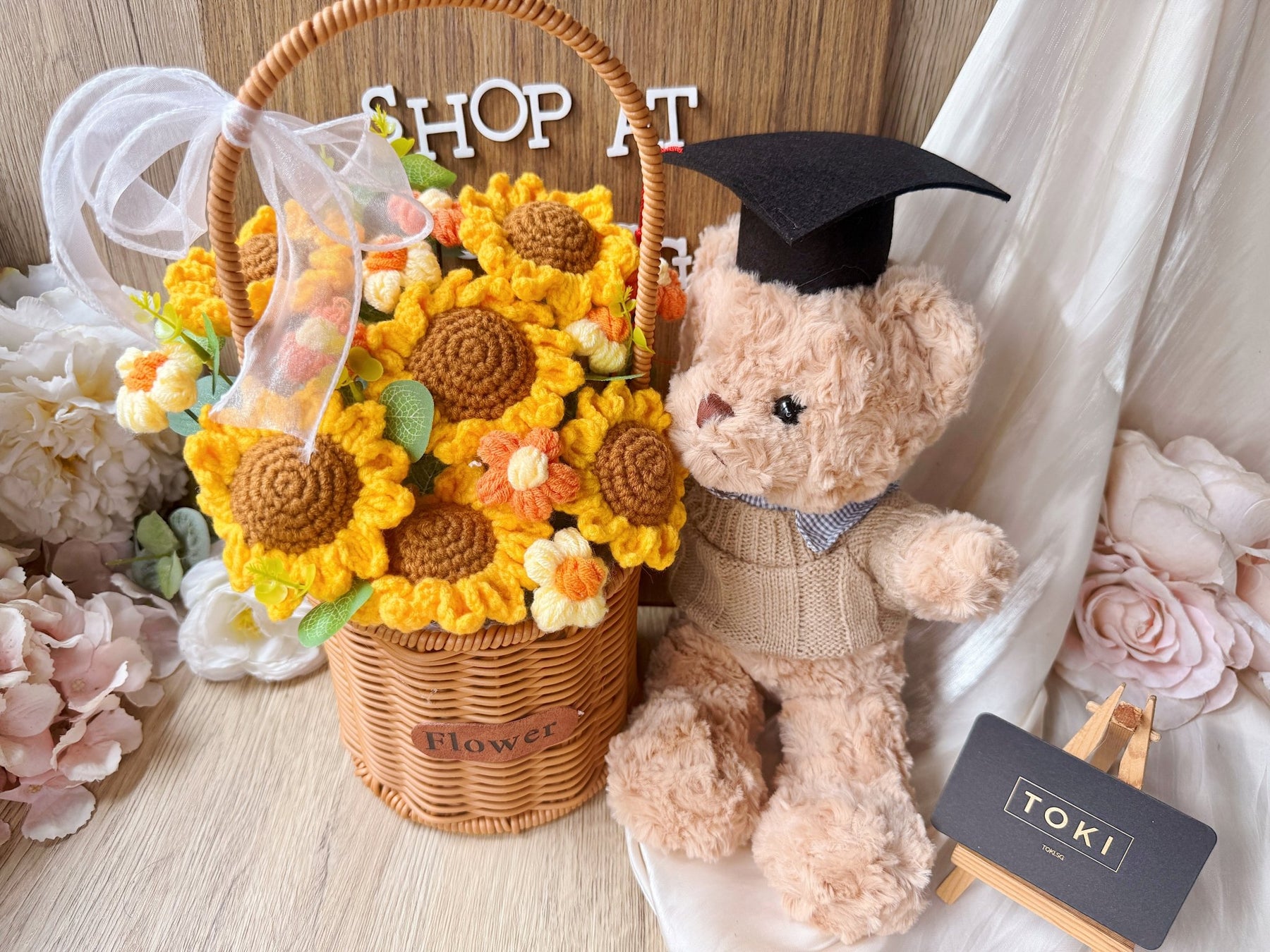 A charming gift featuring six vibrant crochet sunflowers nestled in a cozy basket, complete with an adorable bear companion perched on the side. The perfect keepsake to celebrate graduation day—thoughtful, unique, and bursting with warmth. Each piece is crafted with care, making it an ideal present for graduates who appreciate everlasting treasures and meaningful tokens of achievement.