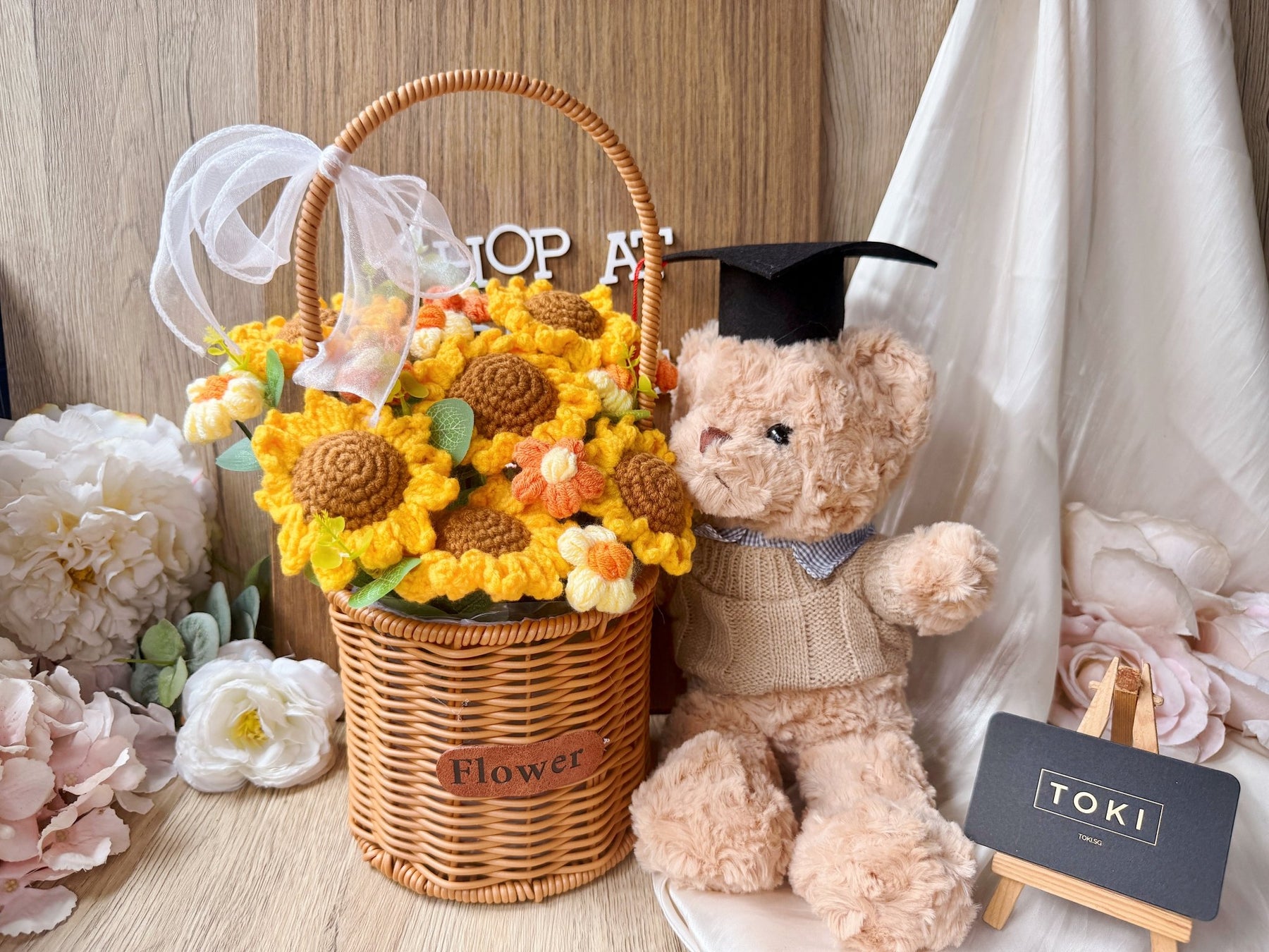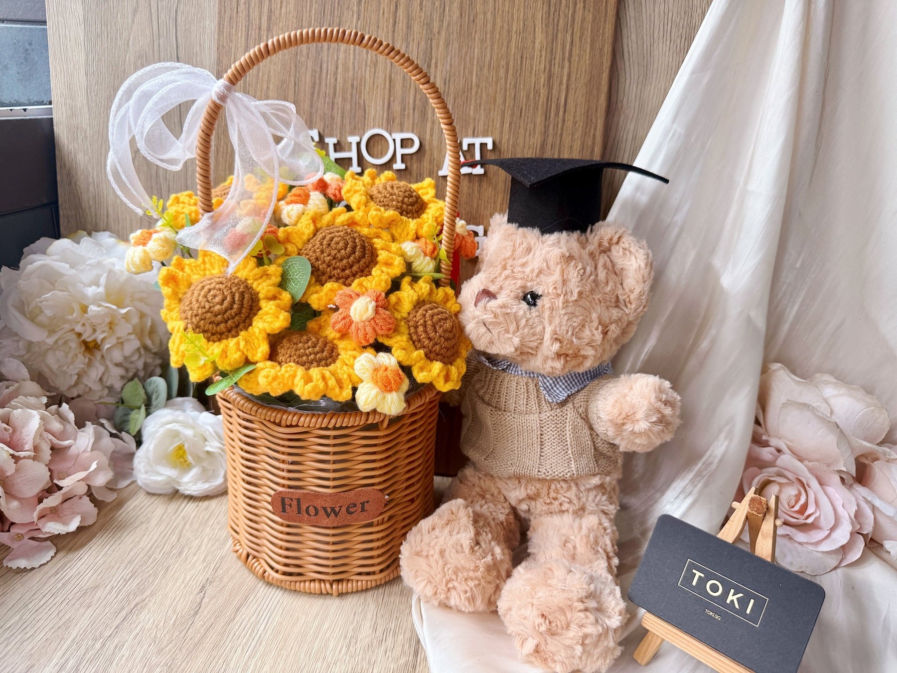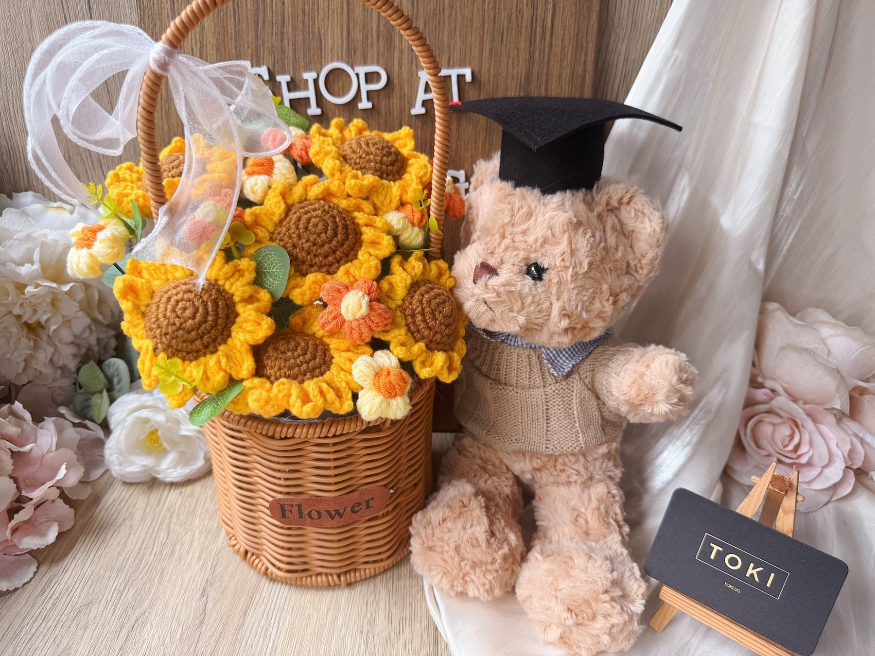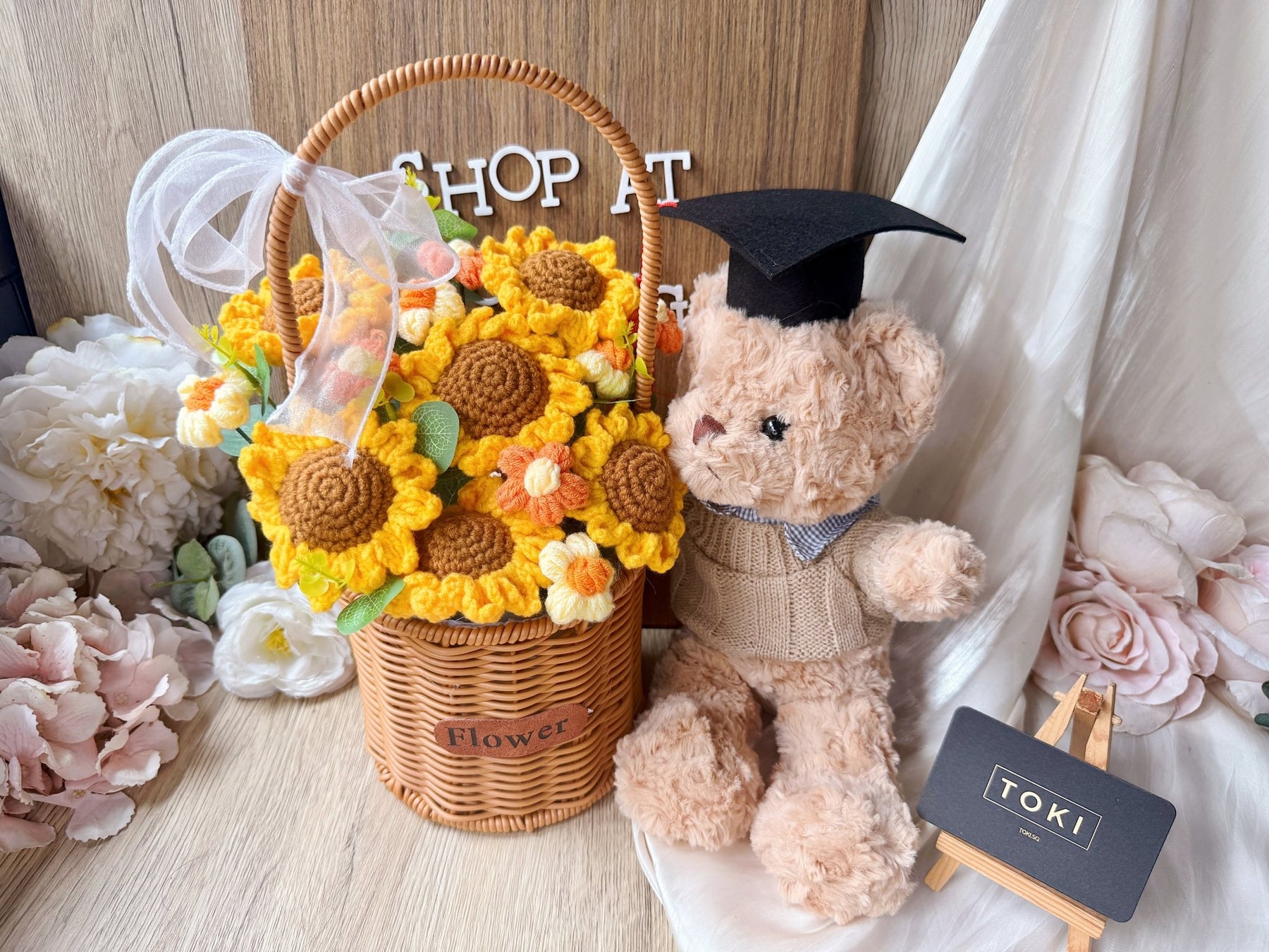 A charming gift featuring six vibrant crochet sunflowers nestled in a cozy basket, complete with an adorable bear companion perched on the side. The perfect keepsake to celebrate graduation day—thoughtful, unique, and bursting with warmth. Each piece is crafted with care, making it an ideal present for graduates who appreciate everlasting treasures and meaningful tokens of achievement.