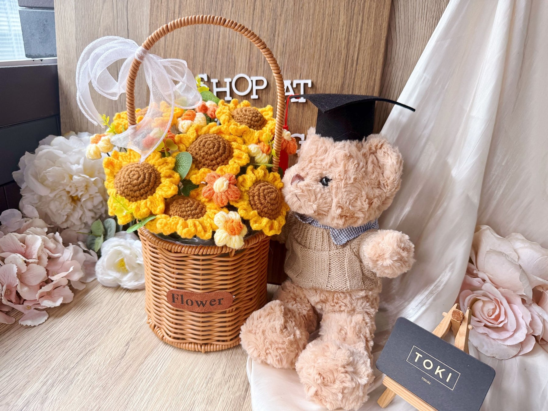 TOKI - 6 Crochet Sunflower Basket with Graduation Bear, Flowers, Graduation /