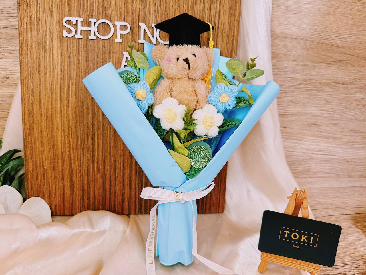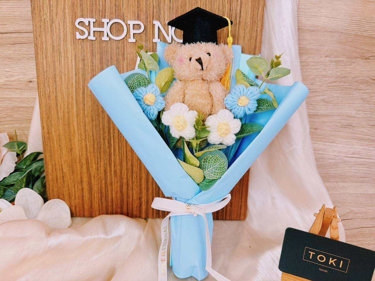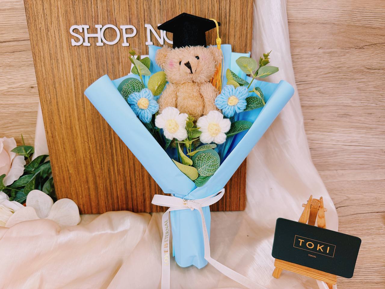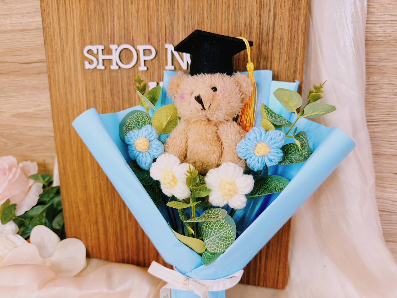Celebrate your graduation with our adorable graduation bear! This small and affordable bouquet includes 4 small crochet flowers for a touch of beauty. Perfect for any graduation celebration, this bear is sure to bring joy and commemorate this special milestone.