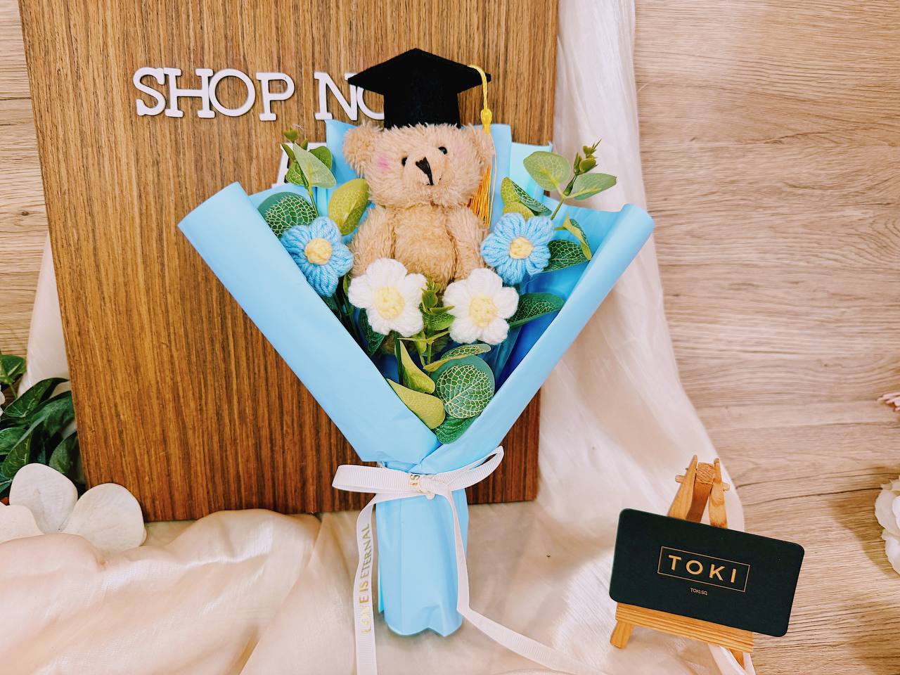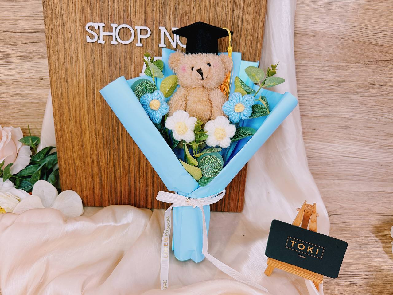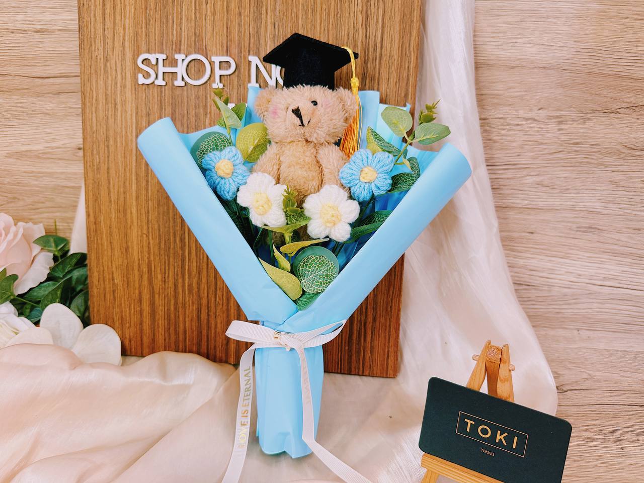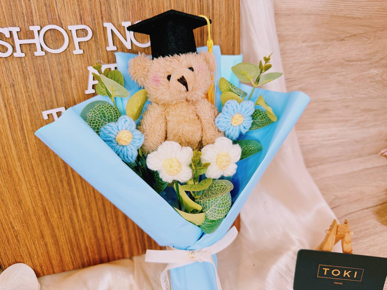 Celebrate your graduation with our adorable graduation bear! This small and affordable bouquet includes 4 small crochet flowers for a touch of beauty. Perfect for any graduation celebration, this bear is sure to bring joy and commemorate this special milestone.
