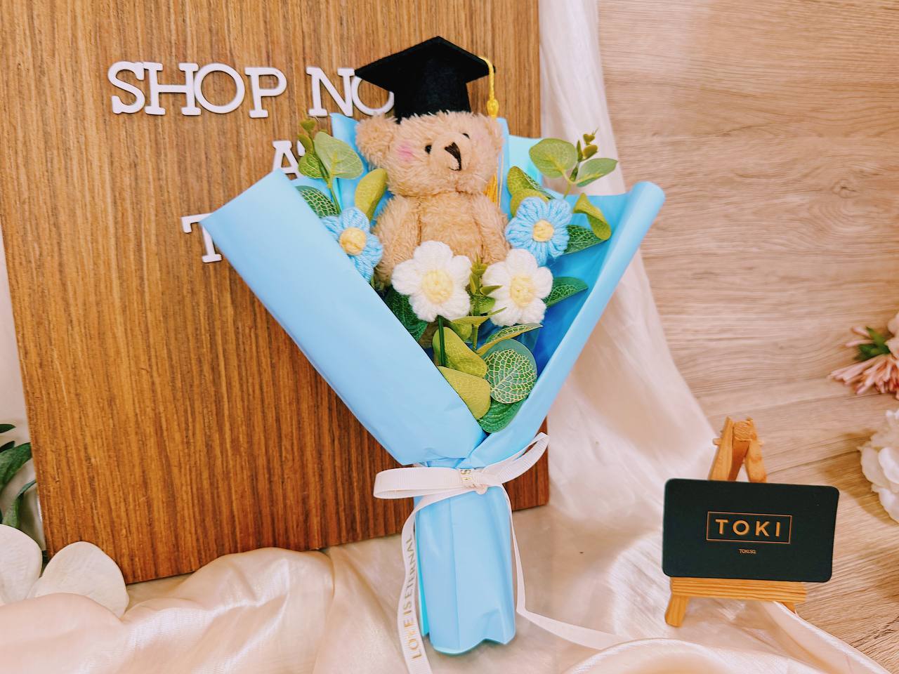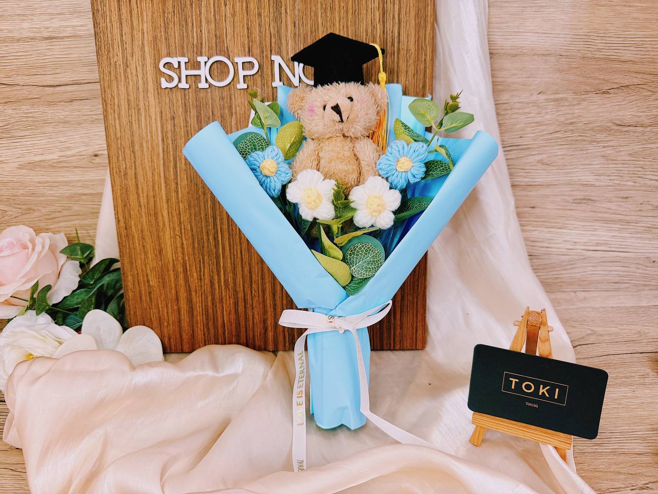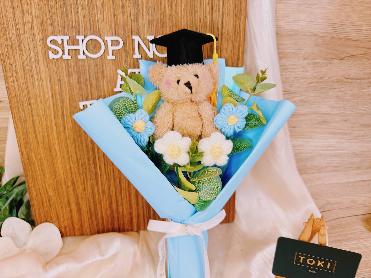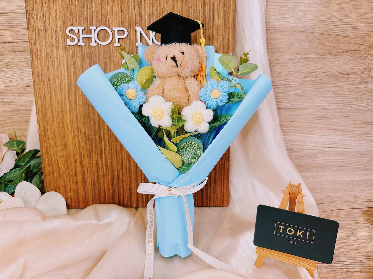 Celebrate your graduation with our adorable graduation bear! This small and affordable bouquet includes 4 small crochet flowers for a touch of beauty. Perfect for any graduation celebration, this bear is sure to bring joy and commemorate this special milestone.