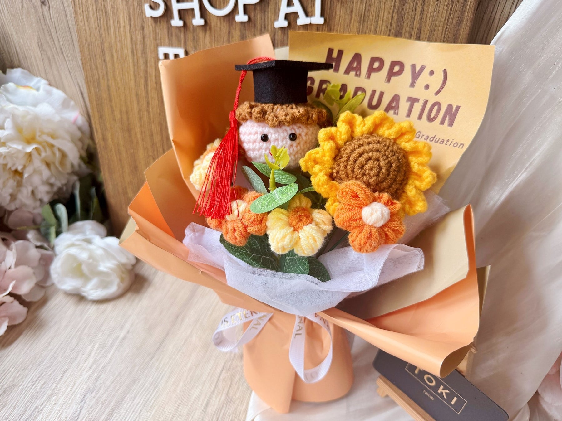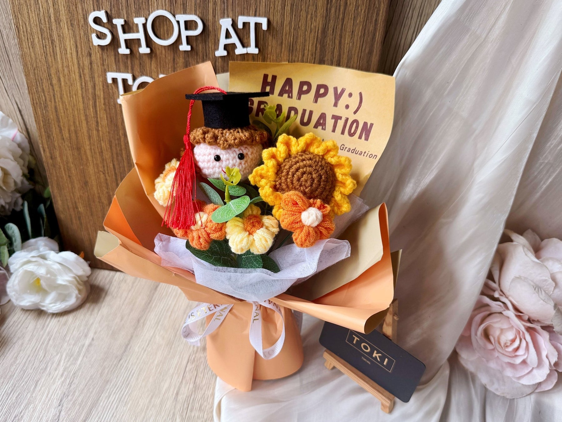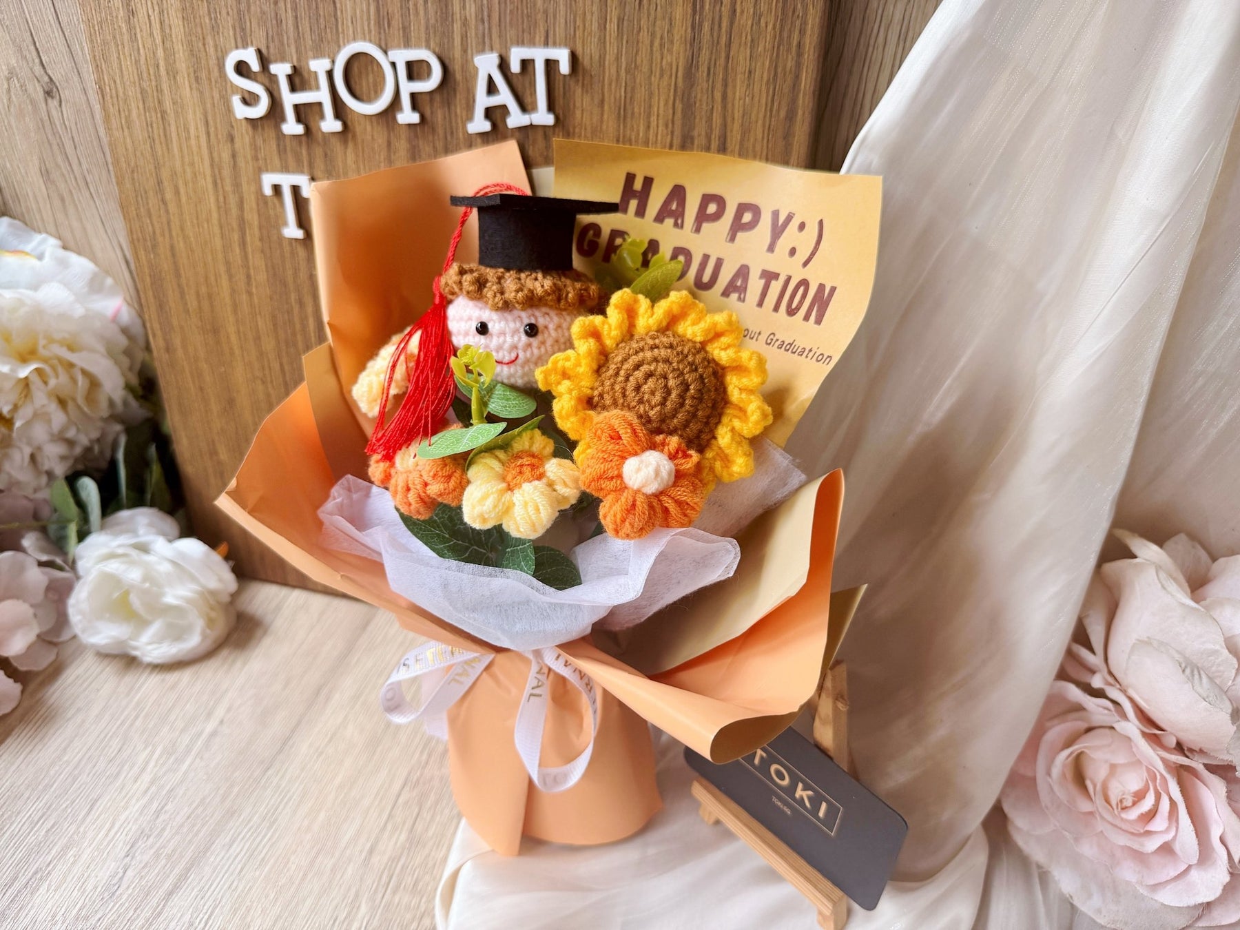 This charming mini crochet bouquet celebrates graduation in the sweetest way. Featuring crochet sunflowers and four small blooms, it's a thoughtful keepsake that won't wilt or fade. Perfect as a little surprise gift—affordable, durable, and made to treasure for years to come.