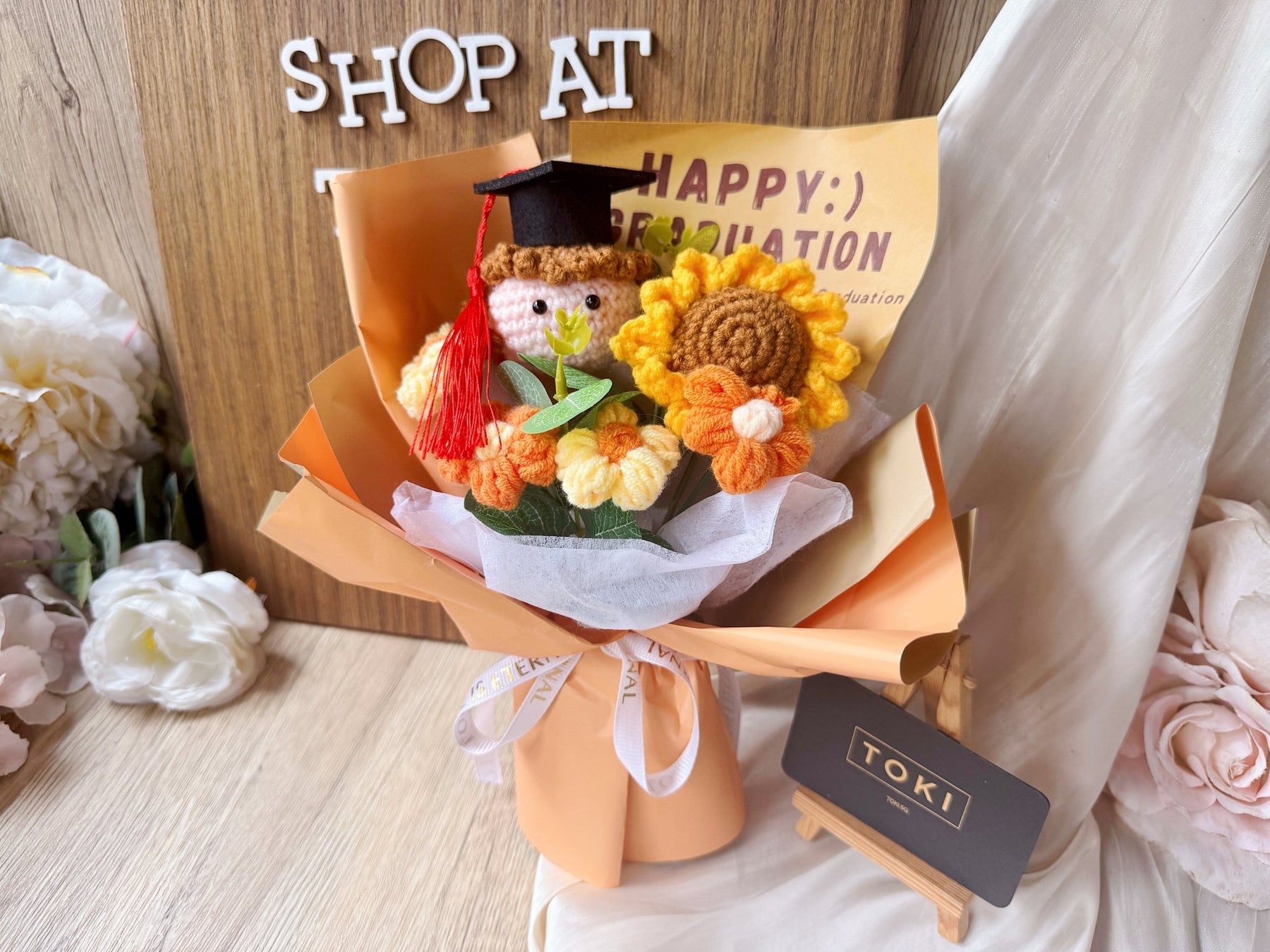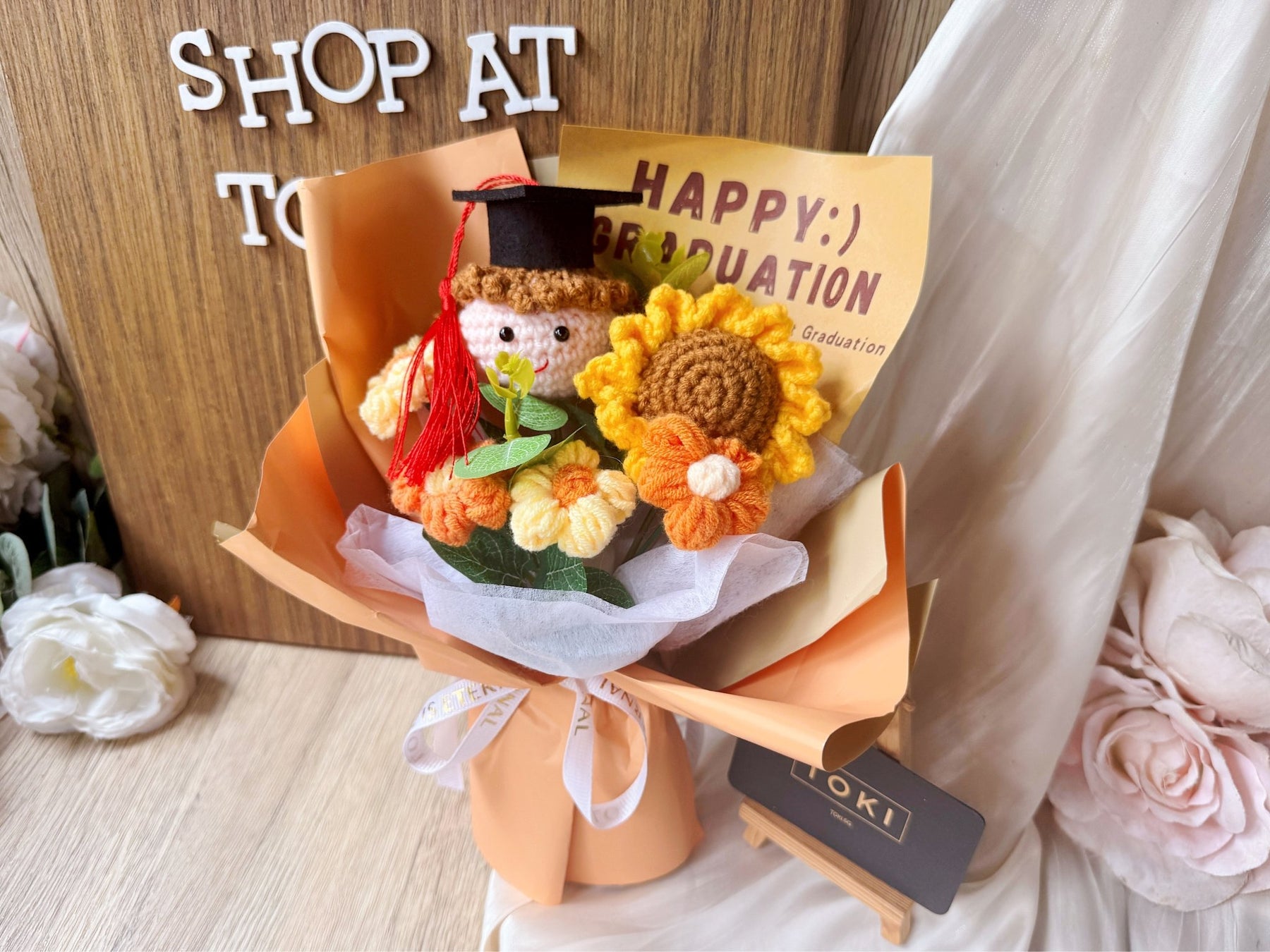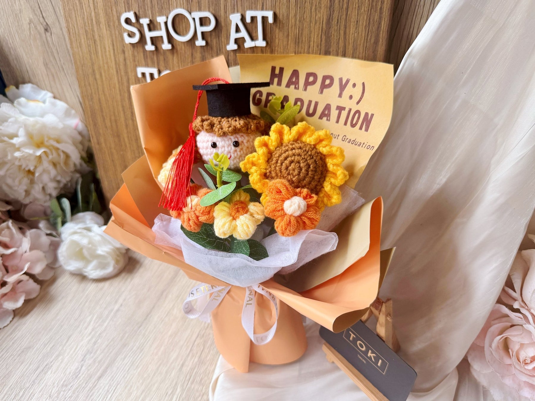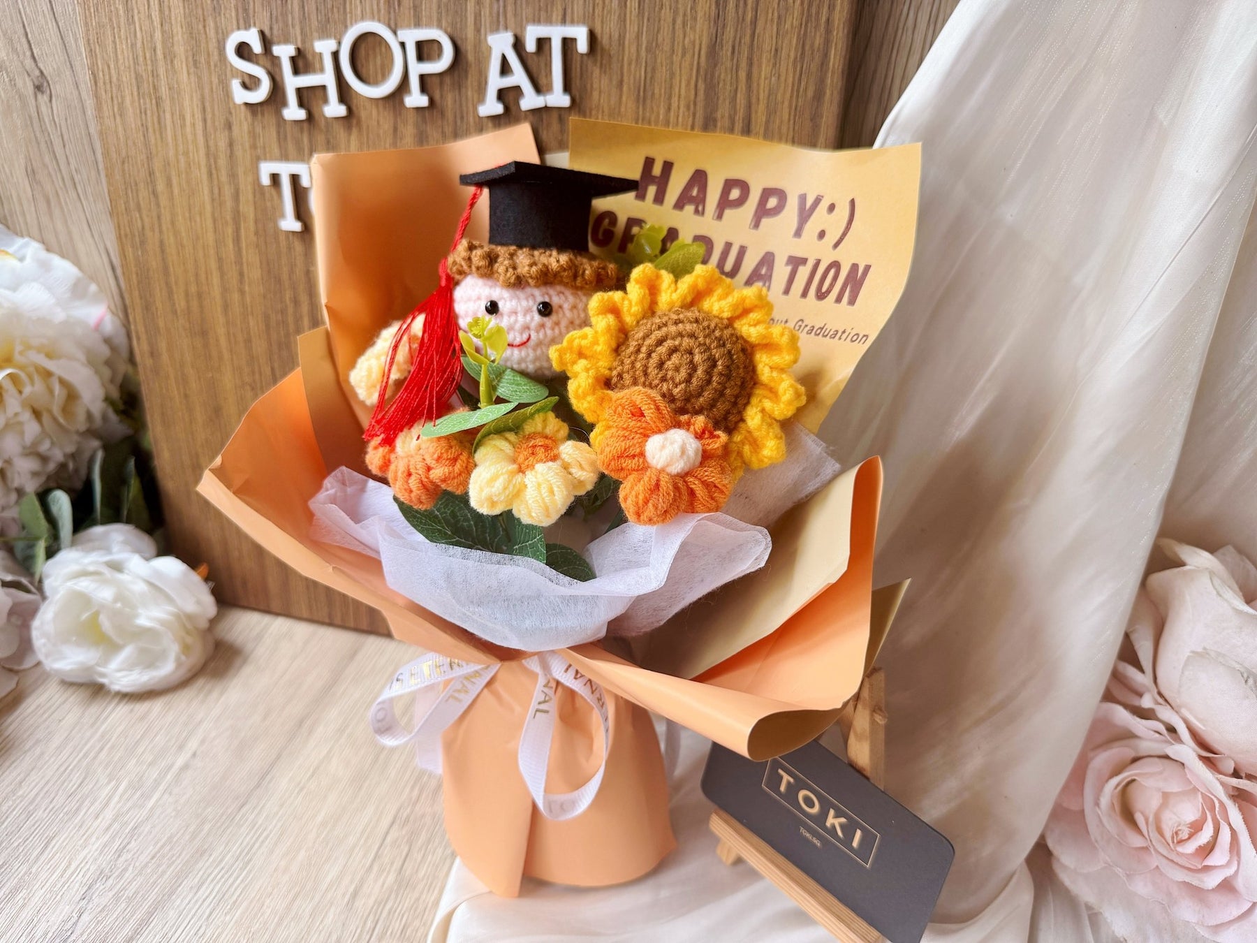 This charming mini crochet bouquet celebrates graduation in the sweetest way. Featuring crochet sunflowers and four small blooms, it's a thoughtful keepsake that won't wilt or fade. Perfect as a little surprise gift—affordable, durable, and made to treasure for years to come.