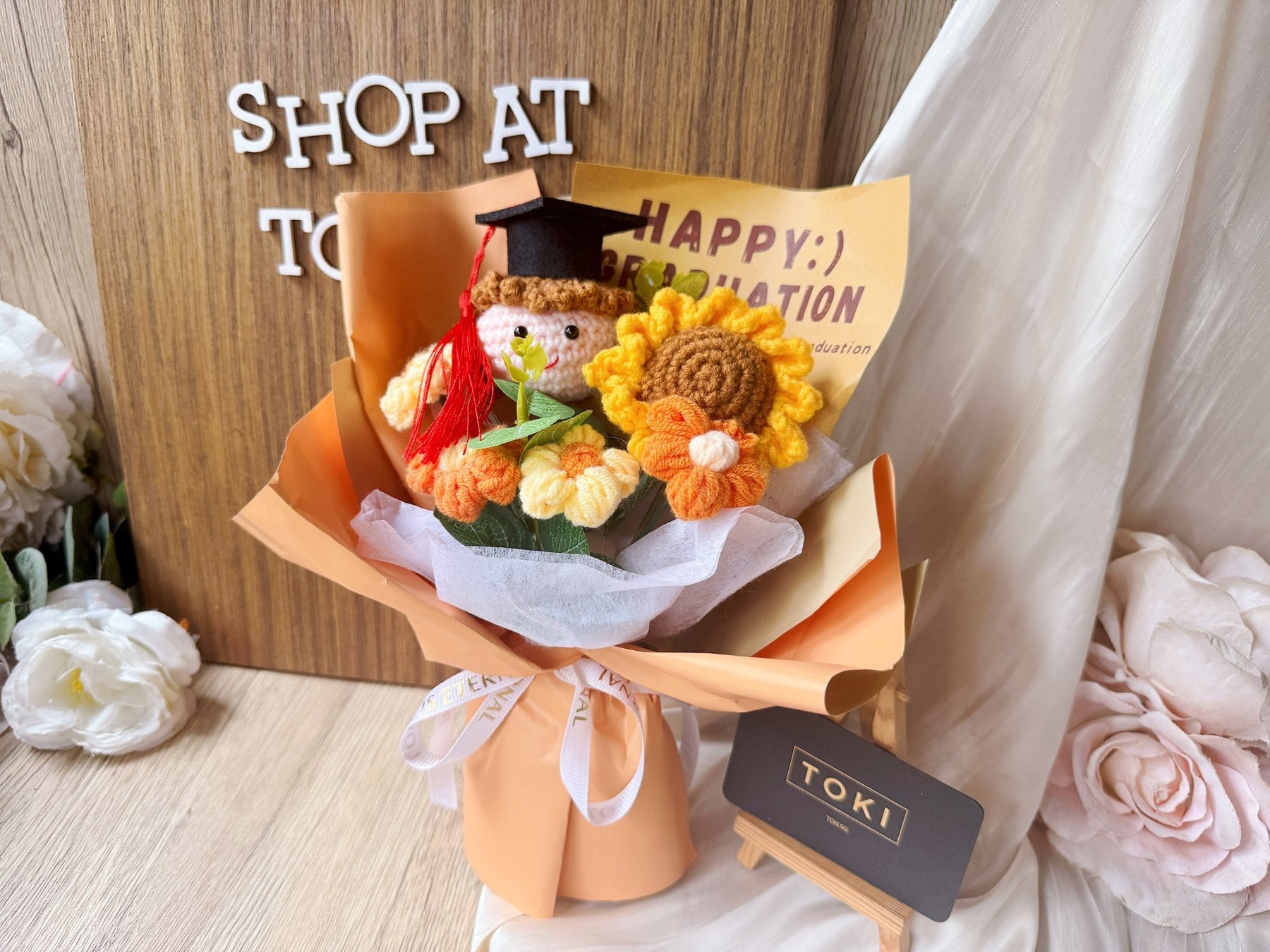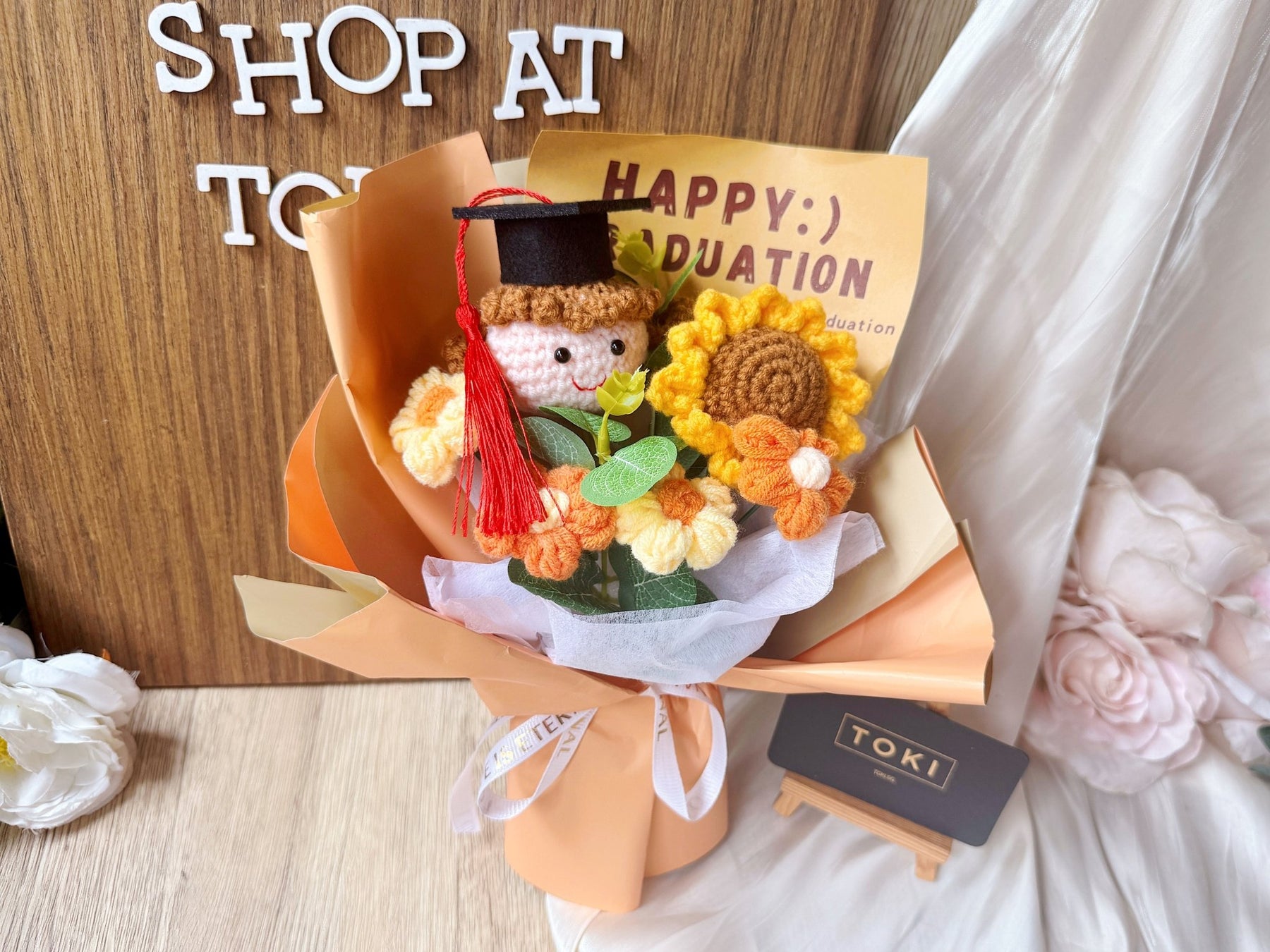 TOKI - Mini Crochet Graduation Bouquet - Long Hair Graduate, 1 Sunflower & 4 Small Flowers, Flowers, Graduation /