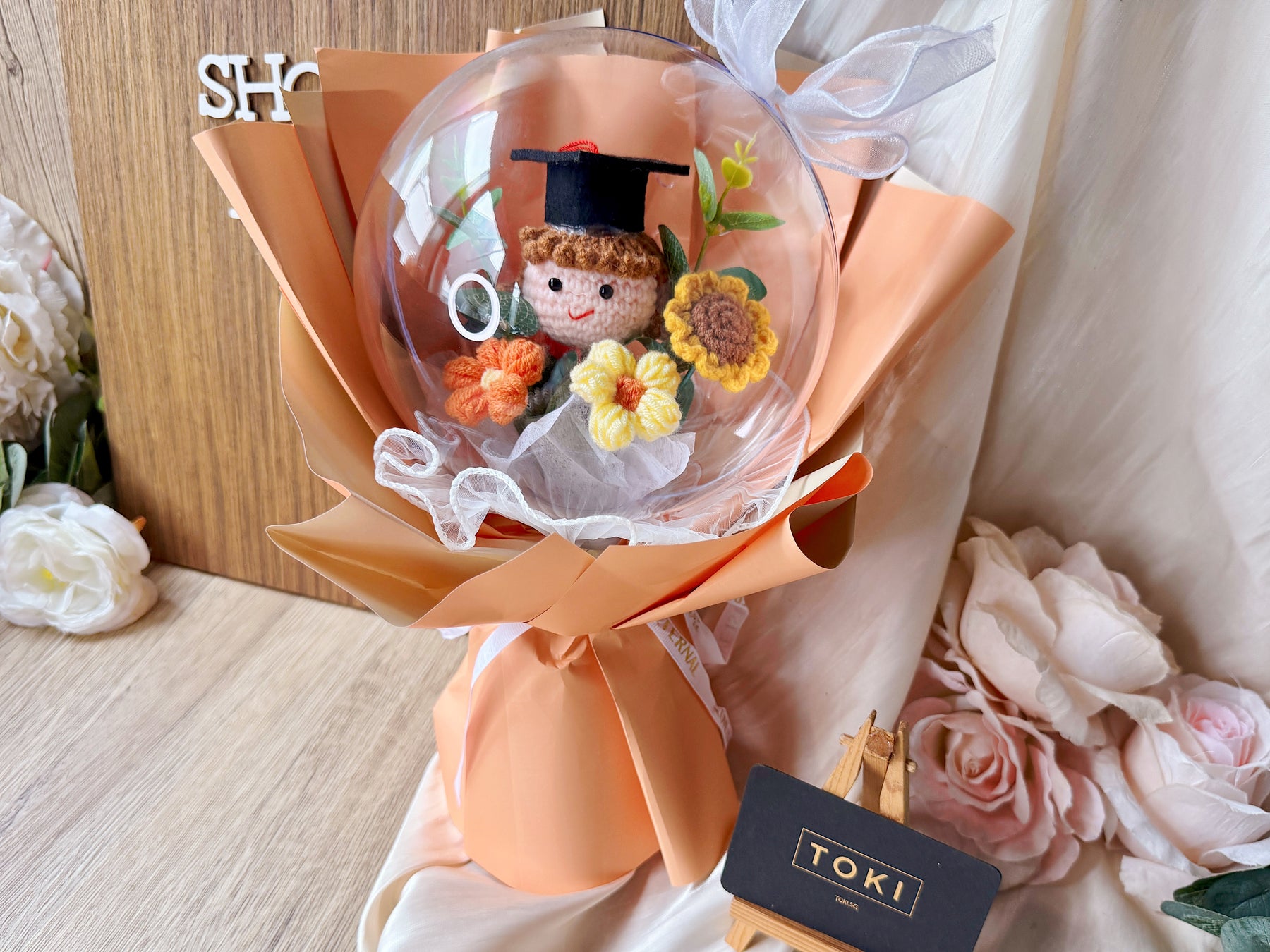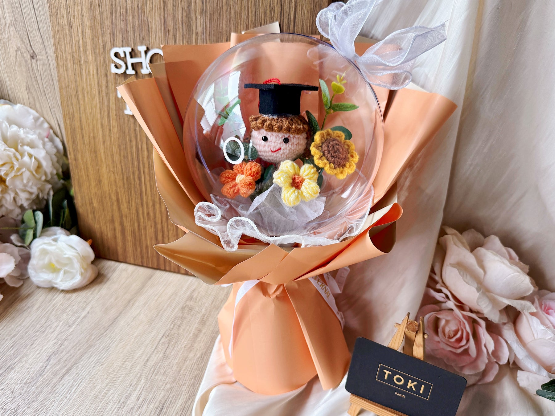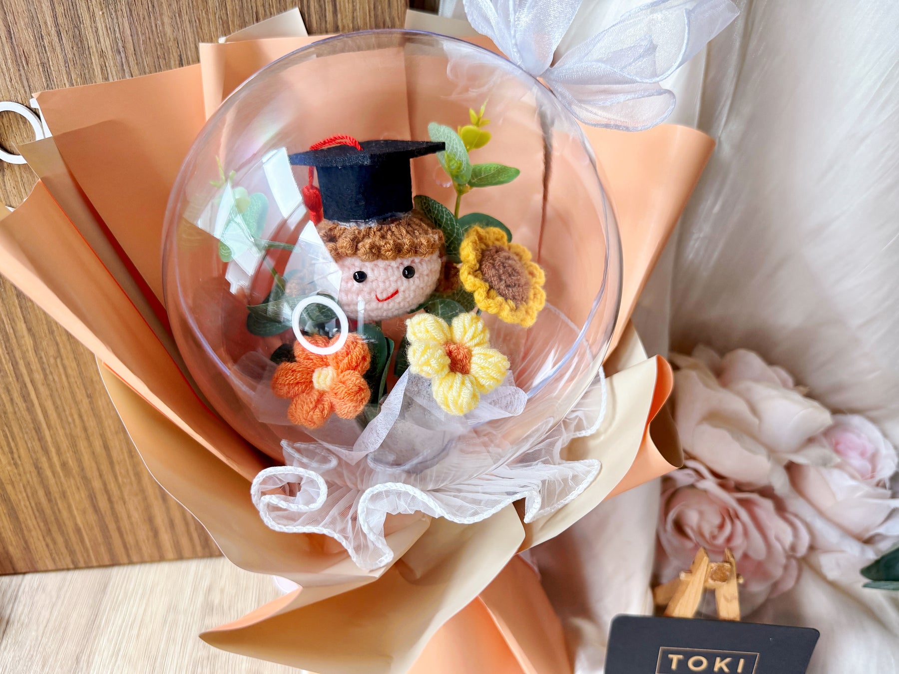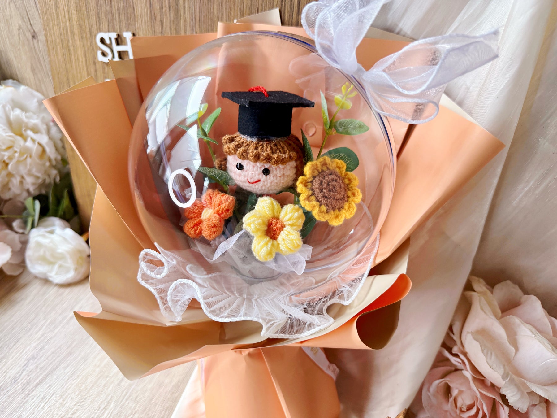 Celebrate your graduate's achievement with the "Top Of the Globe!" Crochet Graduate Bouquet. This charming crochet globe bouquet makes a unique and lasting gift, symbolizing success and new beginnings. Affordable and handcrafted, it offers a special way to honor their hard work that will be treasured for years to come.