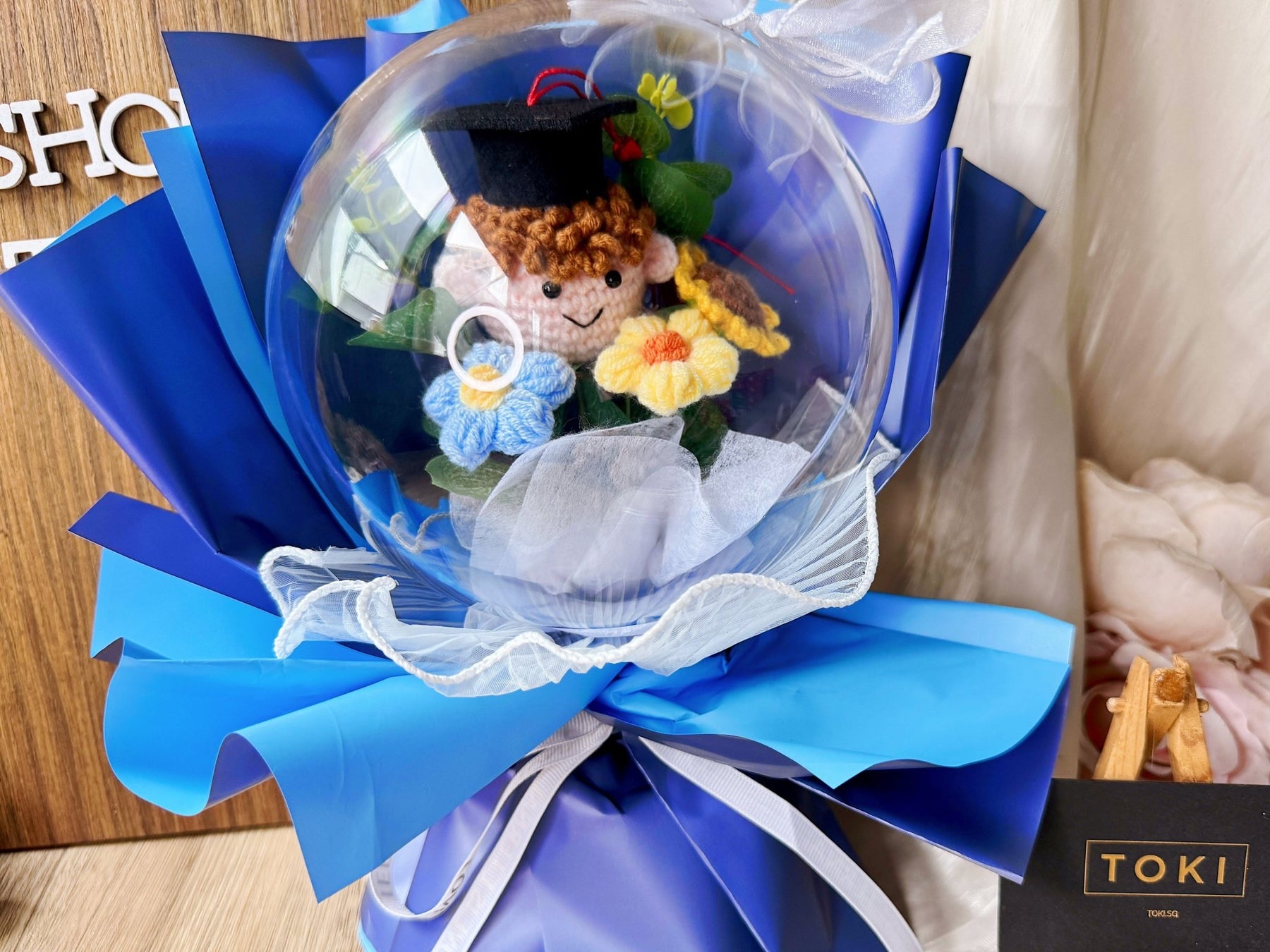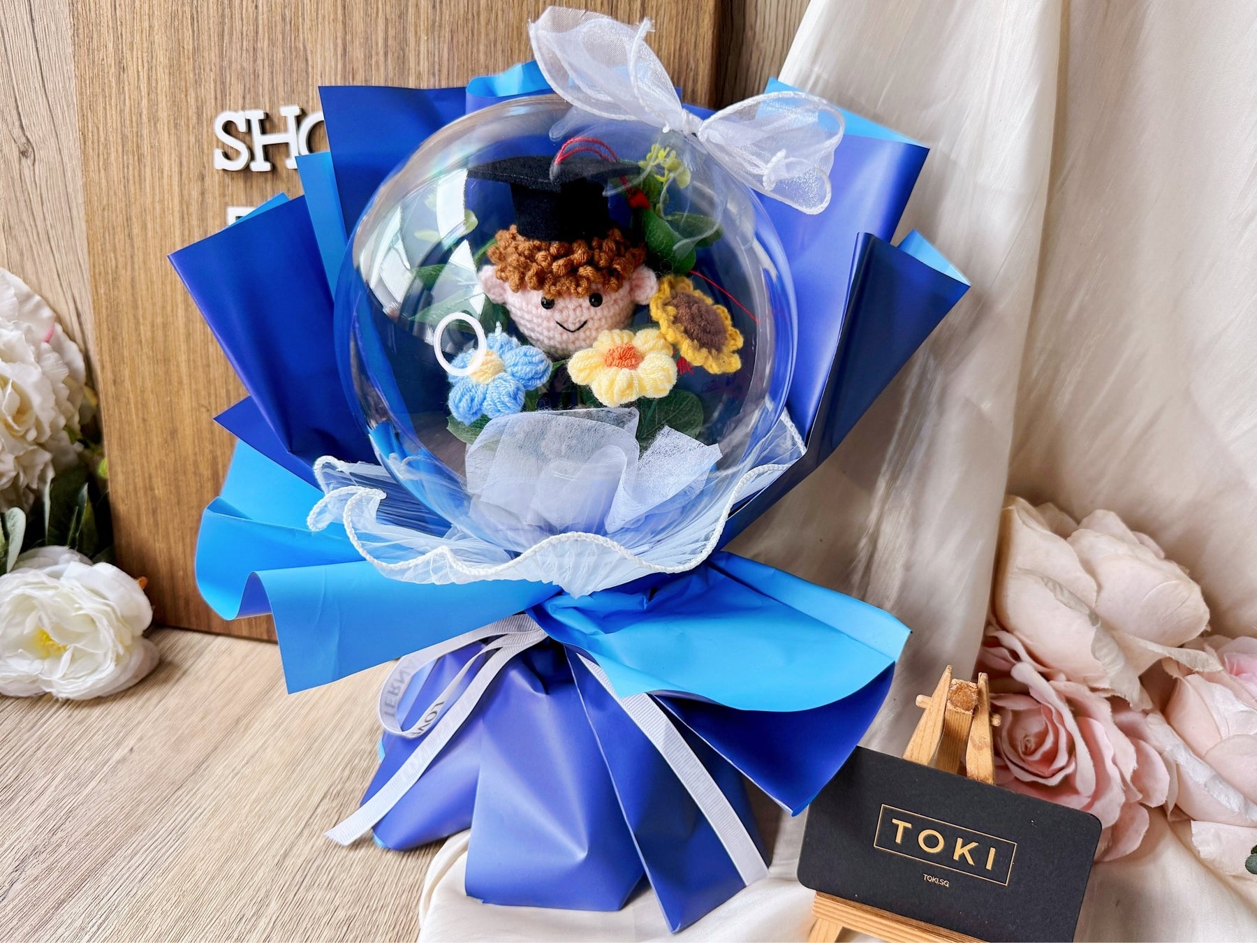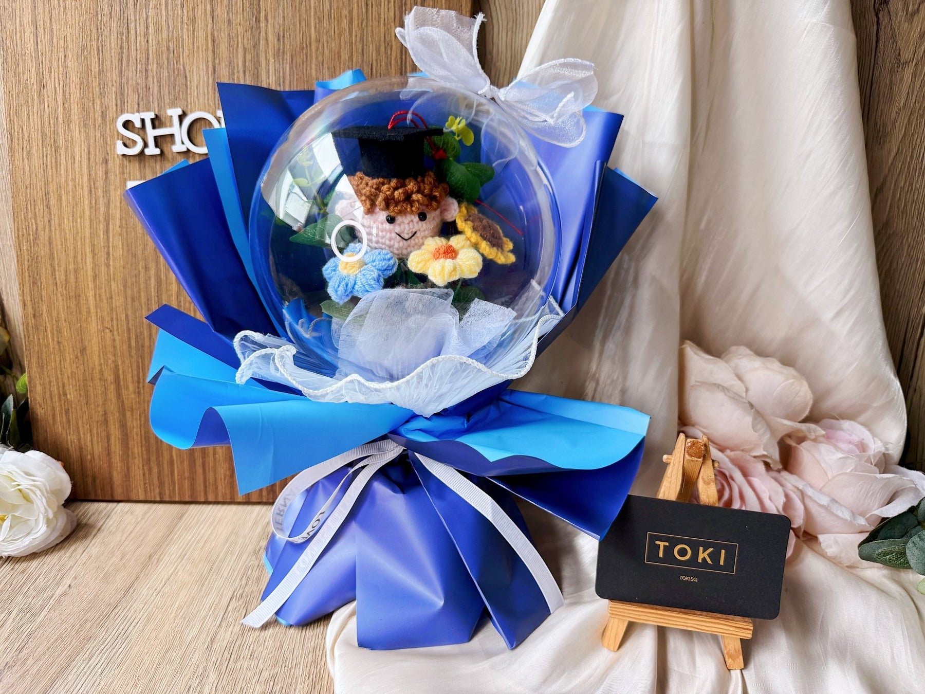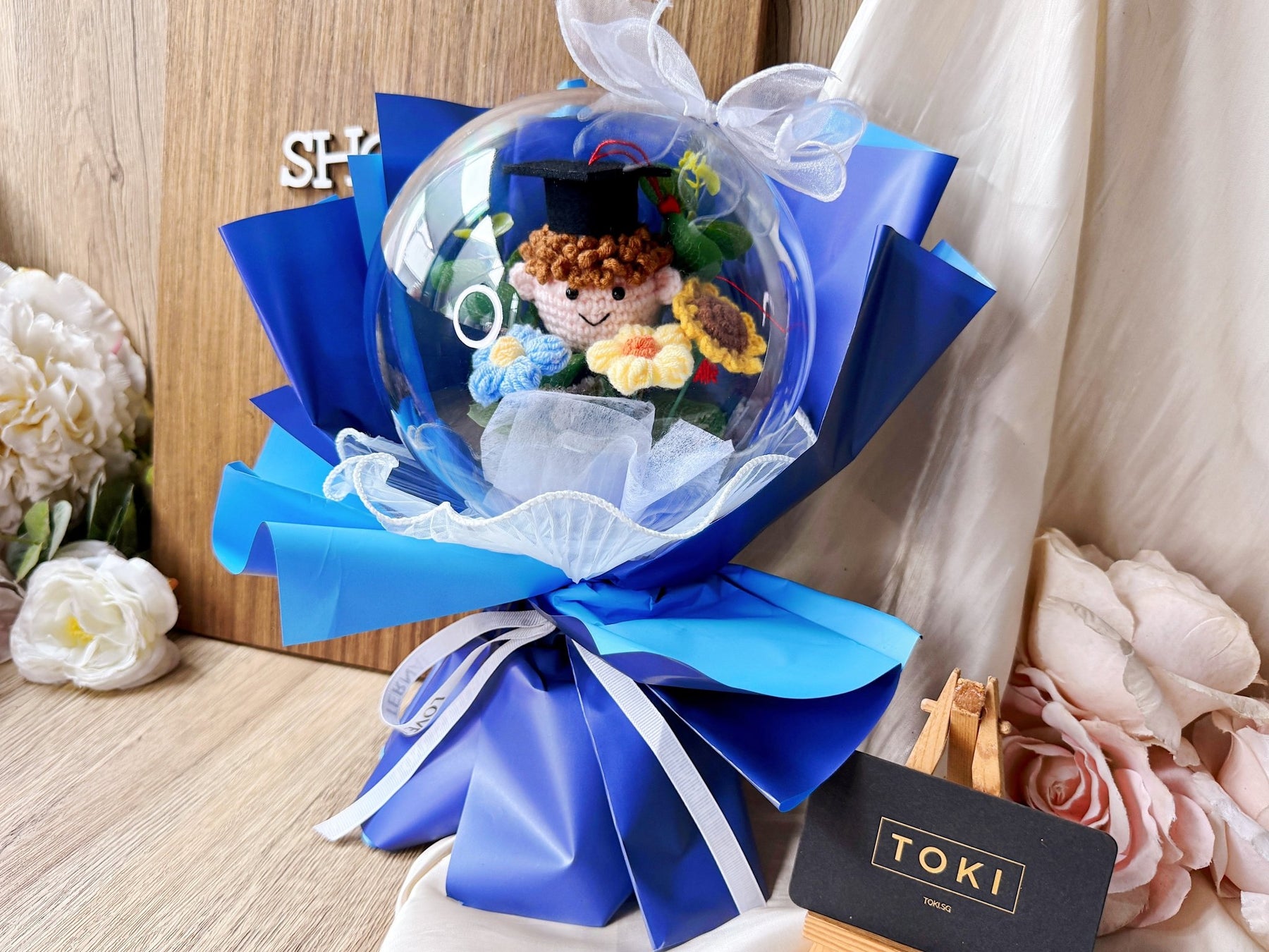 TOKI - "Top Of the Globe!" Crochet Short Hair Graduate Bouquet - Blue, Flowers, Graduation /