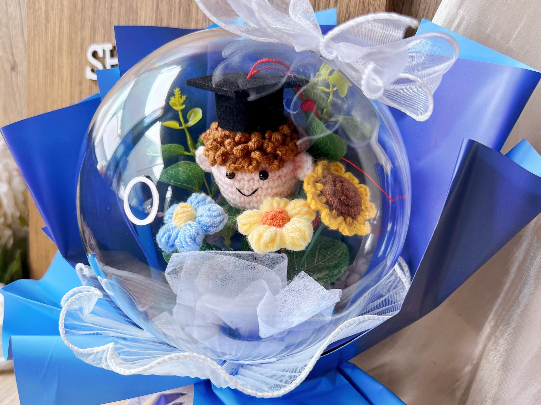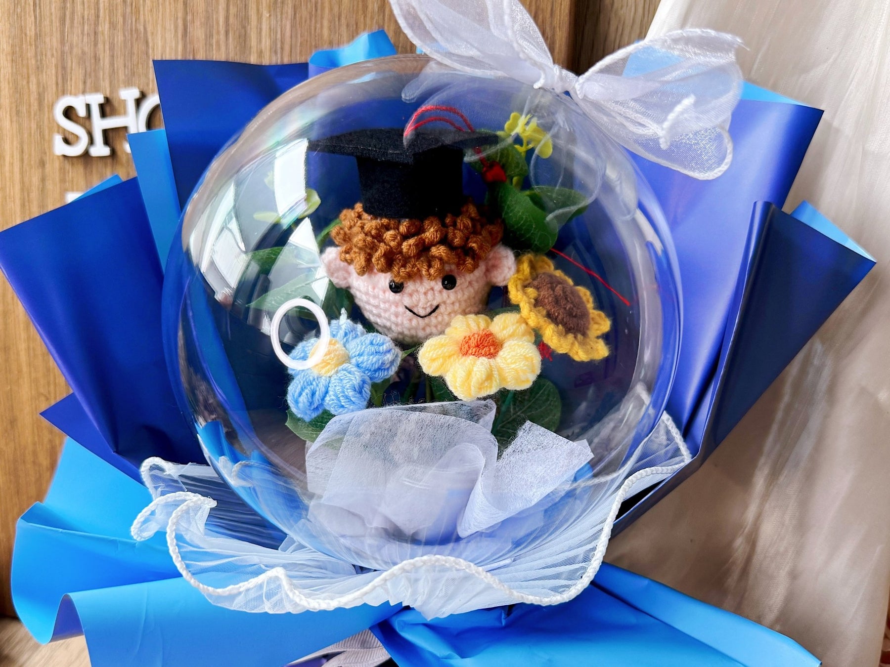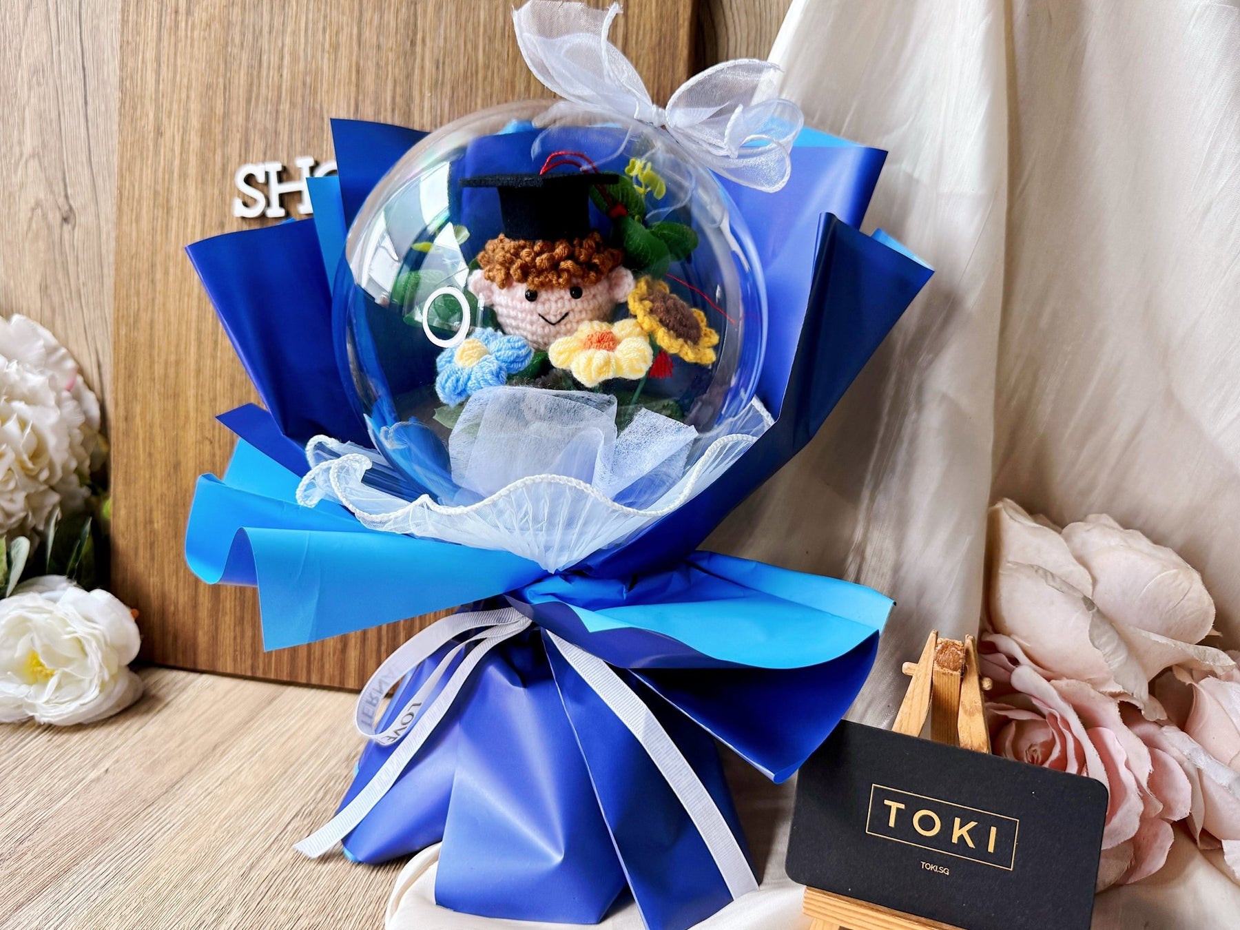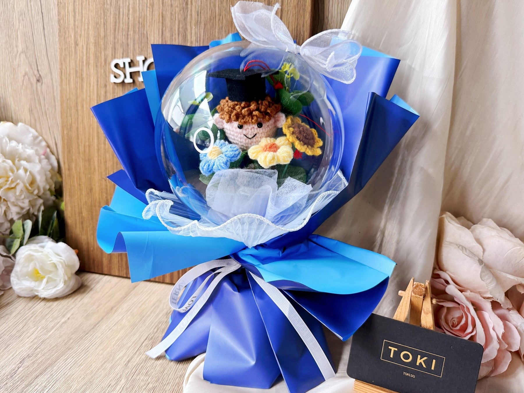 TOKI - "Top Of the Globe!" Crochet Short Hair Graduate Bouquet - Blue, Flowers, Graduation /