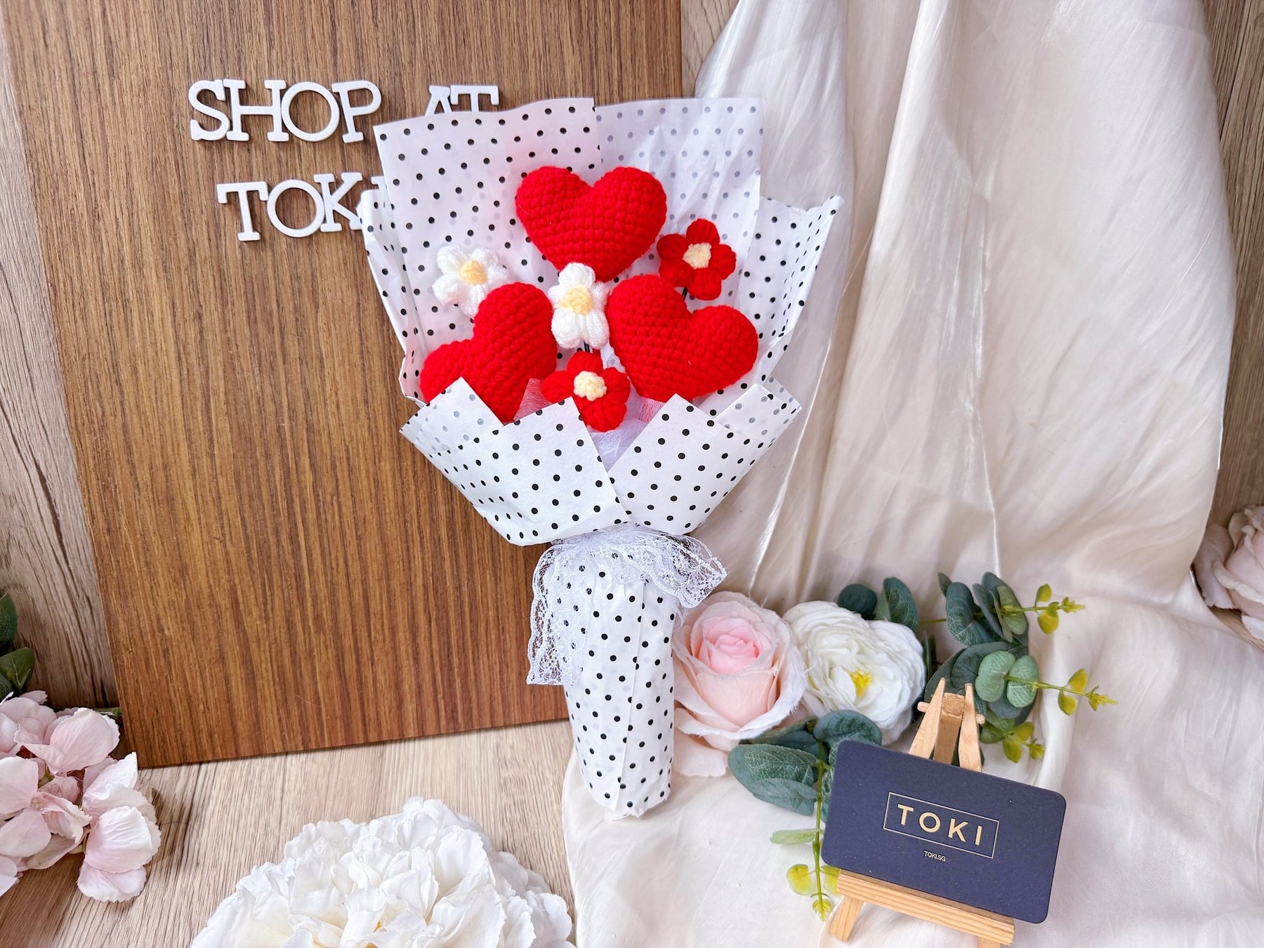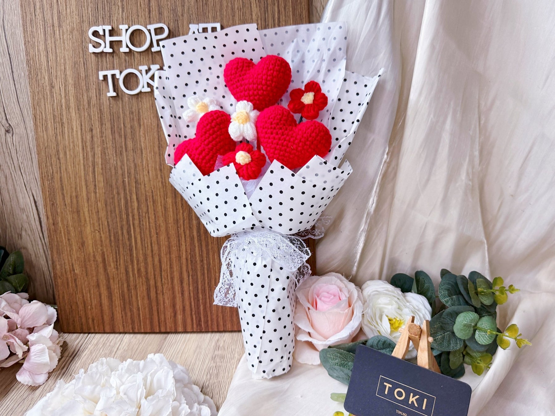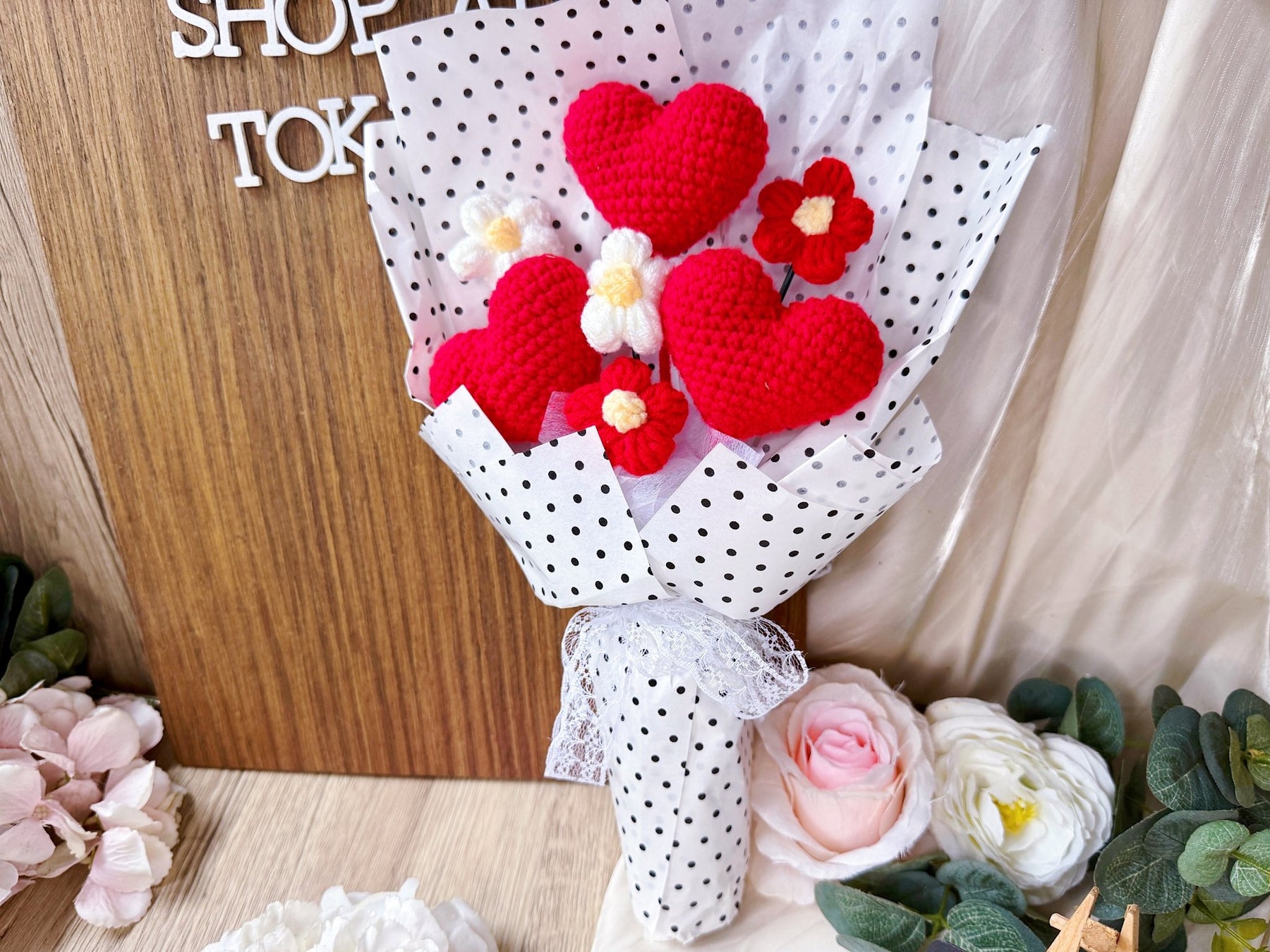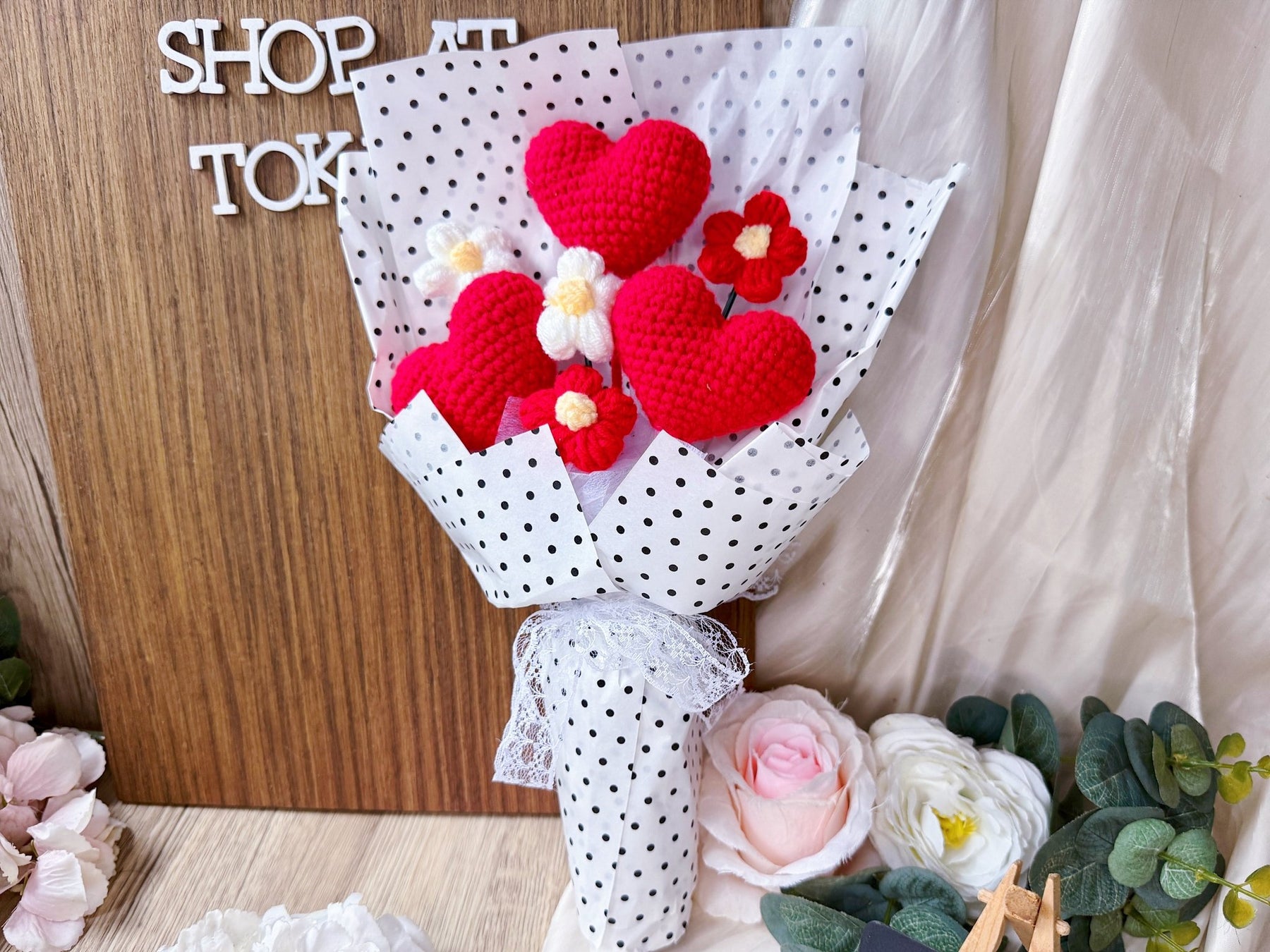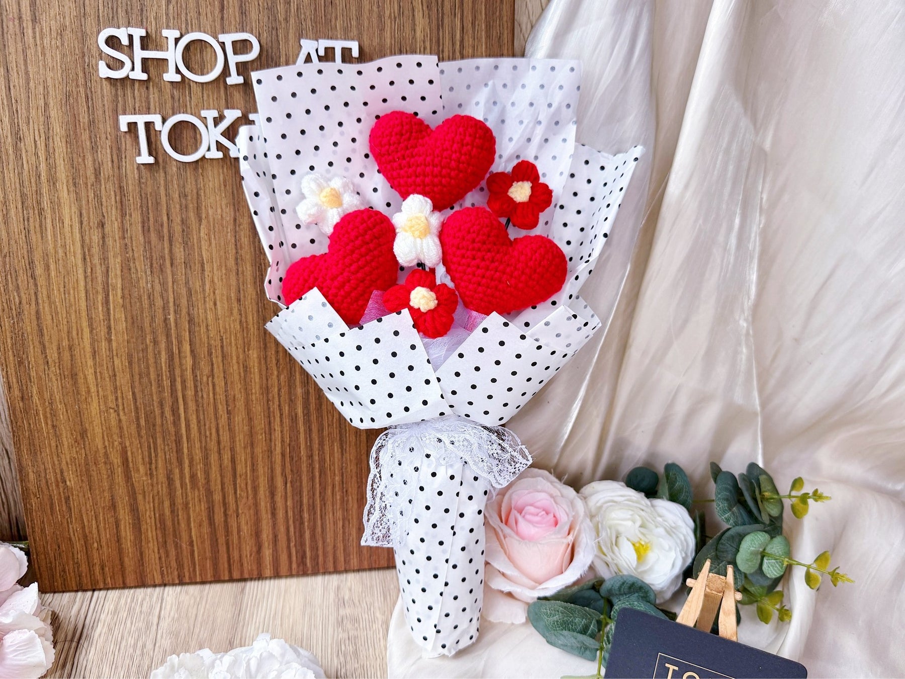 Express your love, gratitude, and appreciation with "With All Of My Heart... & more". This bouquet features not one, but three crochet hearts for a unique and heartfelt gift. Perfect for non-flower lovers, this bouquet is sure to inspire strong emotions and spread love.