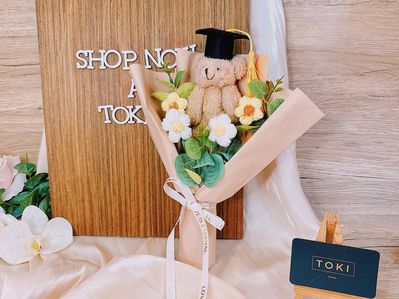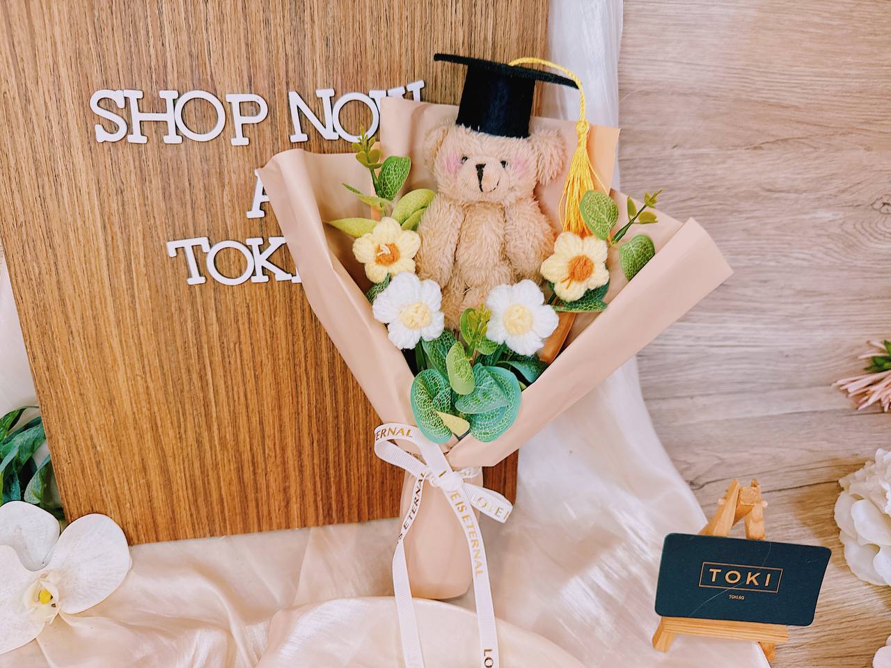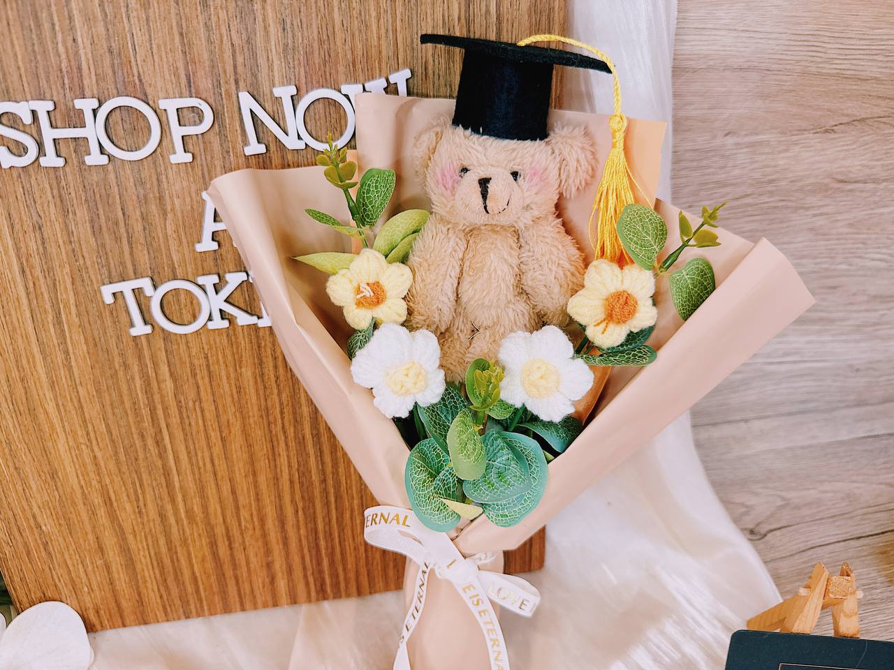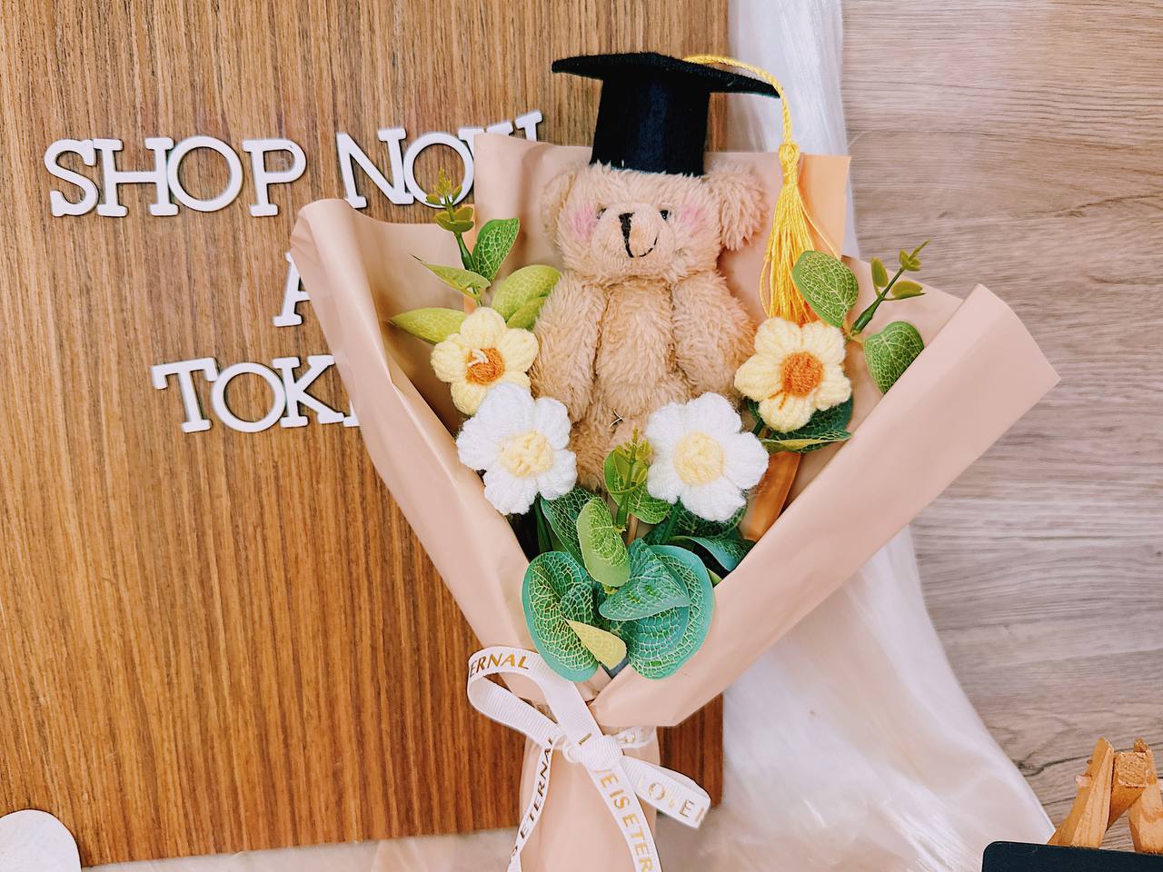 Celebrate your graduation with our adorable graduation bear! This small and affordable bouquet includes 4 small crochet flowers for a touch of beauty. Perfect for any graduation celebration, this bear is sure to bring joy and commemorate this special milestone.