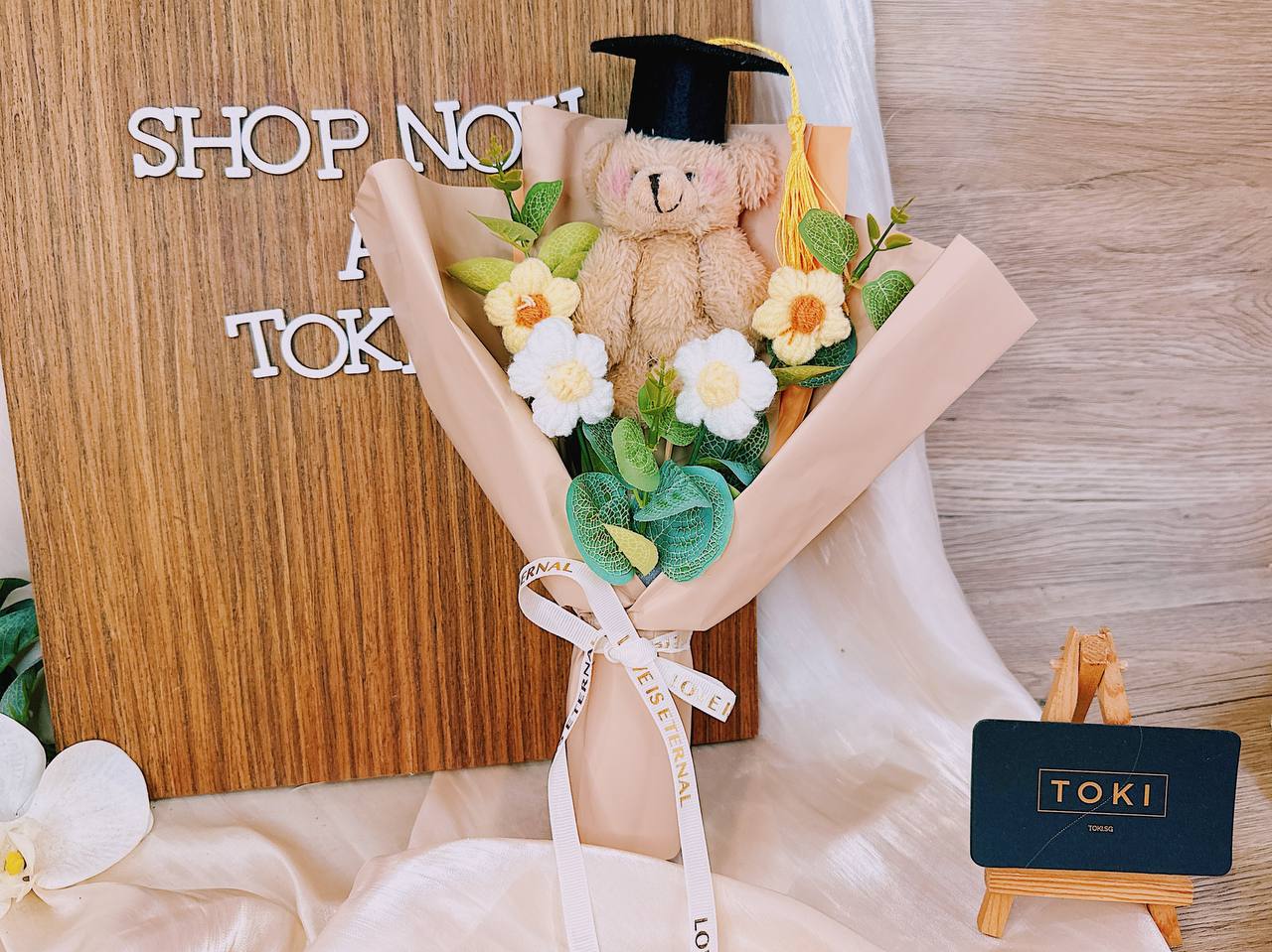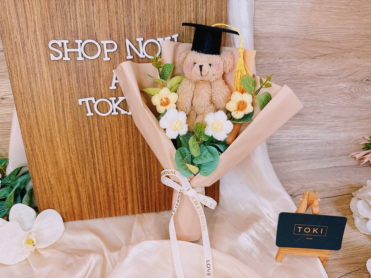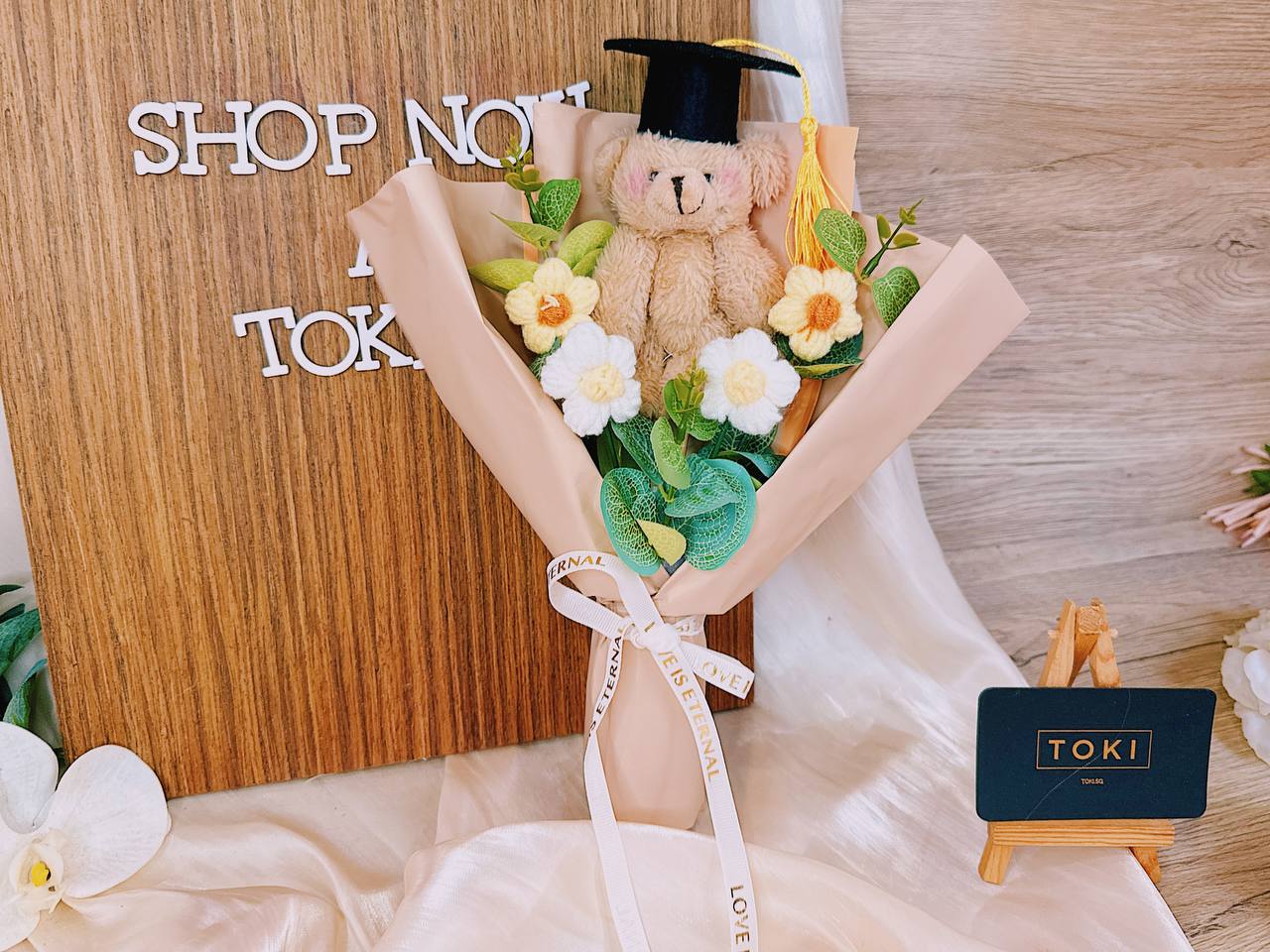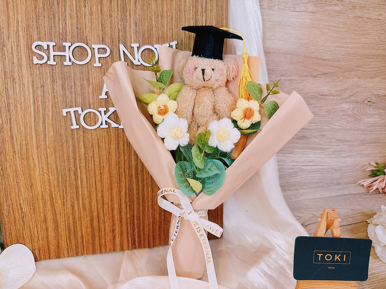 Celebrate your graduation with our adorable graduation bear! This small and affordable bouquet includes 4 small crochet flowers for a touch of beauty. Perfect for any graduation celebration, this bear is sure to bring joy and commemorate this special milestone.