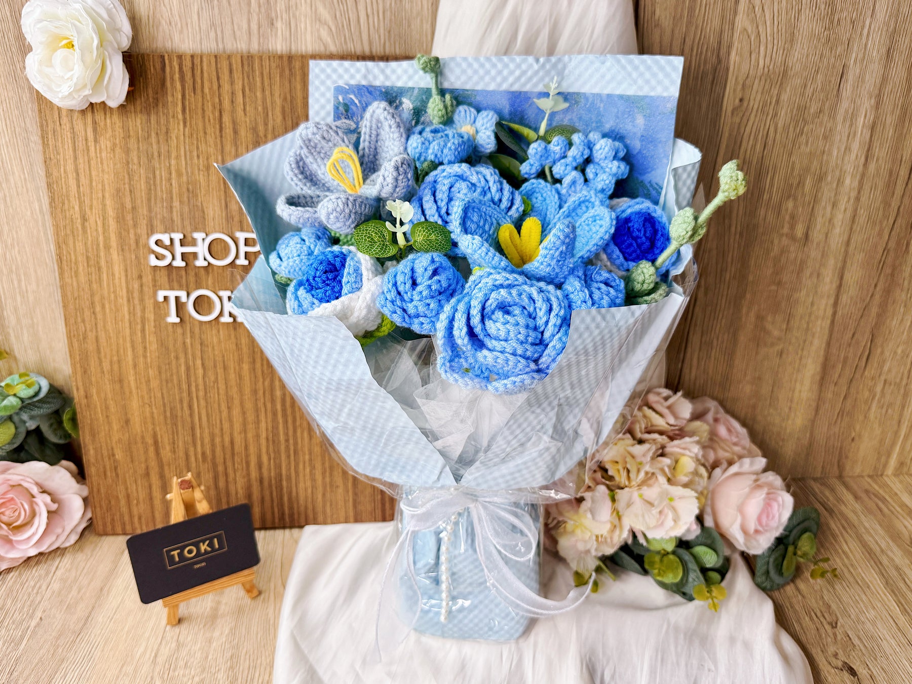 Are you a fan of crochet flowers? This bouquet is tailored for you. It features a mix of different crochet flowers in a complementary color scheme. This unique arrangement is sure to surprise and make a lasting impression. Ideal for photos and ceremonies, it's a versatile choice for various occasions