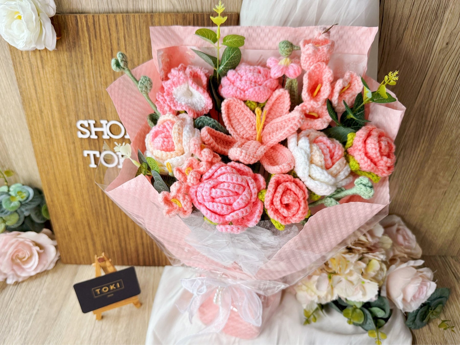 Are you a fan of crochet flowers? This bouquet is tailored for you. It features a mix of different crochet flowers in a complementary color scheme. This unique arrangement is sure to surprise and make a lasting impression. Ideal for photos and ceremonies, it's a versatile choice for various occasions