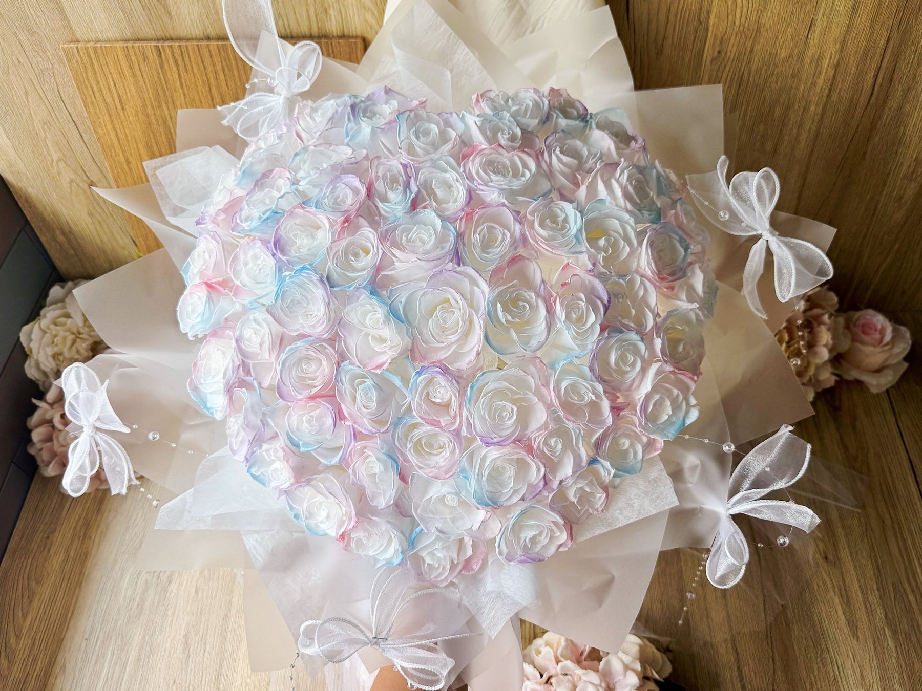 Elegantly wrapped in ballerina style, this heart bouquet features 52 preserved roses in enchanting aurora hues. Soft pinks, serene blues, and silky purple blend beautifully. Perfect for grand gestures of love, celebration, or admiration. This timeless keepsake won't fade, ideal for anniversaries or proposals. Not suited for plush toys.