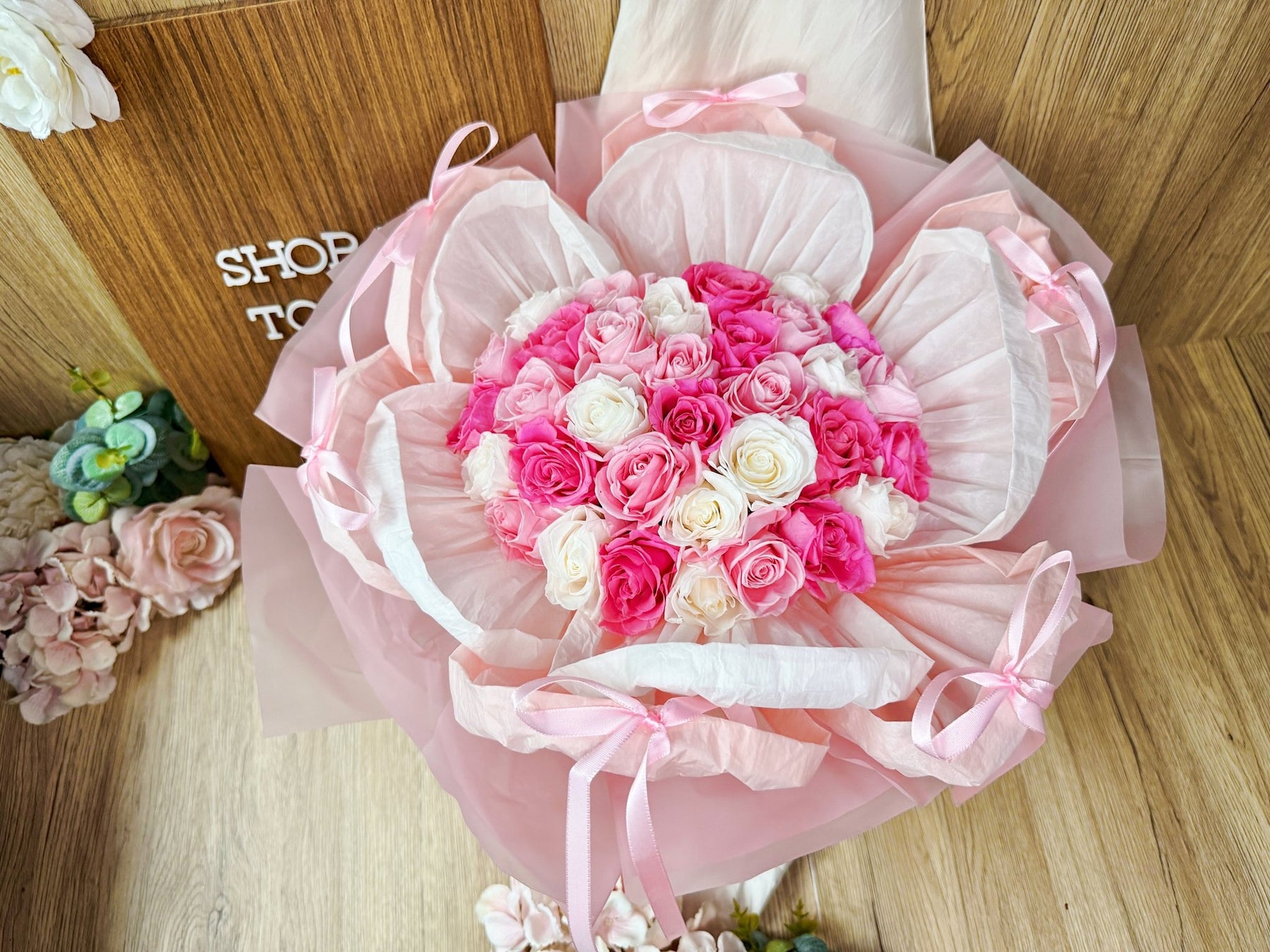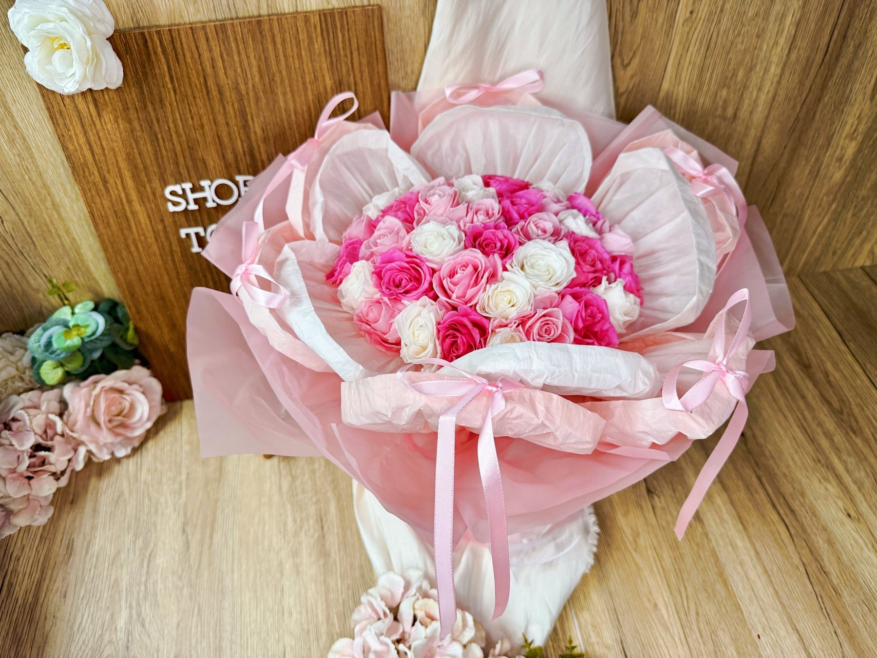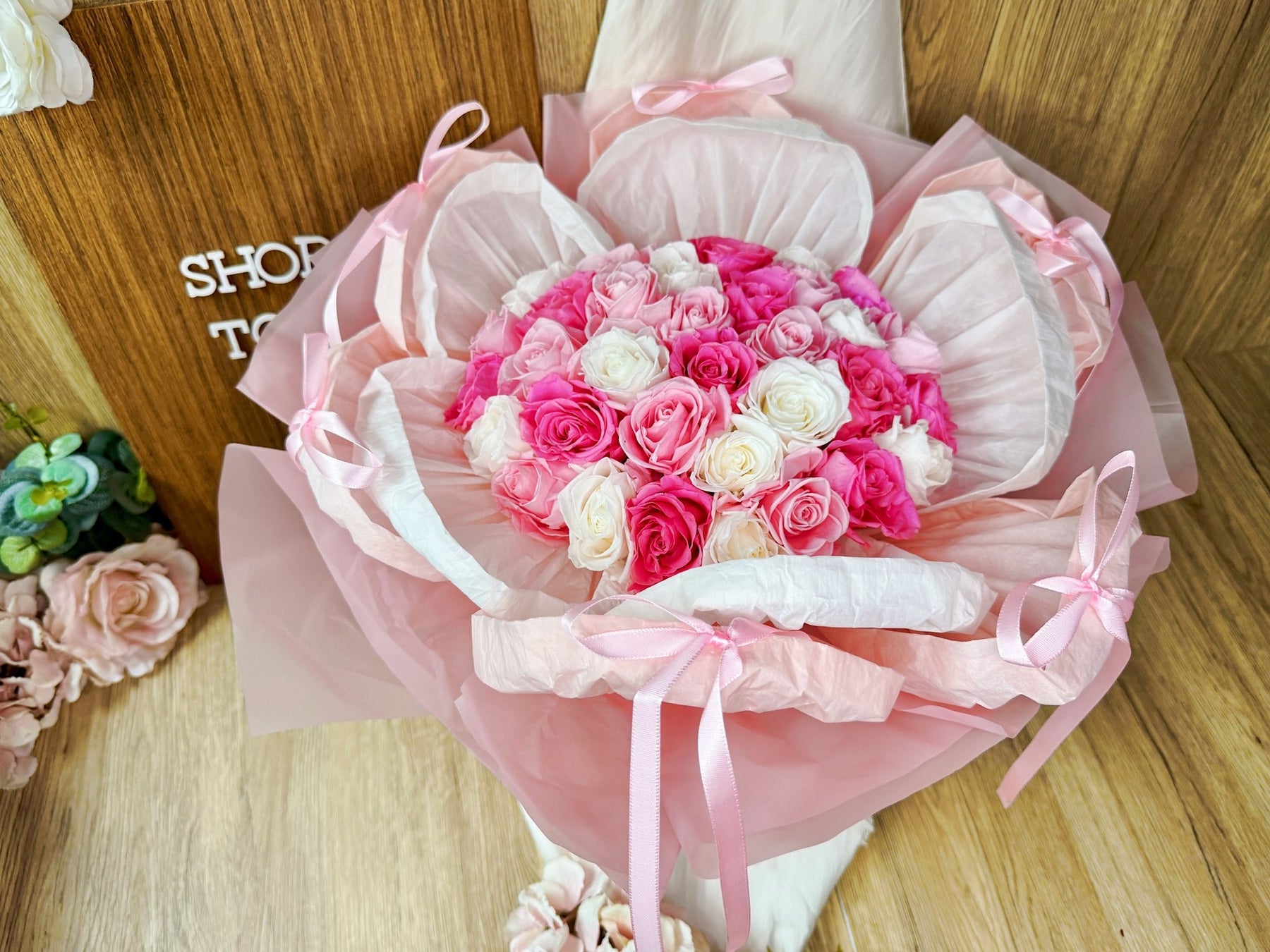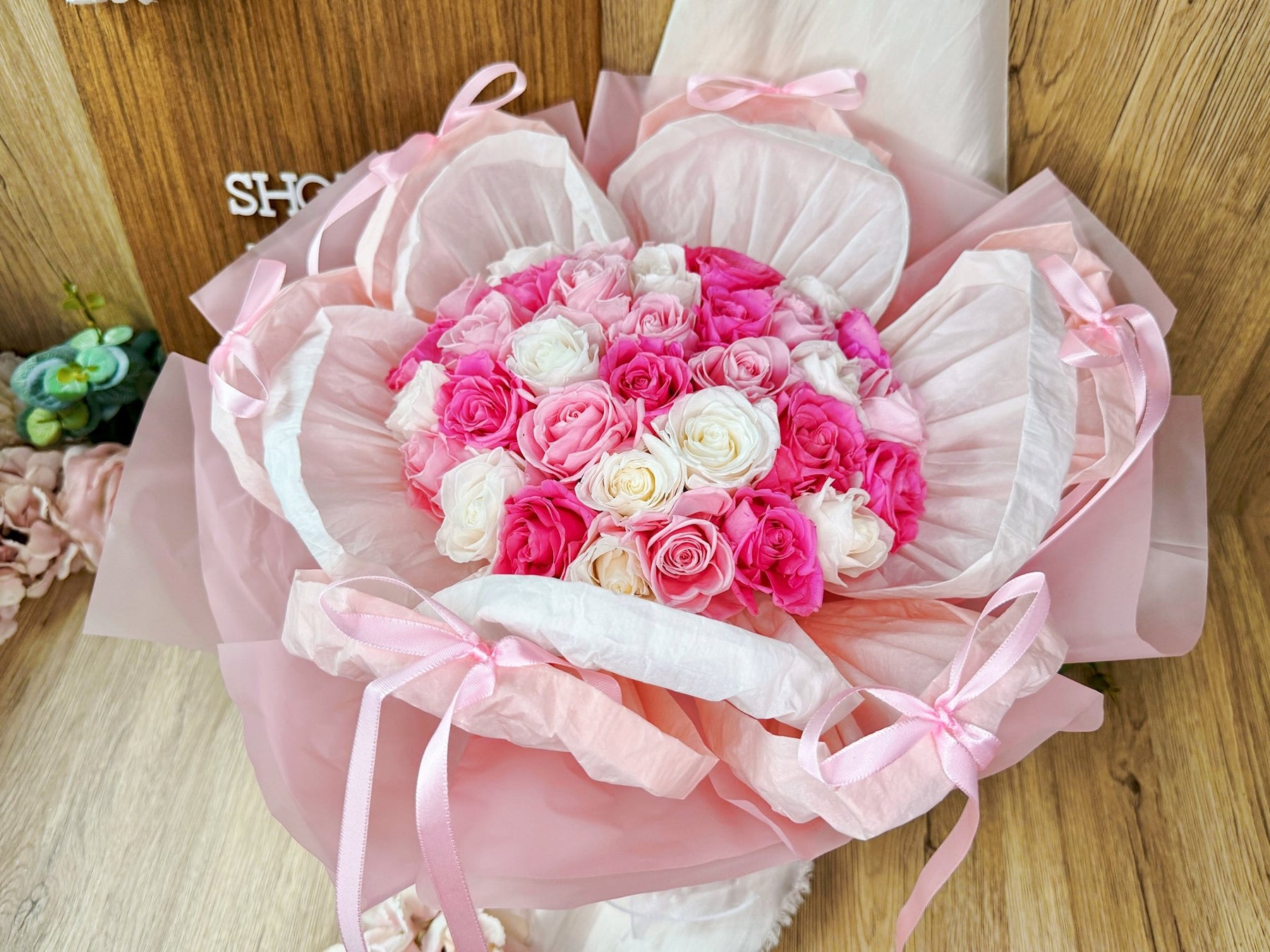 A stunning arrangement of 33 preserved roses in soft pink tones. This exquisite bouquet captures elegance in every petal—vibrant, touchable, and built to last for months without wilting. Whether celebrating a milestone graduation, birthday, anniversary, or cherished moment, this flower-shaped design makes an unforgettable impression. Compact yet commanding attention, it's the perfect gift for someone who values timeless beauty and thoughtful luxury.