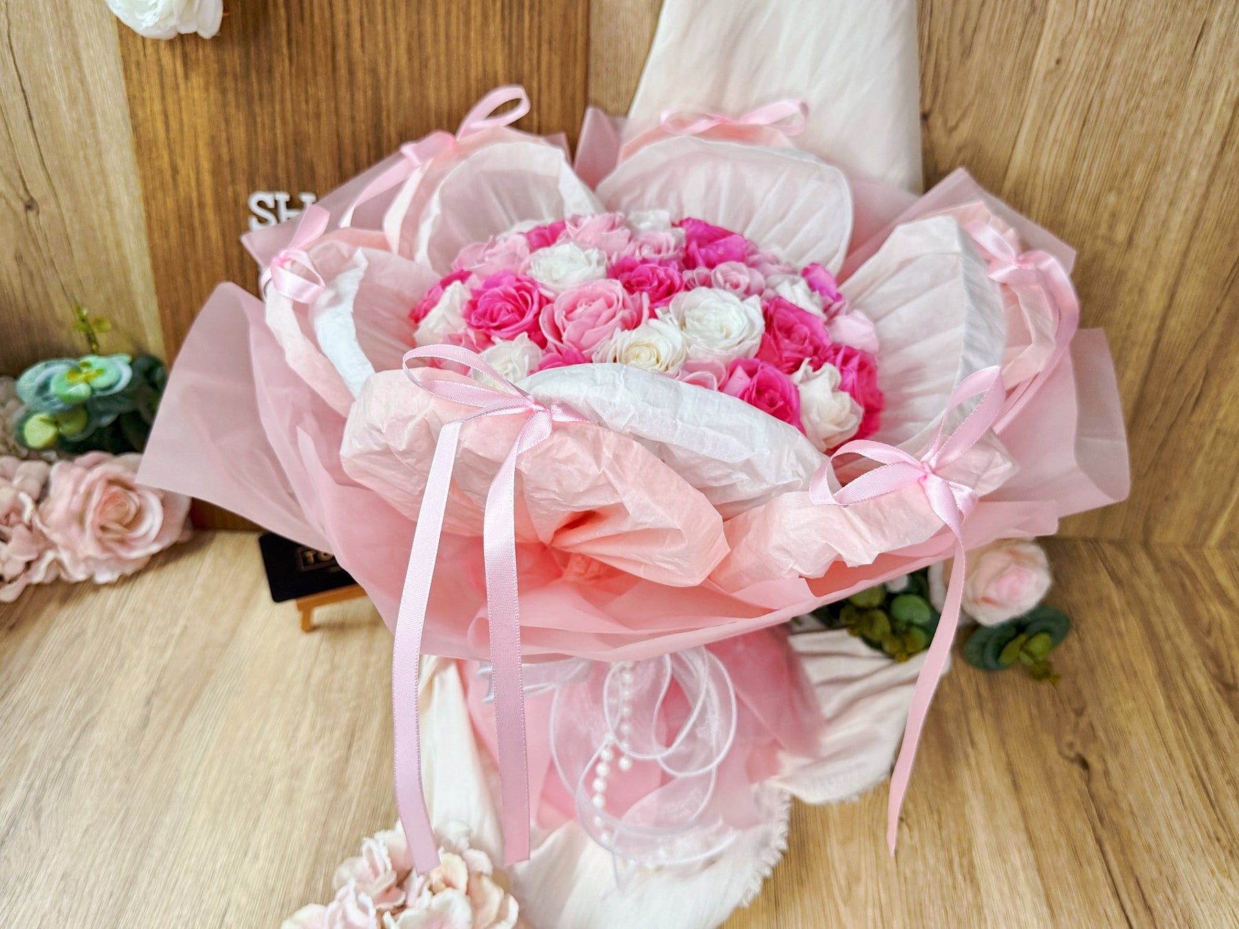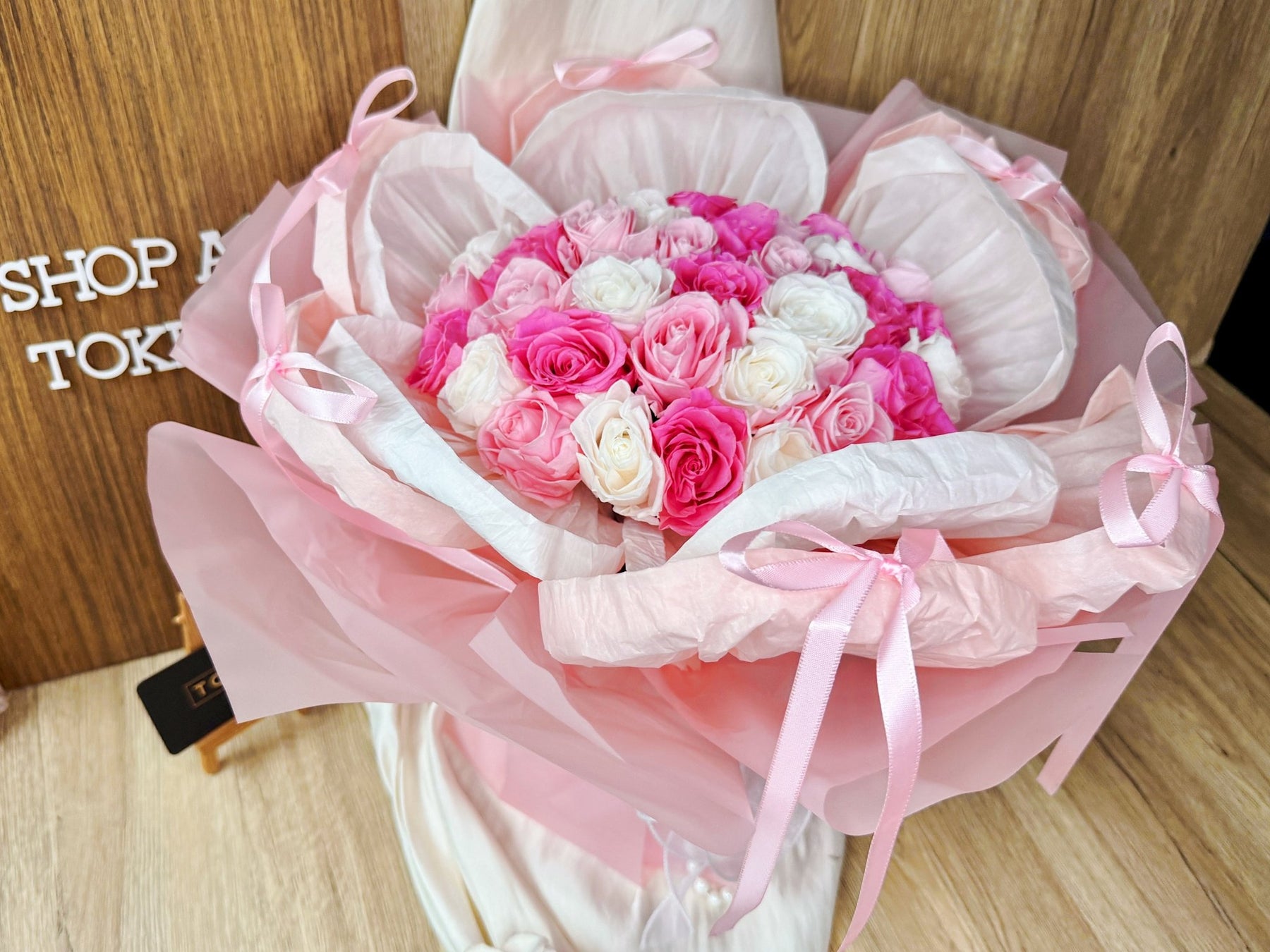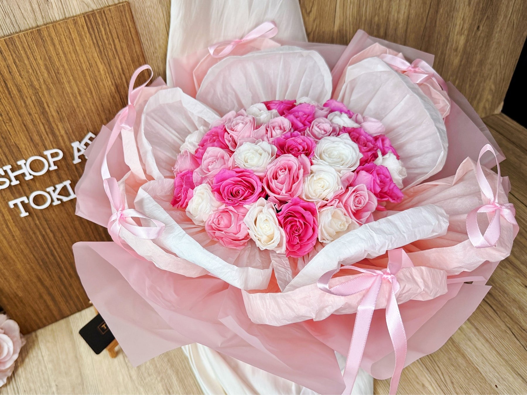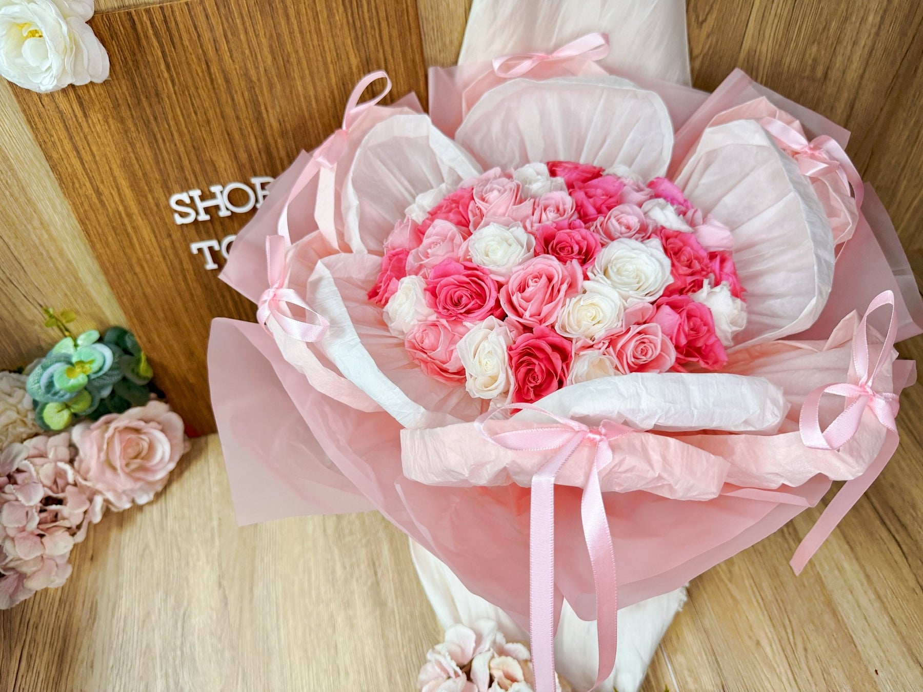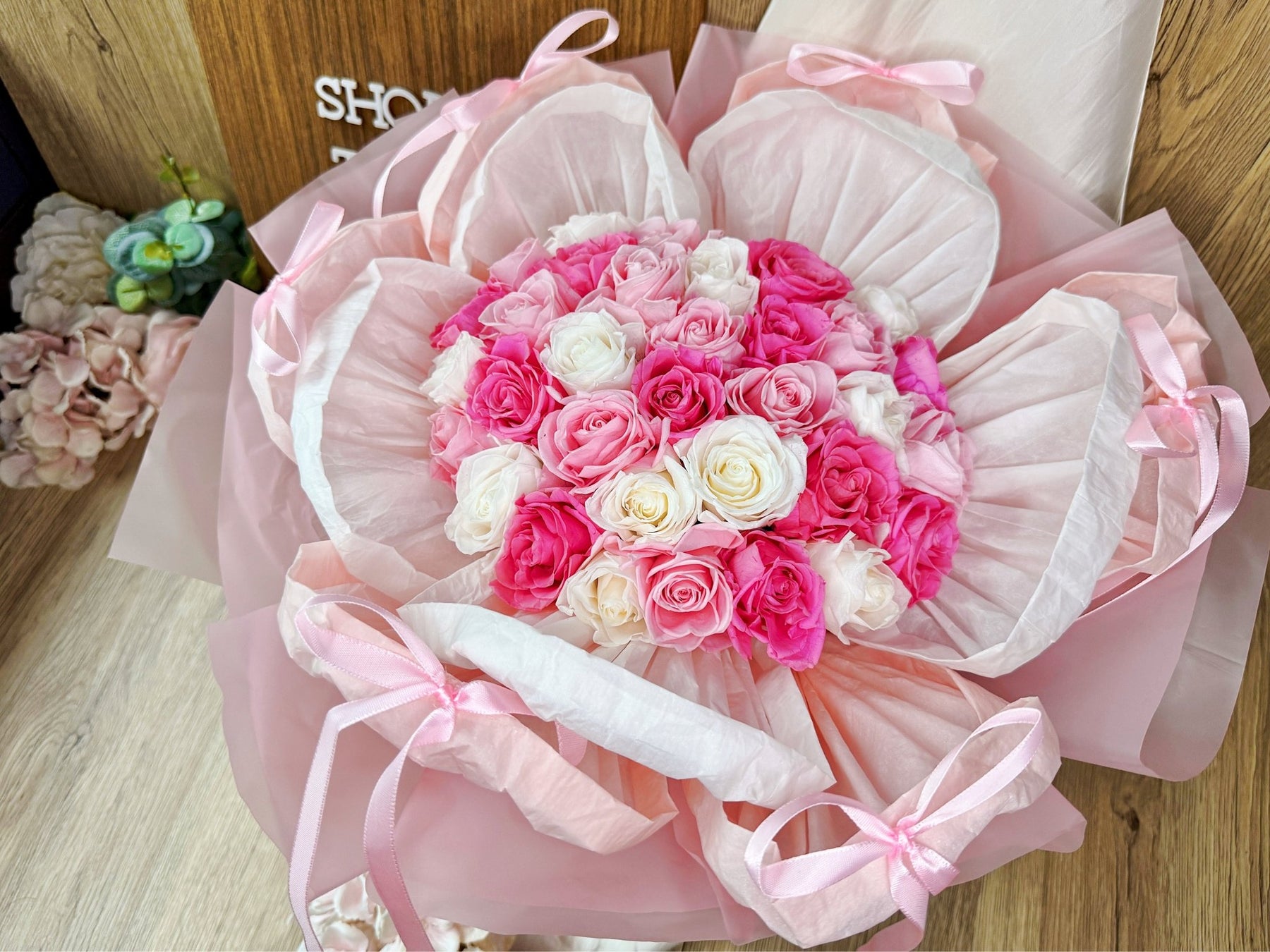 A stunning arrangement of 33 preserved roses in soft pink tones. This exquisite bouquet captures elegance in every petal—vibrant, touchable, and built to last for months without wilting. Whether celebrating a milestone graduation, birthday, anniversary, or cherished moment, this flower-shaped design makes an unforgettable impression. Compact yet commanding attention, it's the perfect gift for someone who values timeless beauty and thoughtful luxury.