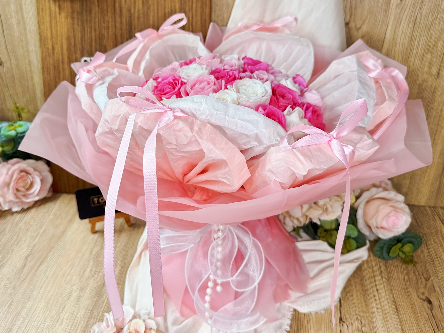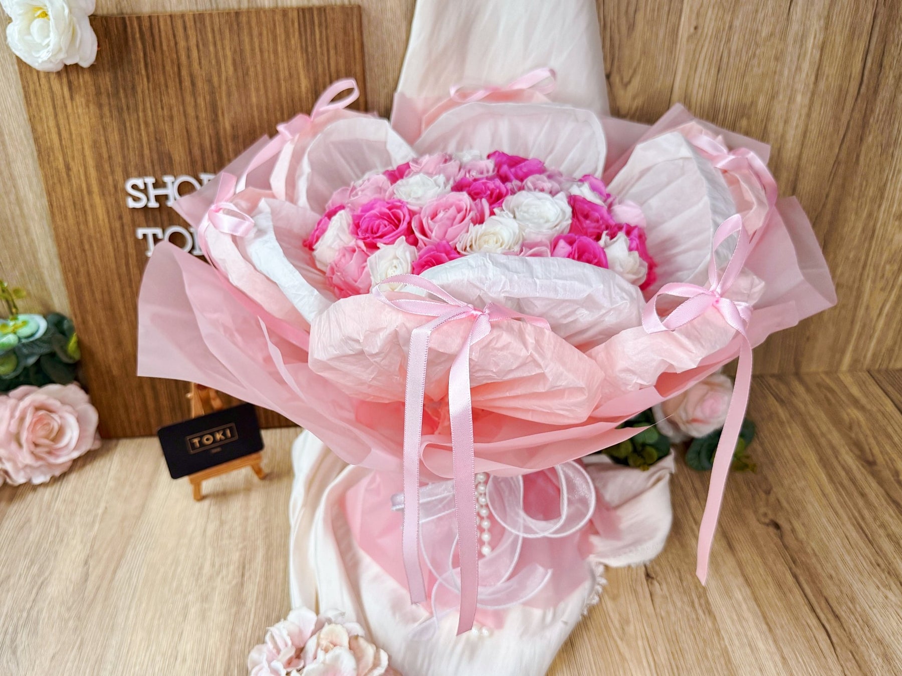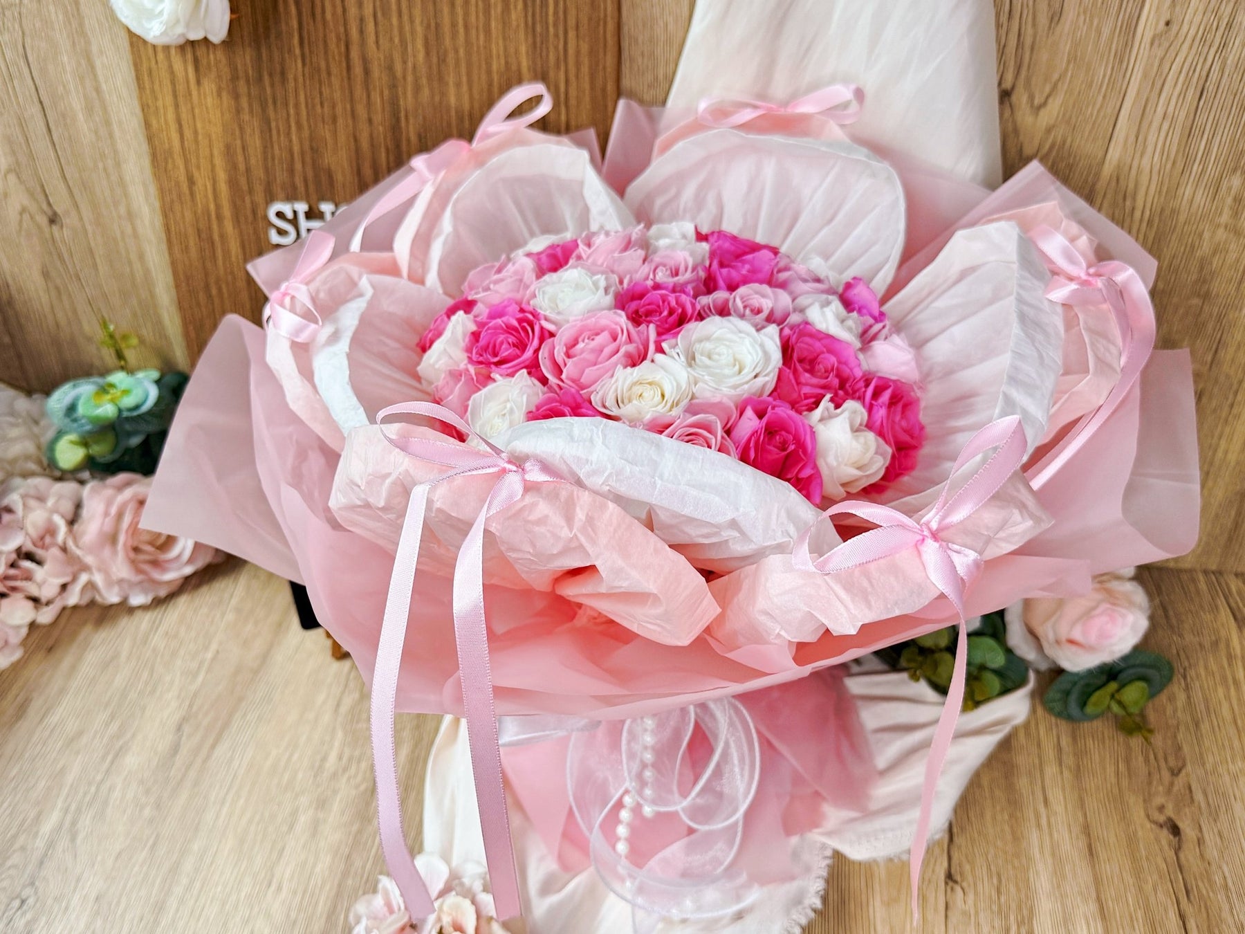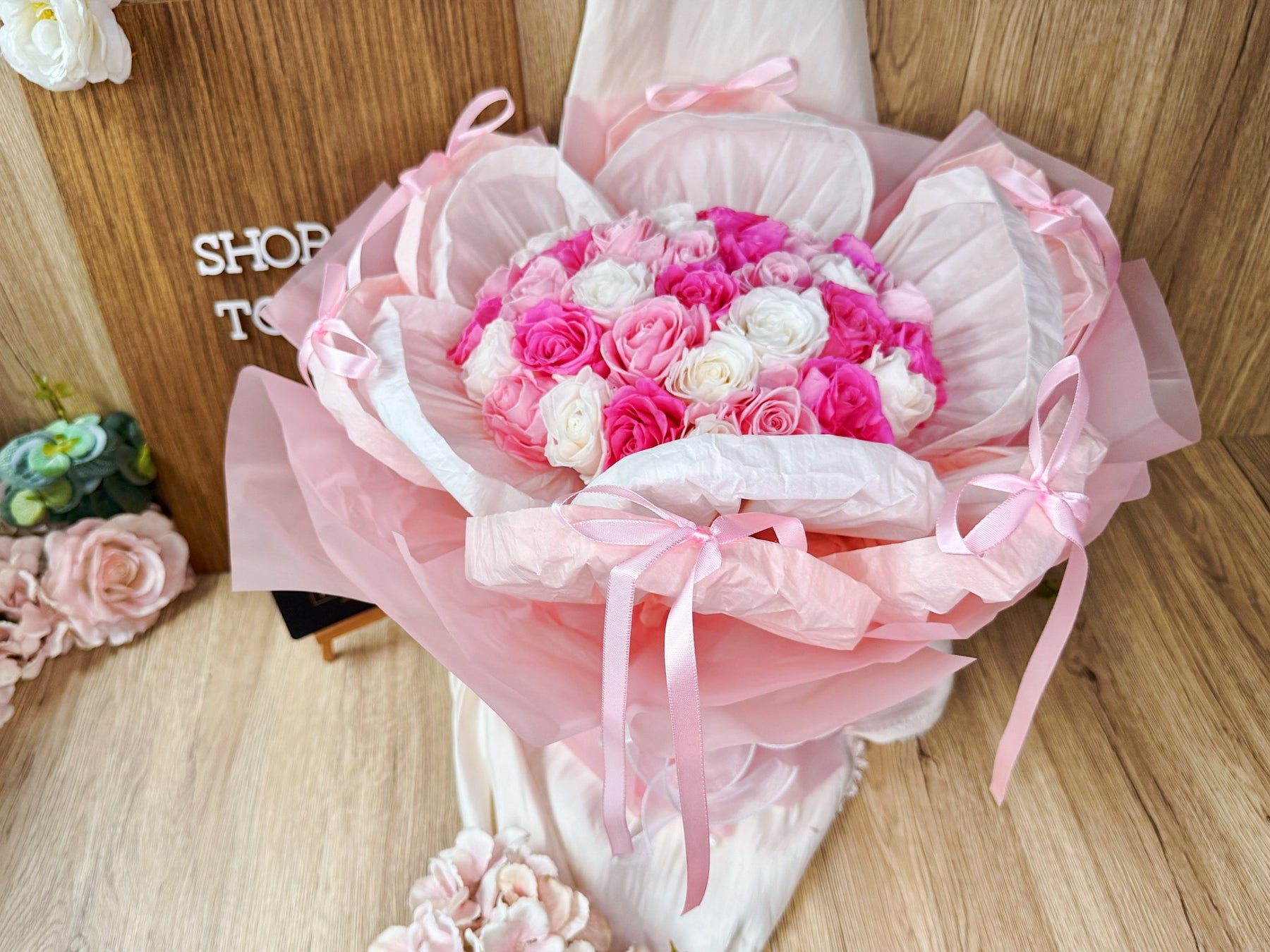 A stunning arrangement of 33 preserved roses in soft pink tones. This exquisite bouquet captures elegance in every petal—vibrant, touchable, and built to last for months without wilting. Whether celebrating a milestone graduation, birthday, anniversary, or cherished moment, this flower-shaped design makes an unforgettable impression. Compact yet commanding attention, it's the perfect gift for someone who values timeless beauty and thoughtful luxury.