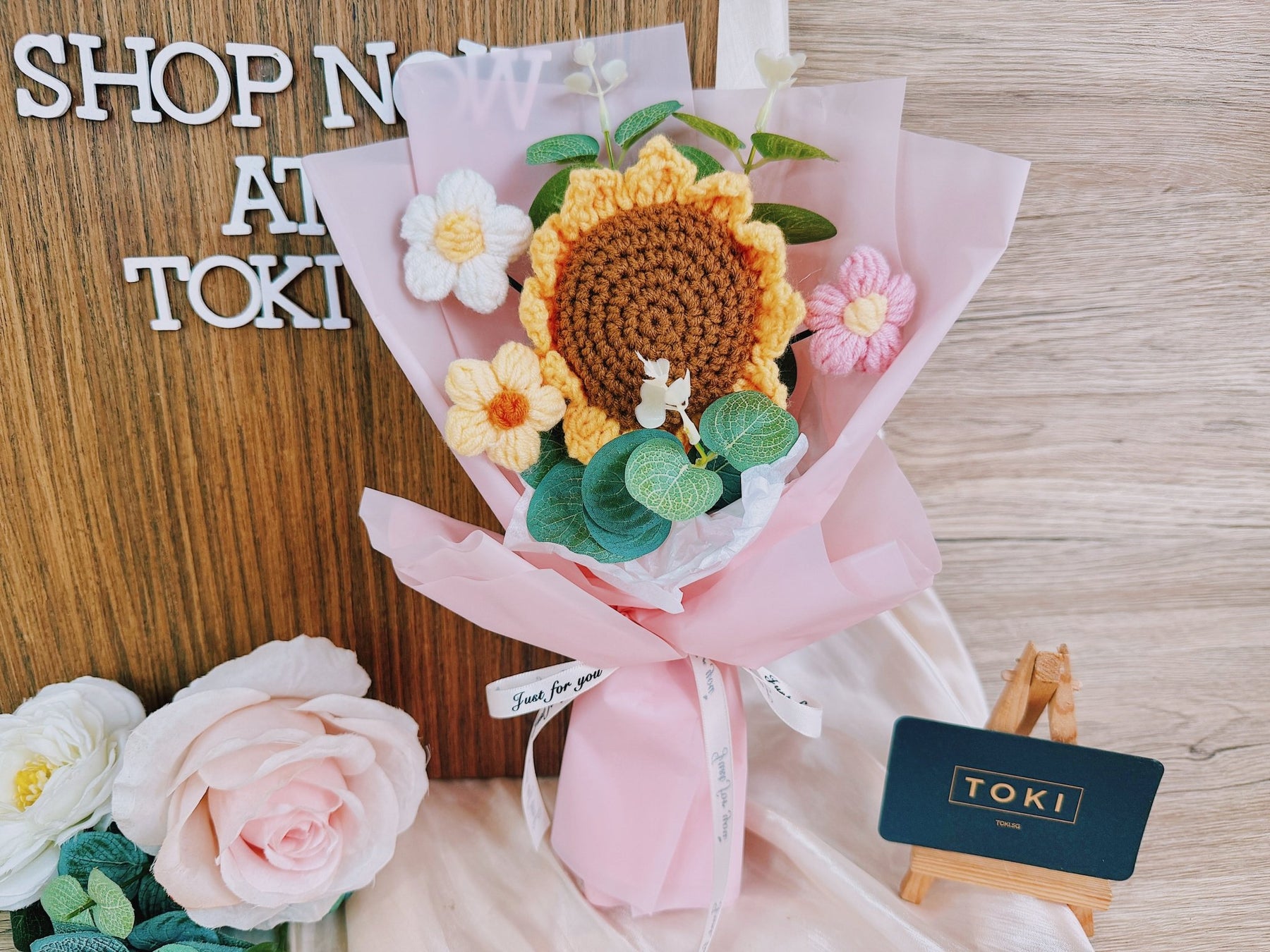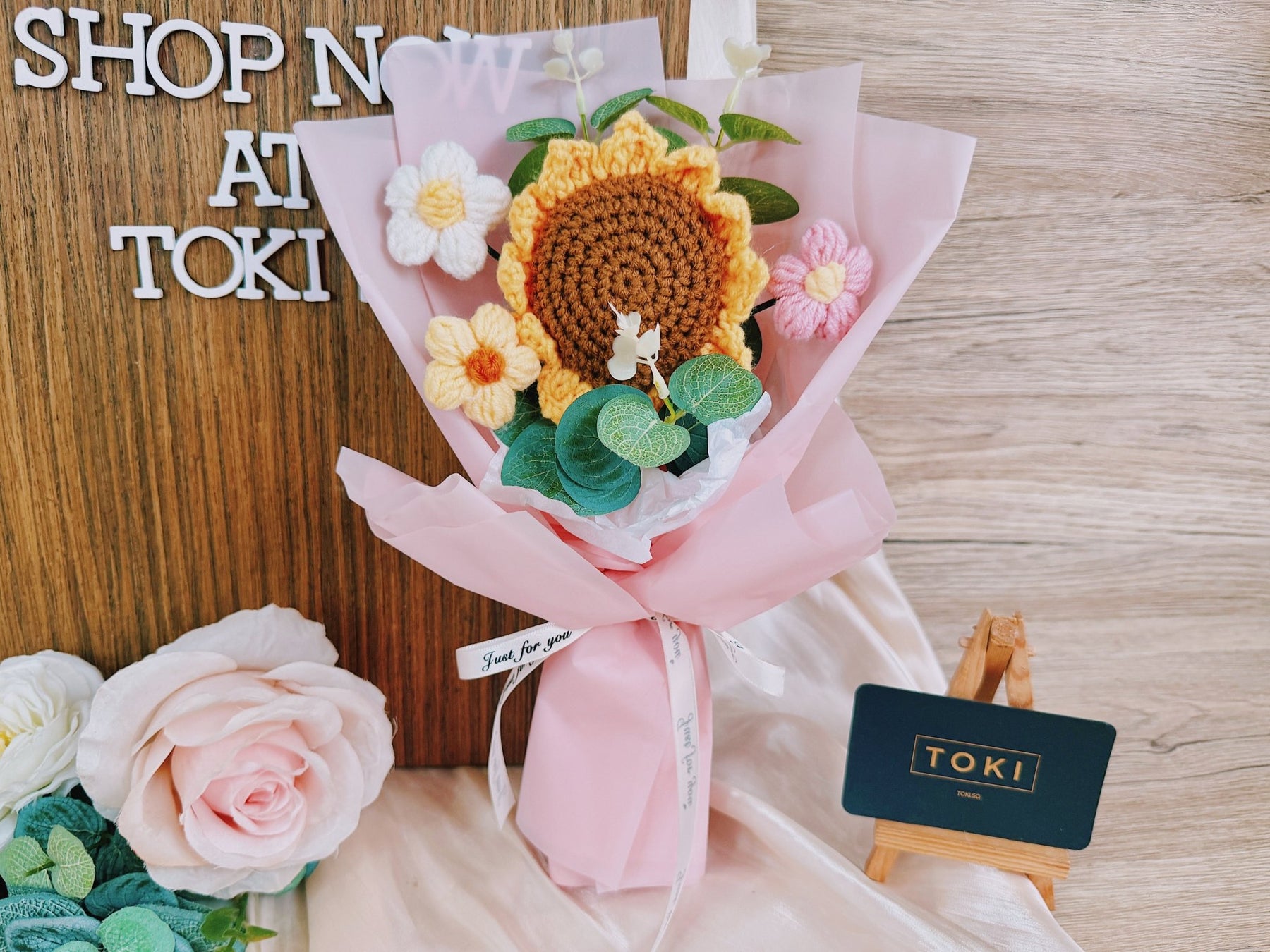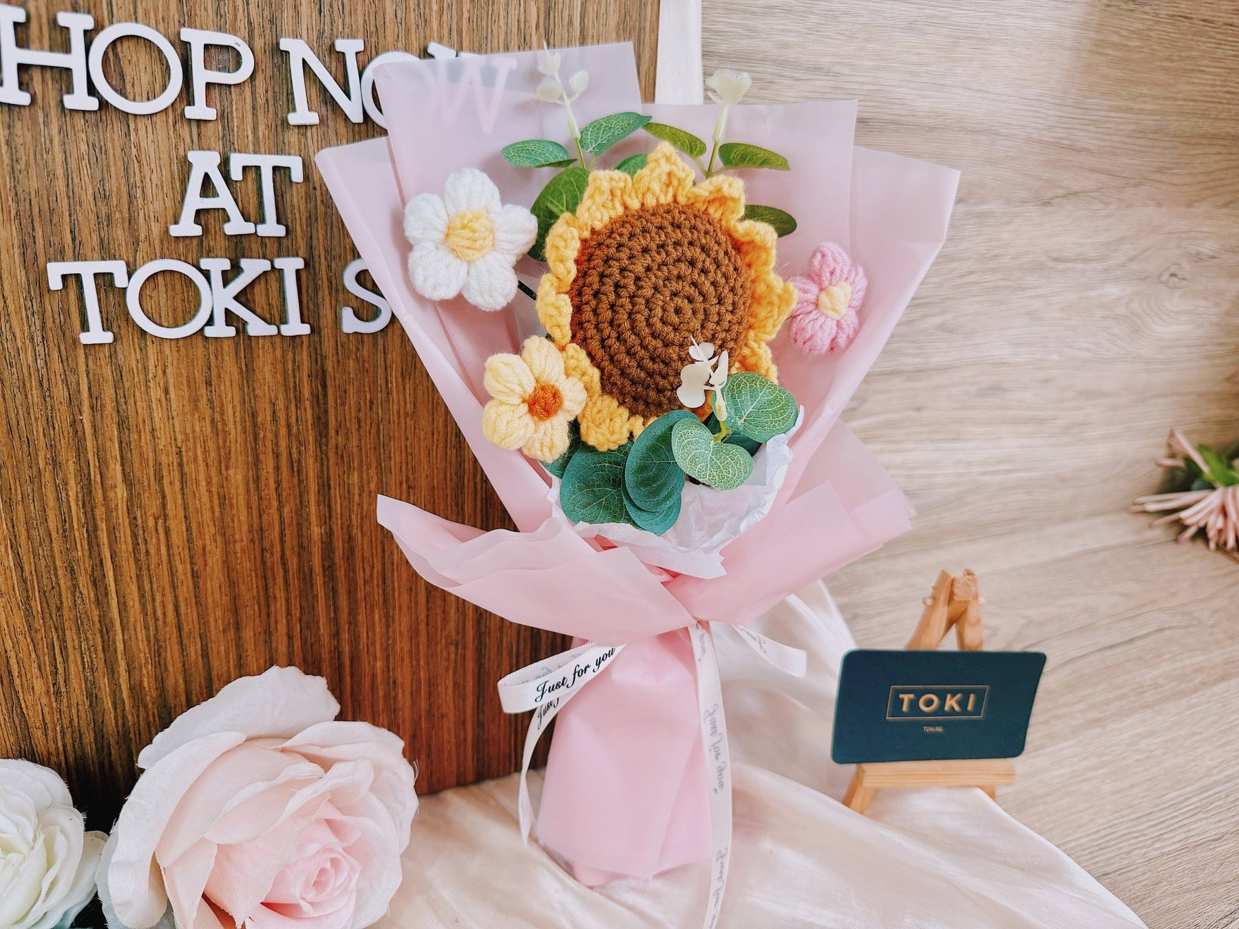 TOKI - 1 Crochet Sunflower + 3 Small Flowers - Pink, Flowers, Graduation /