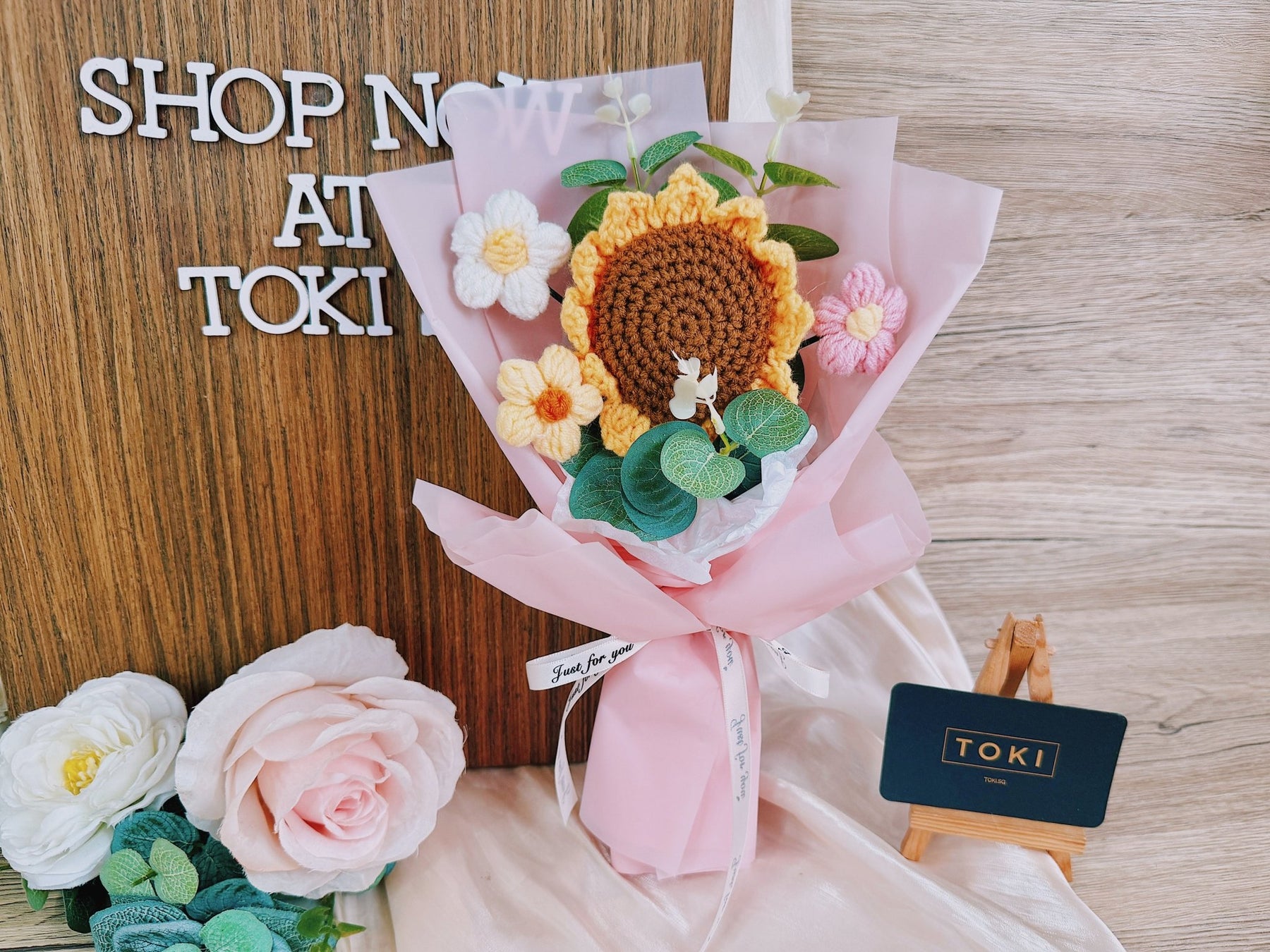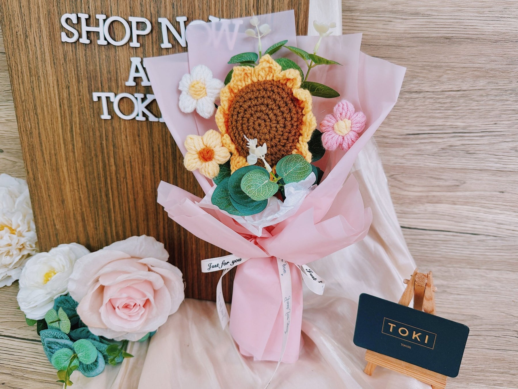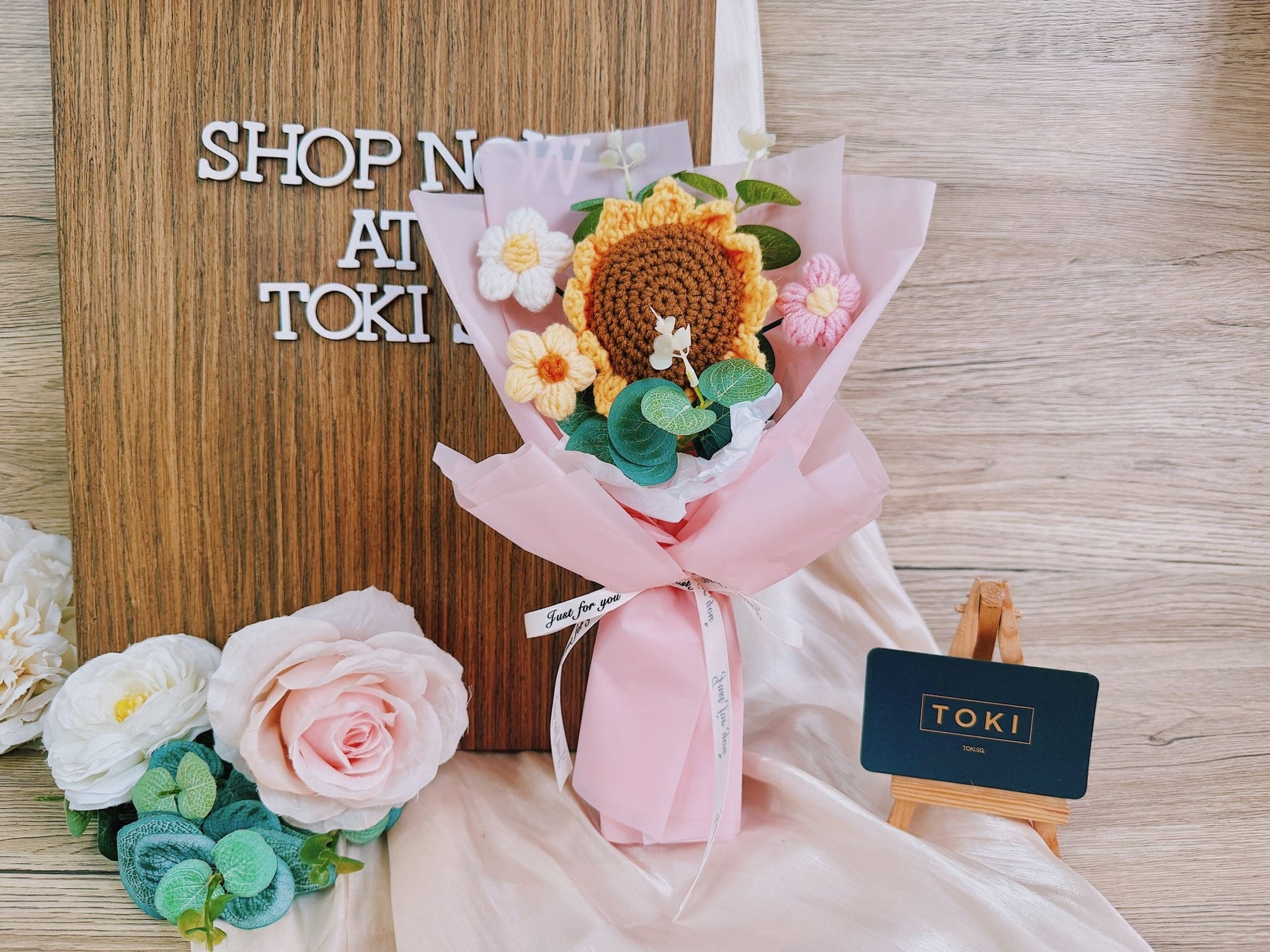 TOKI - 1 Crochet Sunflower + 3 Small Flowers - Pink, Flowers, Graduation /