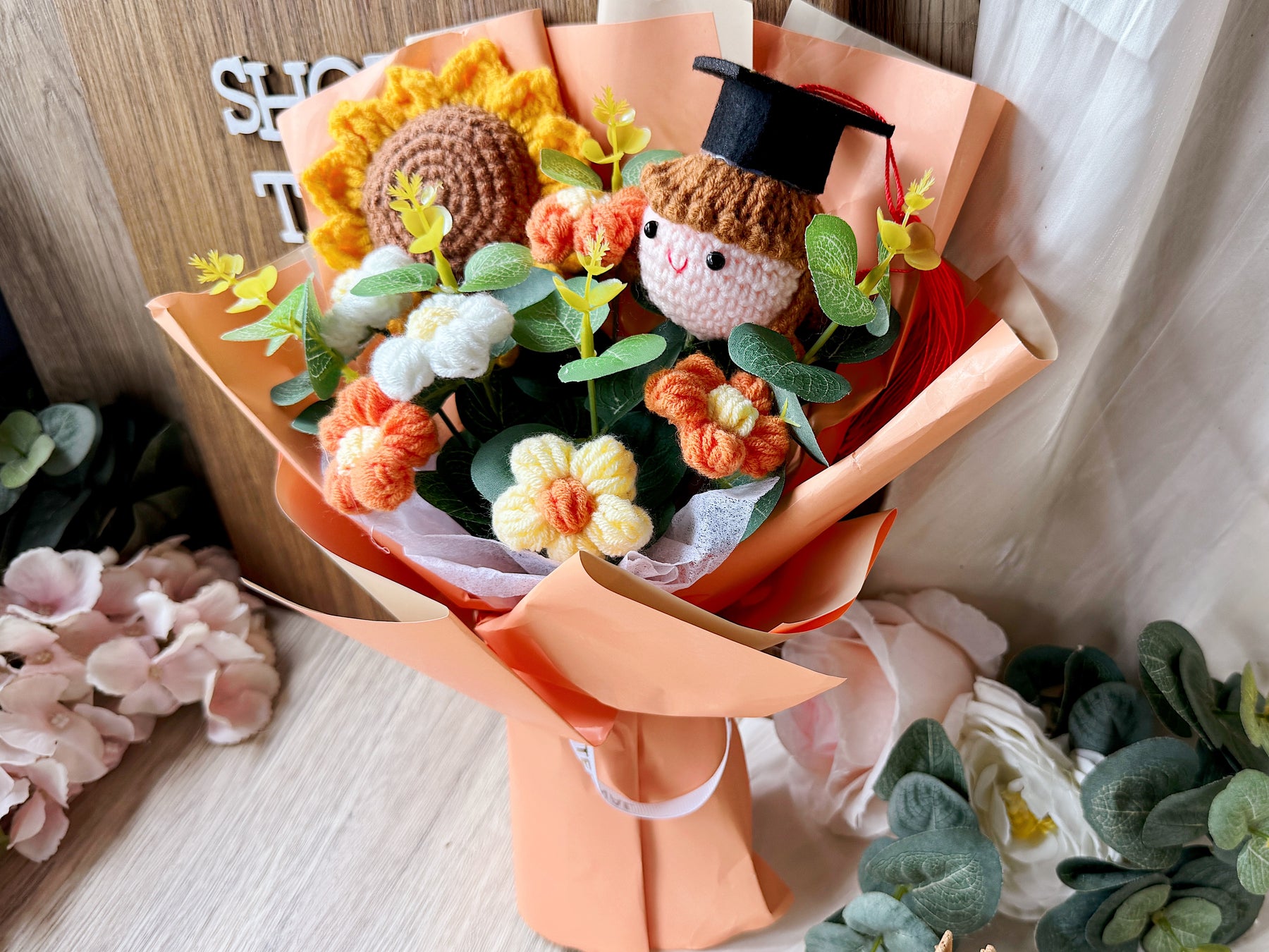 This stunning crochet sunflower bouquet is perfect for celebrating your graduate's special day! The crochet graduate also makes a sweet addition to the display of uniqueness and pride. This unique combination of thoughtful sentiments is sure to make a lasting impression.