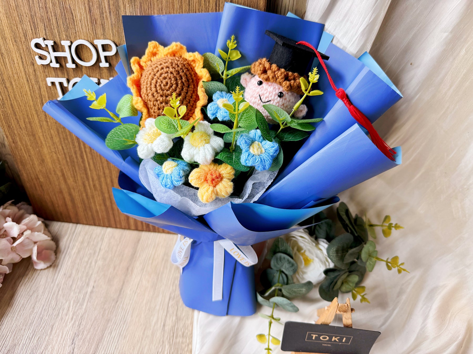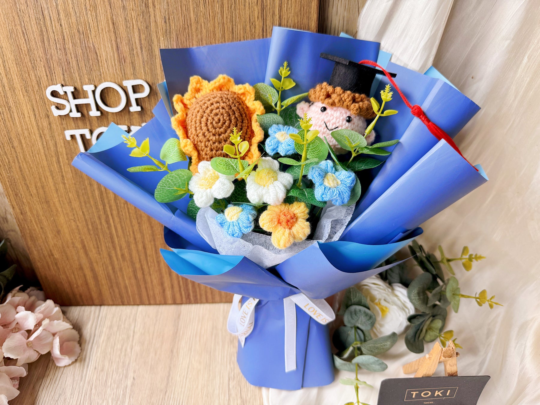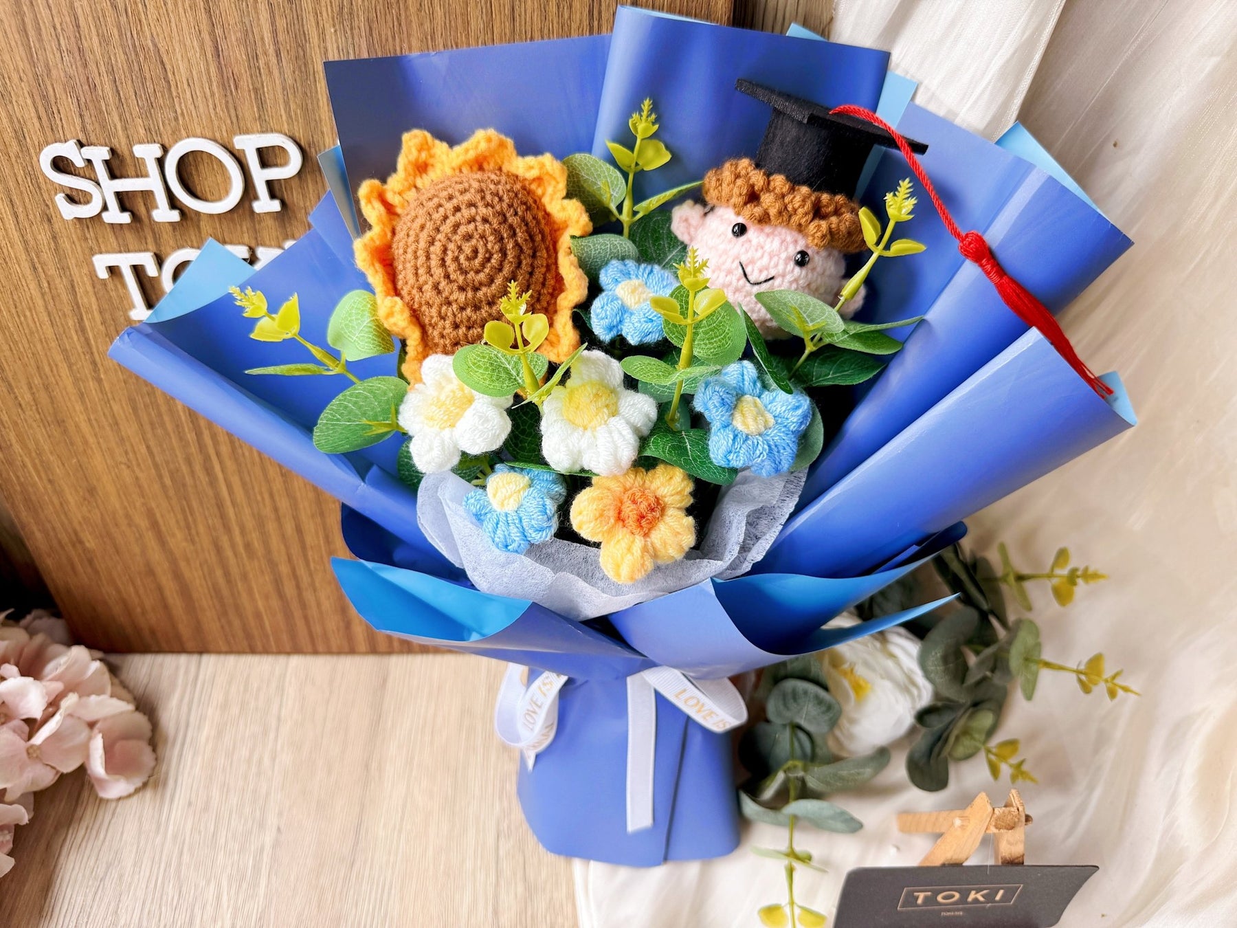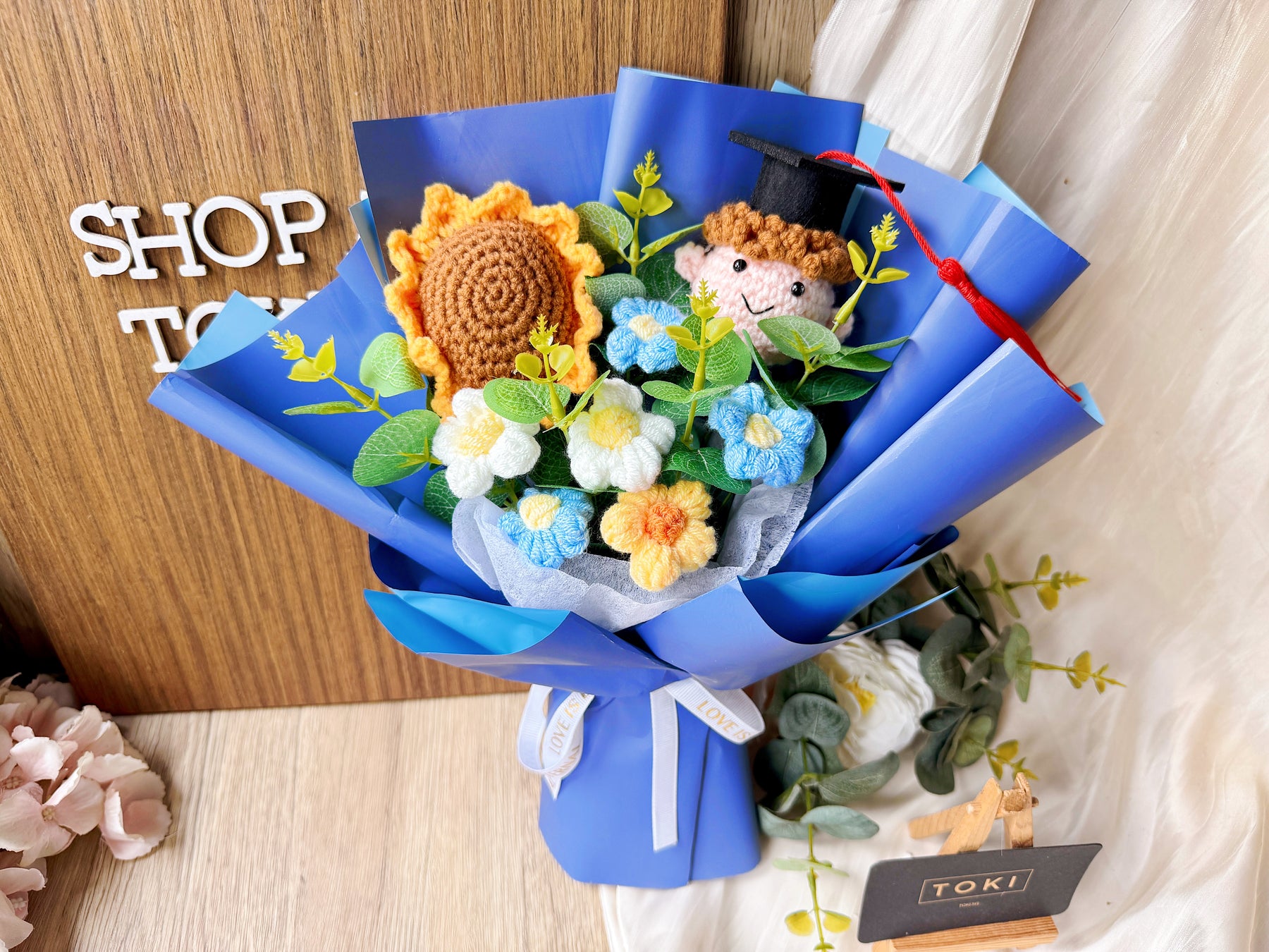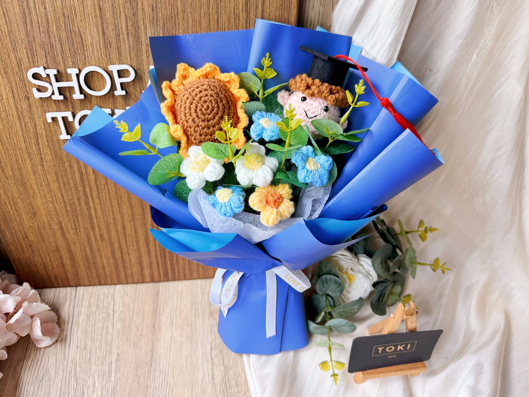 TOKI - 1 Crochet Sunflower Graduation Bouquet with Short Hair Graduate - Blue, Flowers, Graduation /