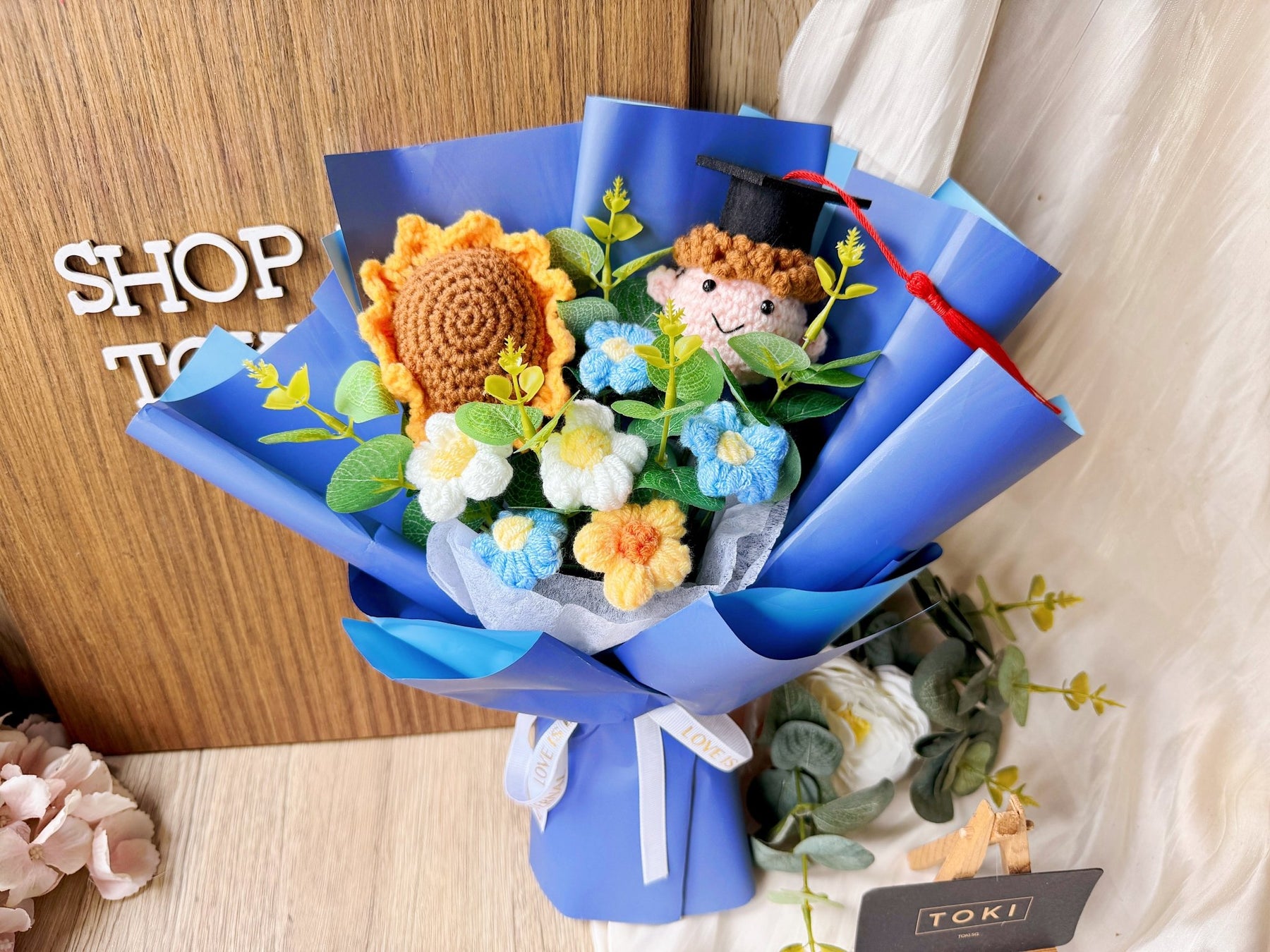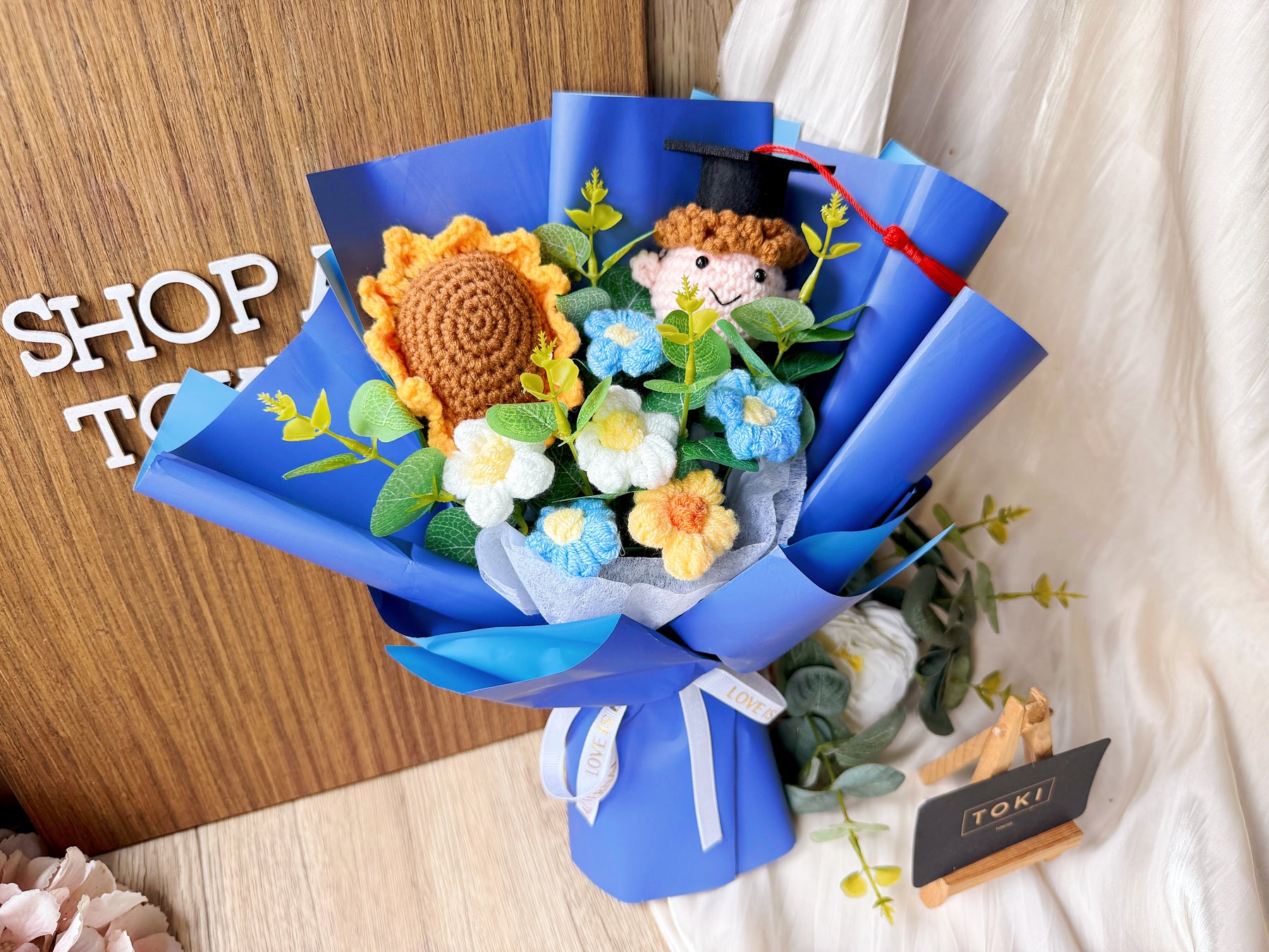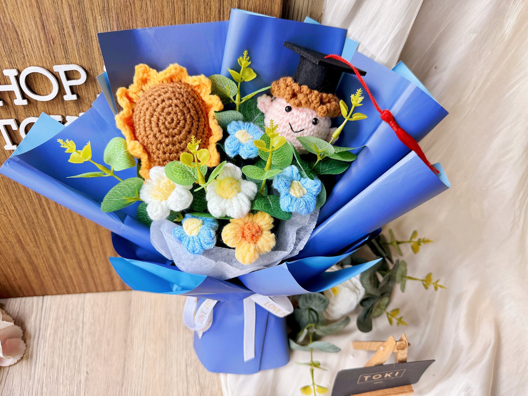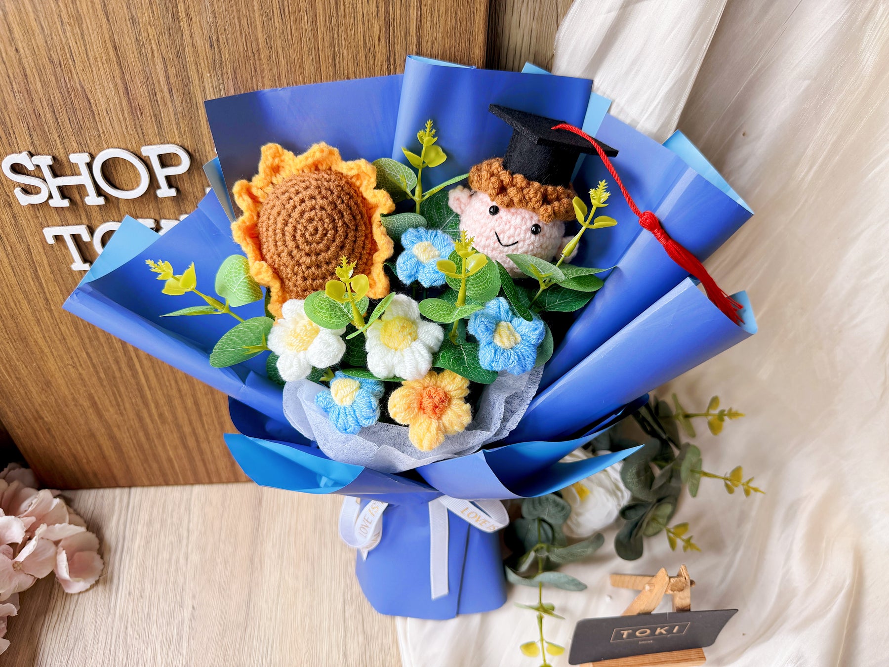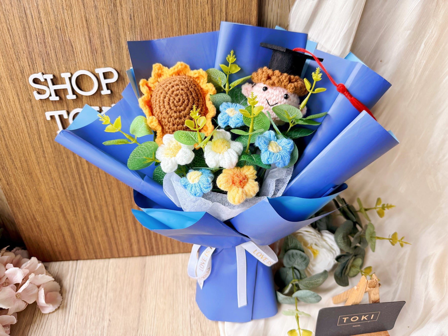 TOKI - 1 Crochet Sunflower Graduation Bouquet with Short Hair Graduate - Blue, Flowers, Graduation /