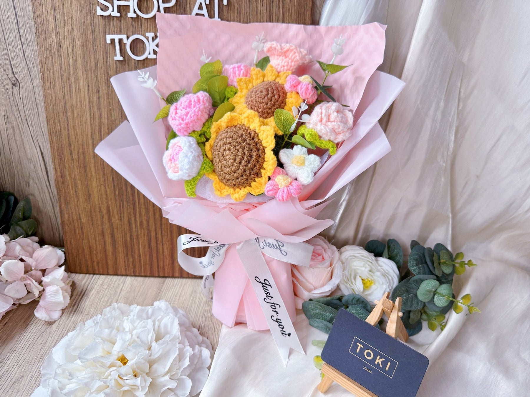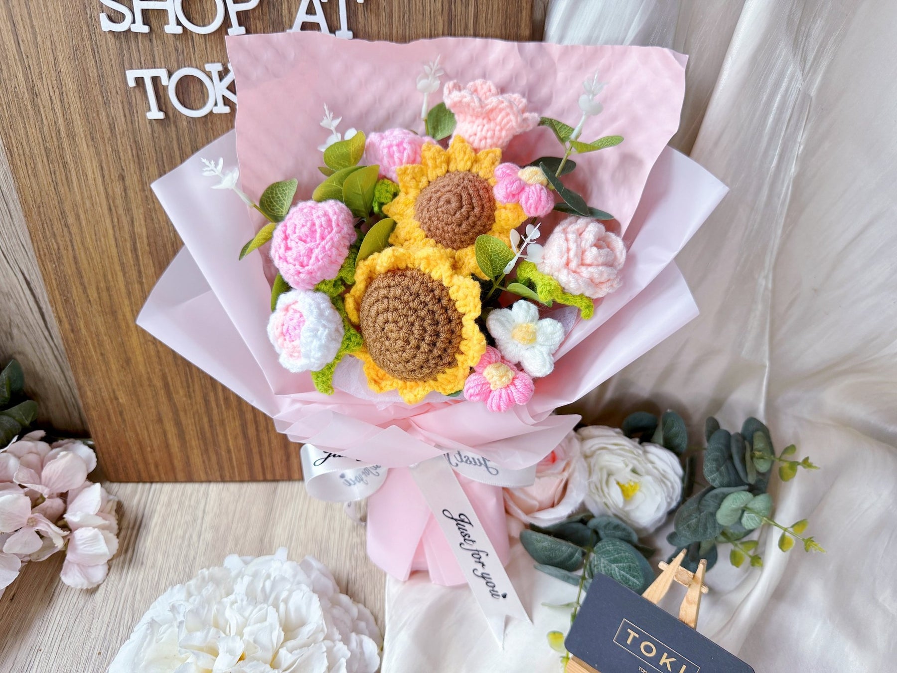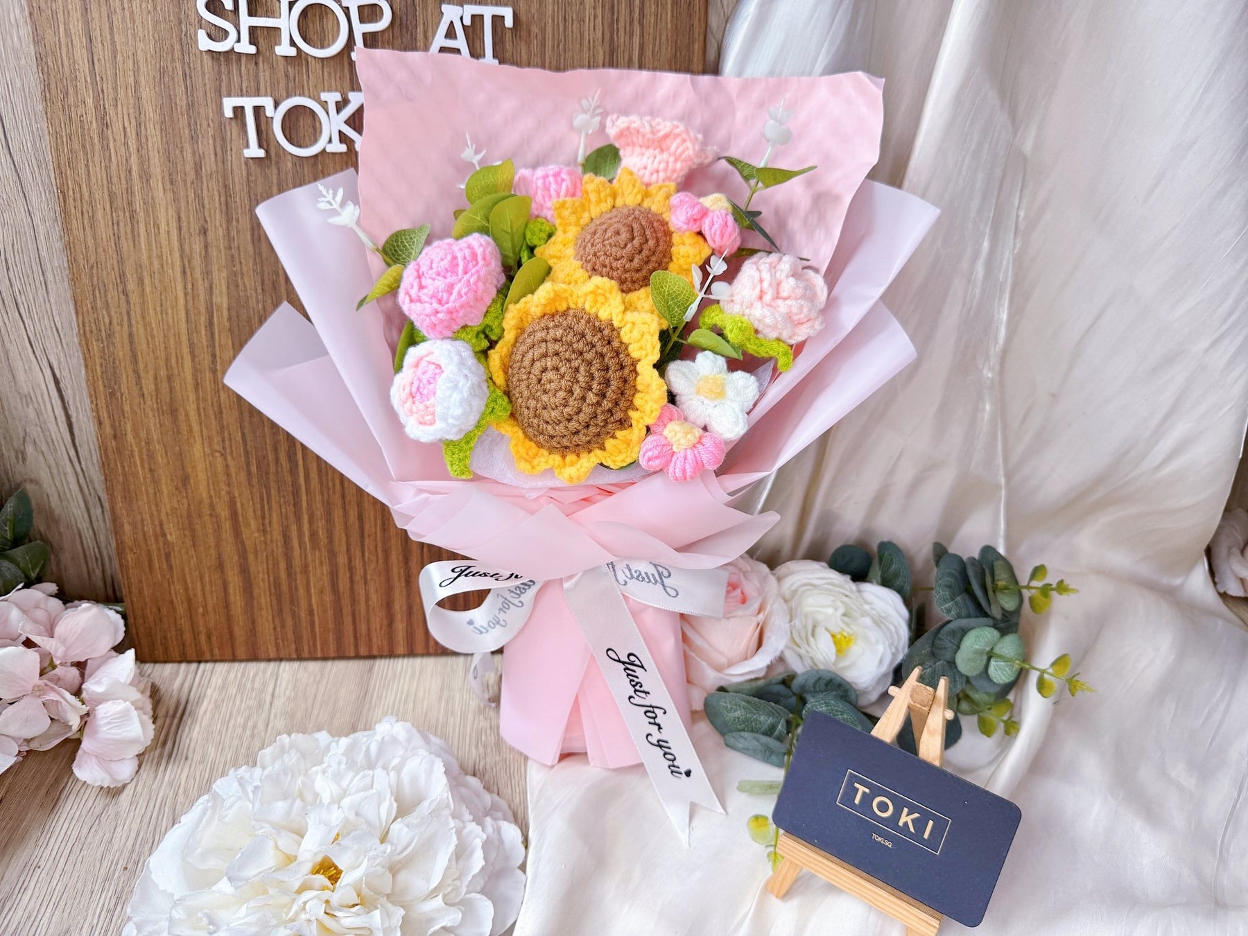 TOKI - 2 Crochet Sunflower Bouquet - Pink, Flowers, Birthday / Graduation