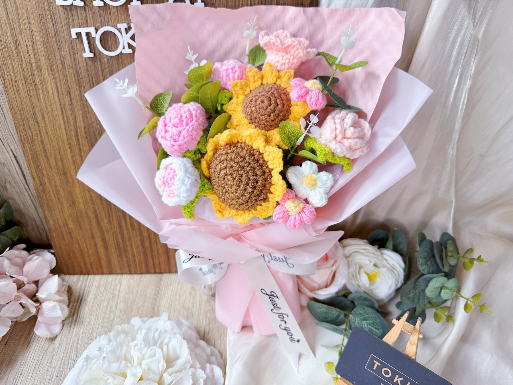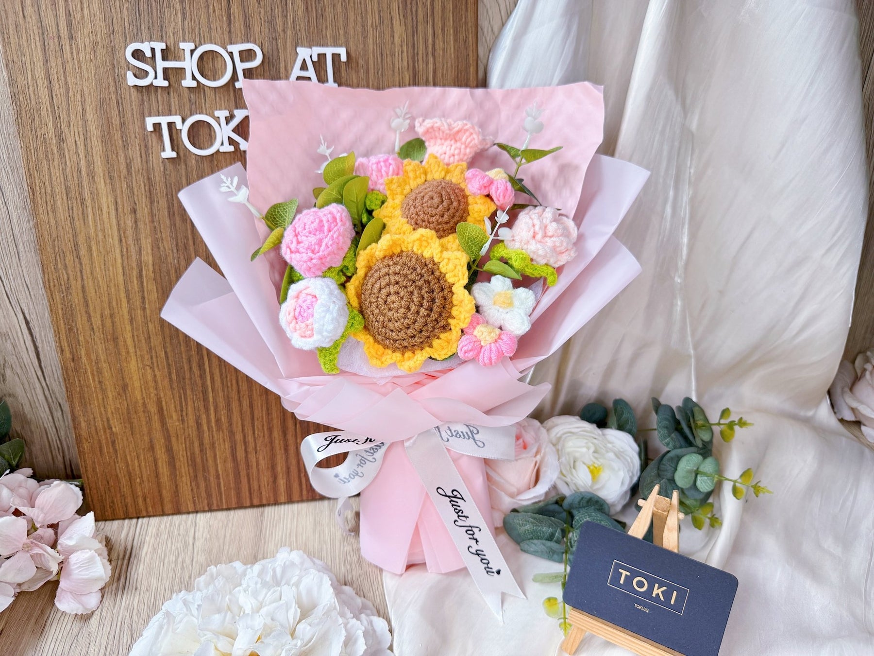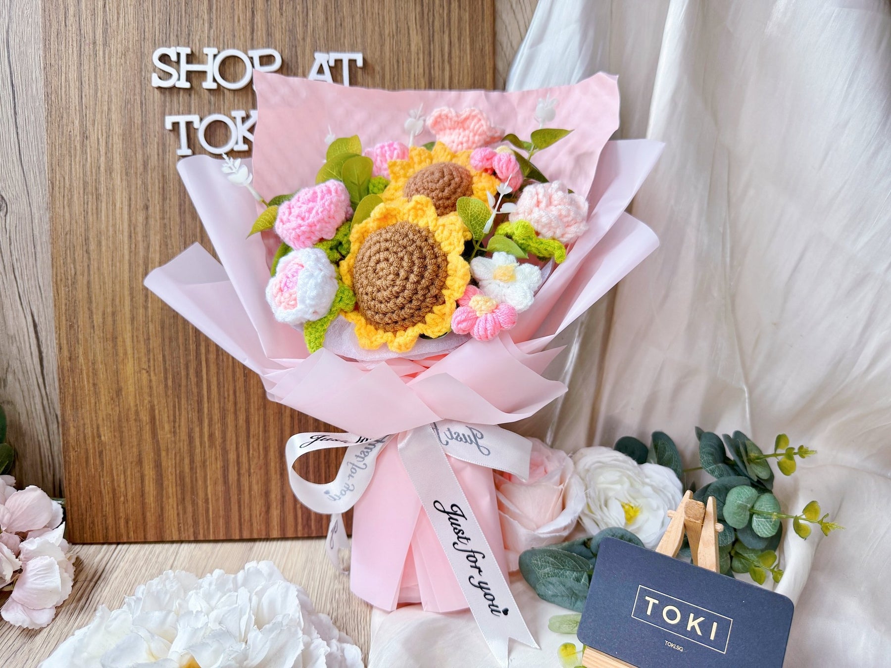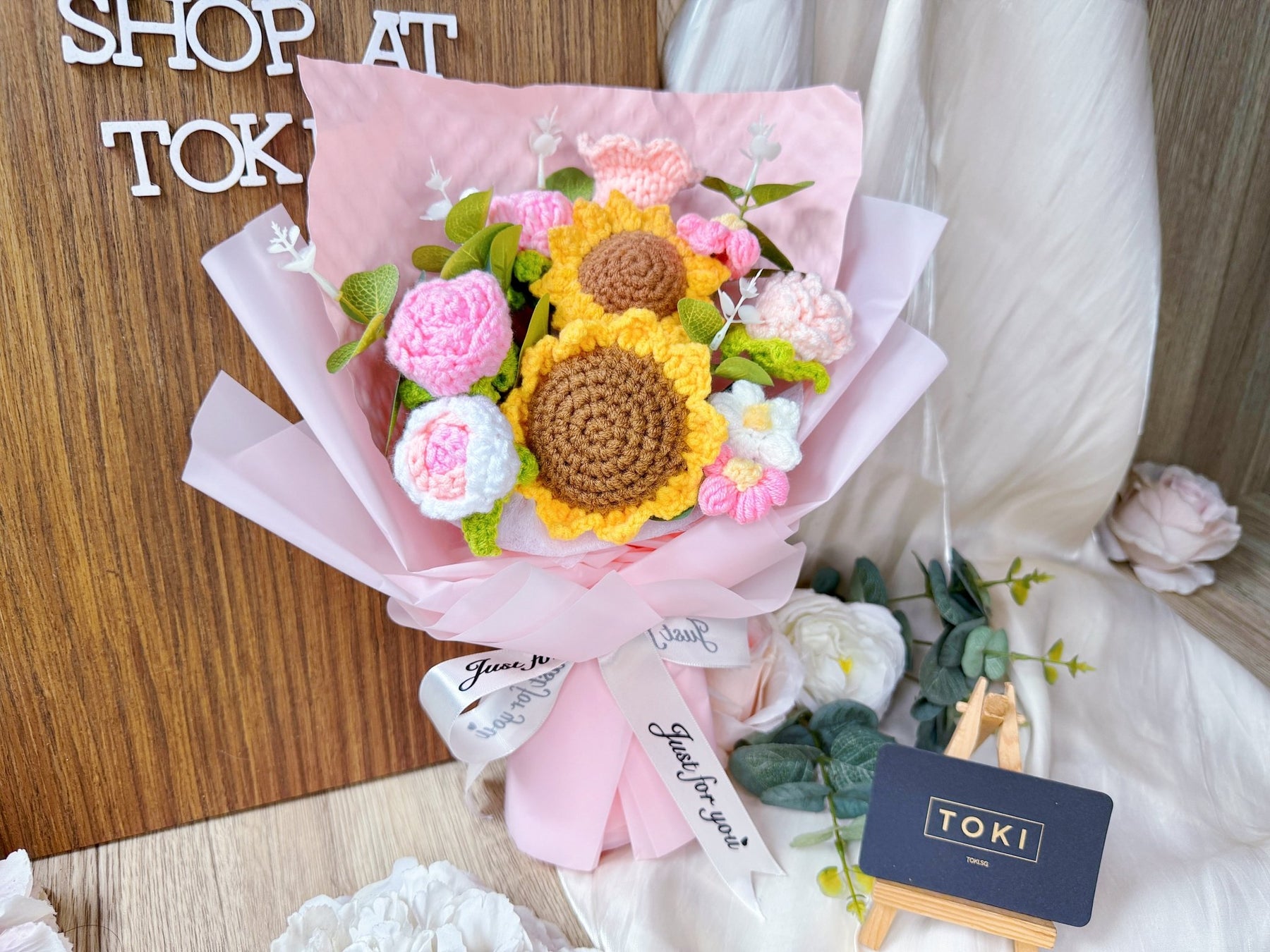 TOKI - 2 Crochet Sunflower Bouquet - Pink, Flowers, Birthday / Graduation
