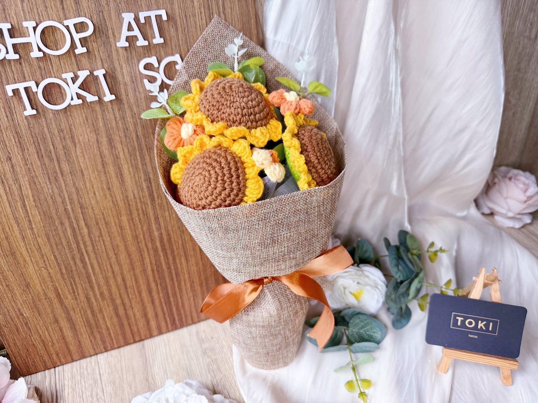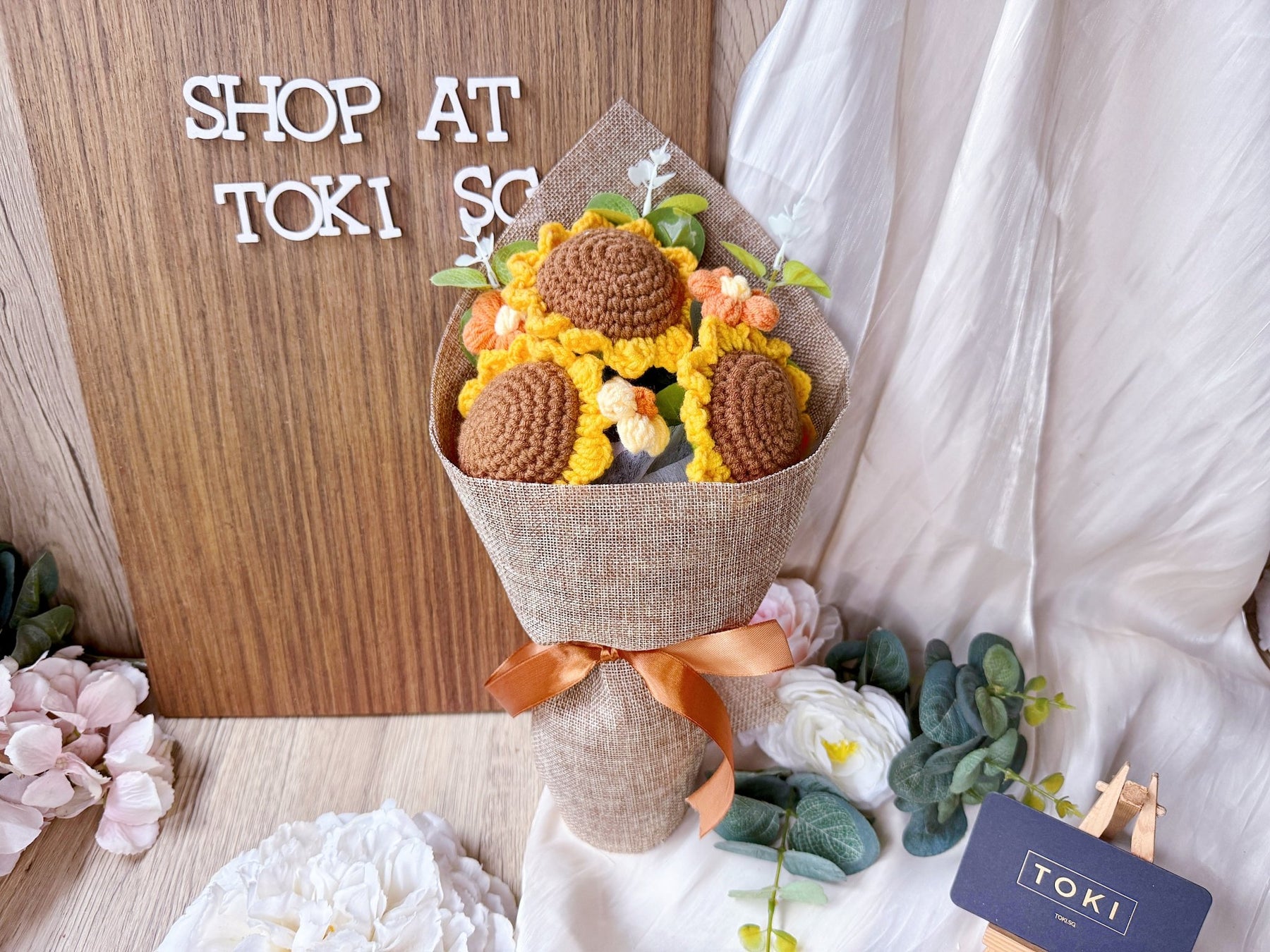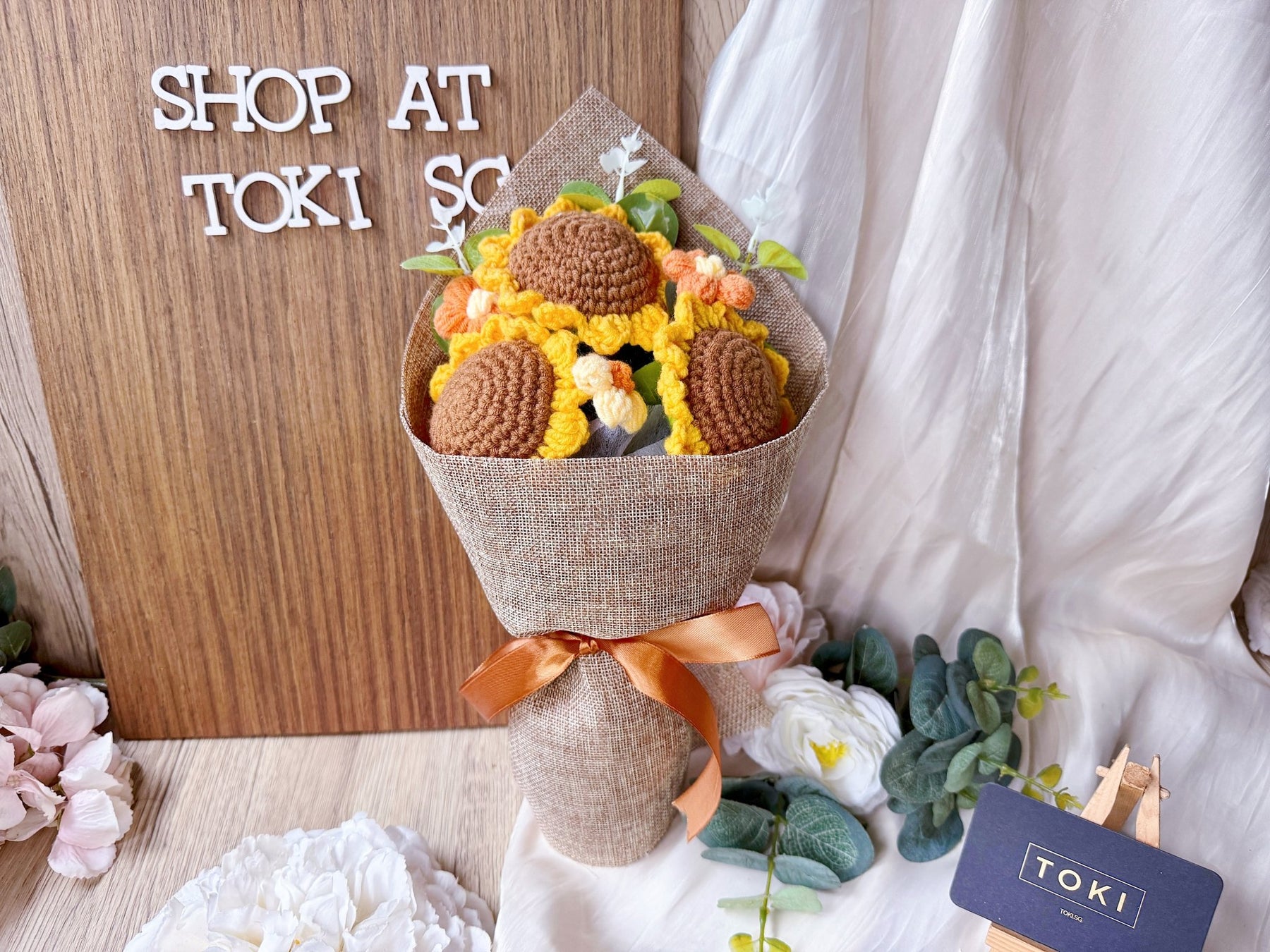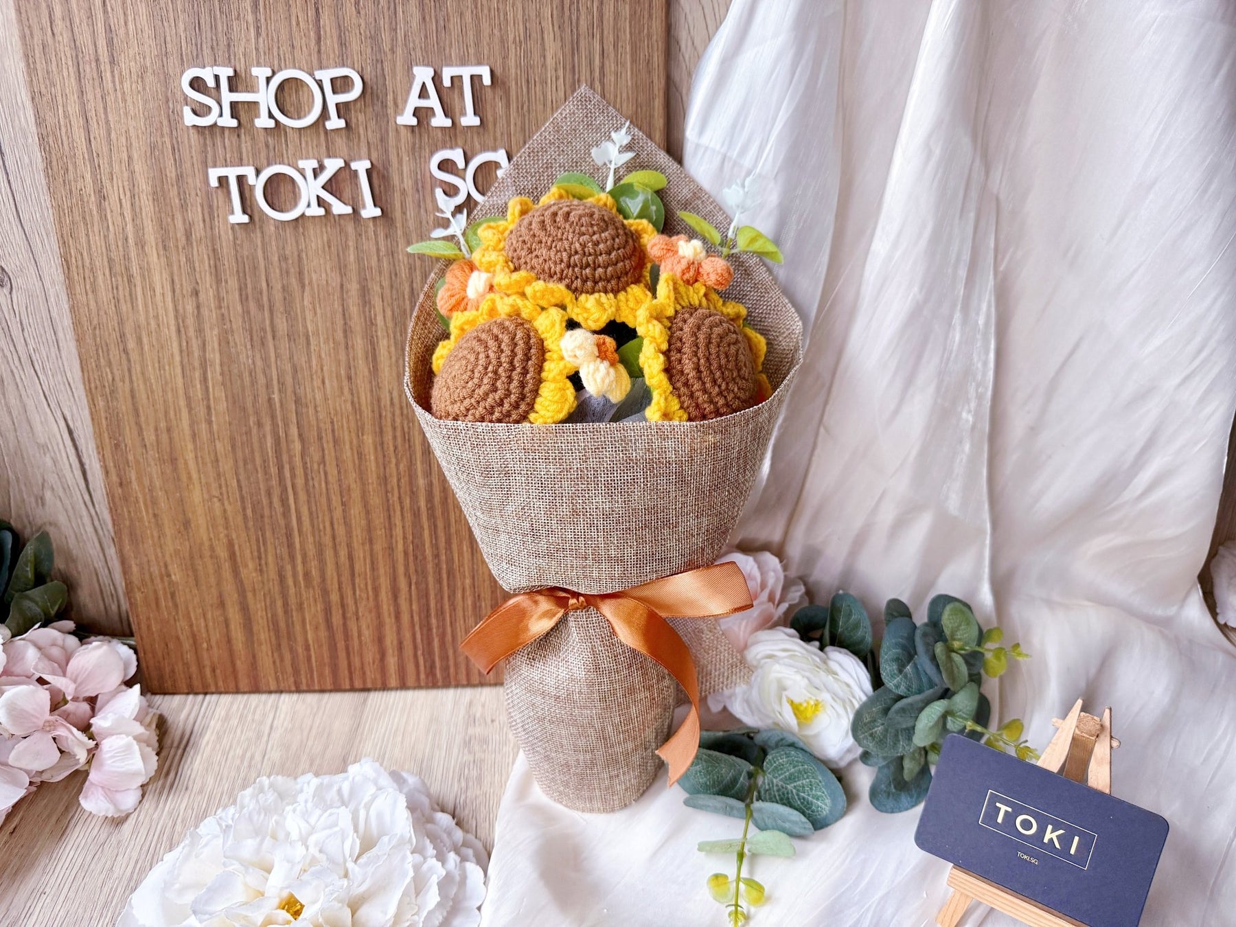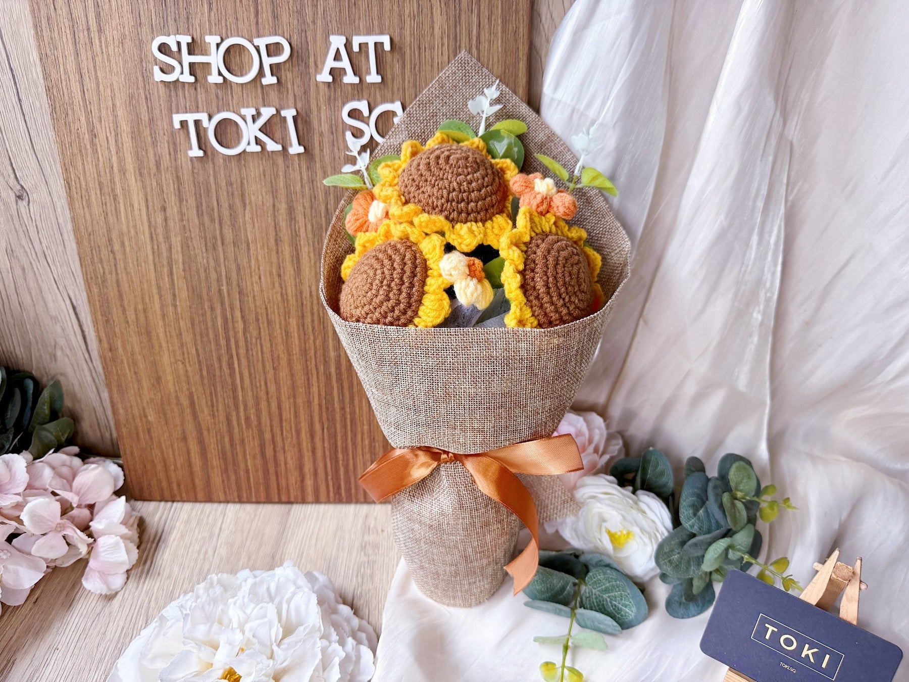 TOKI - 3 Crochet Sunflower Bouquet - Khaki, Flowers, Birthday / Graduation