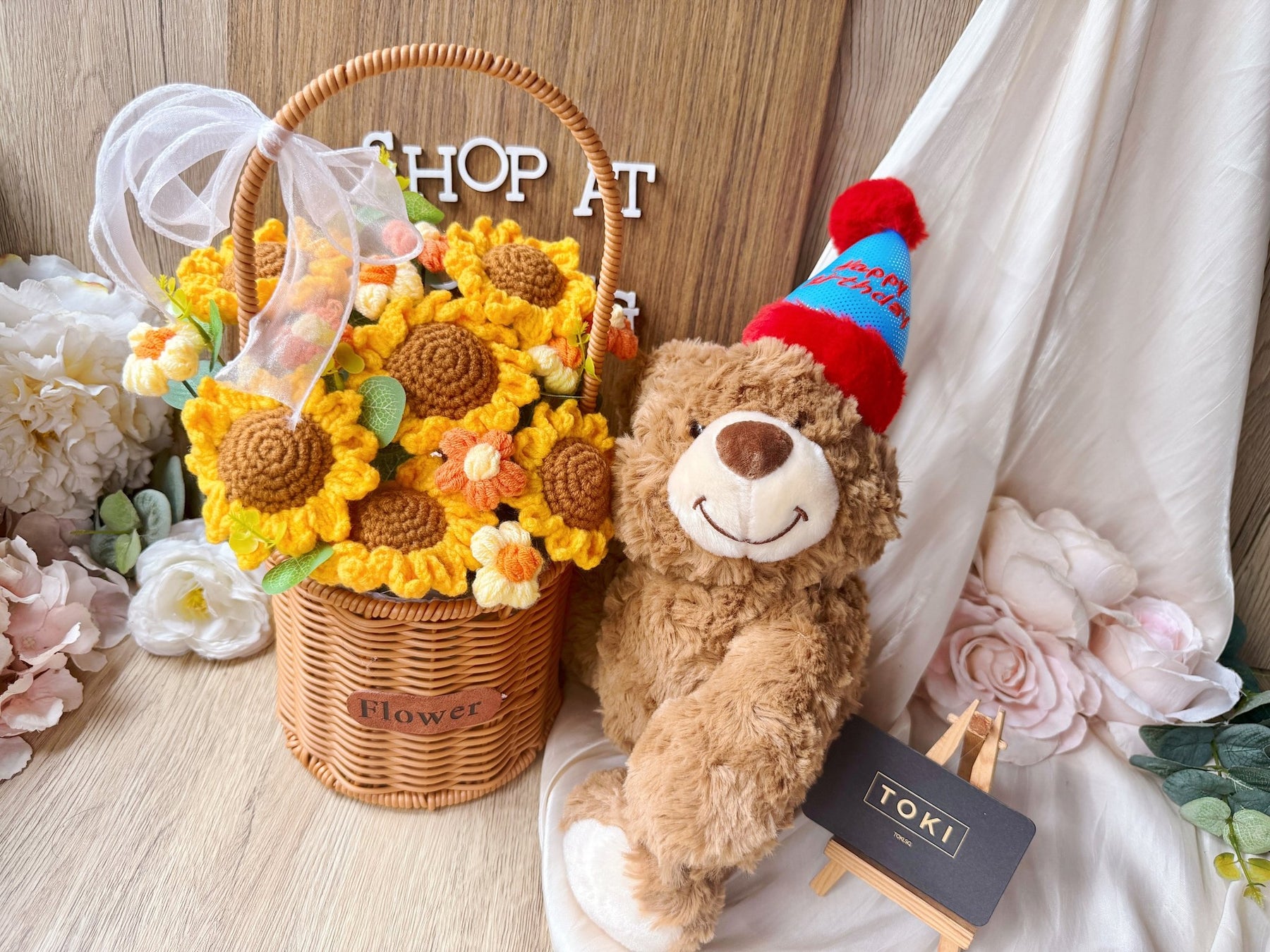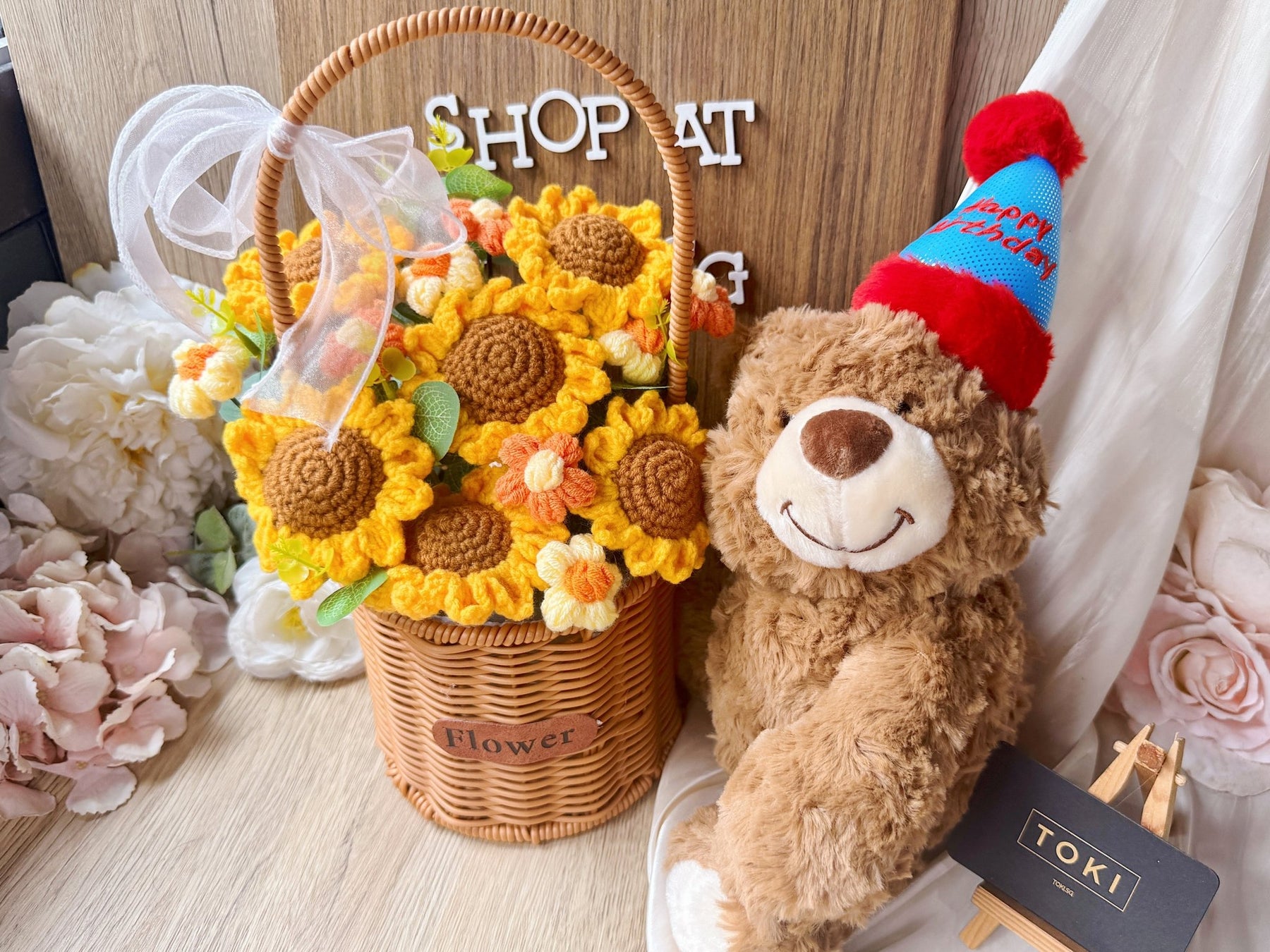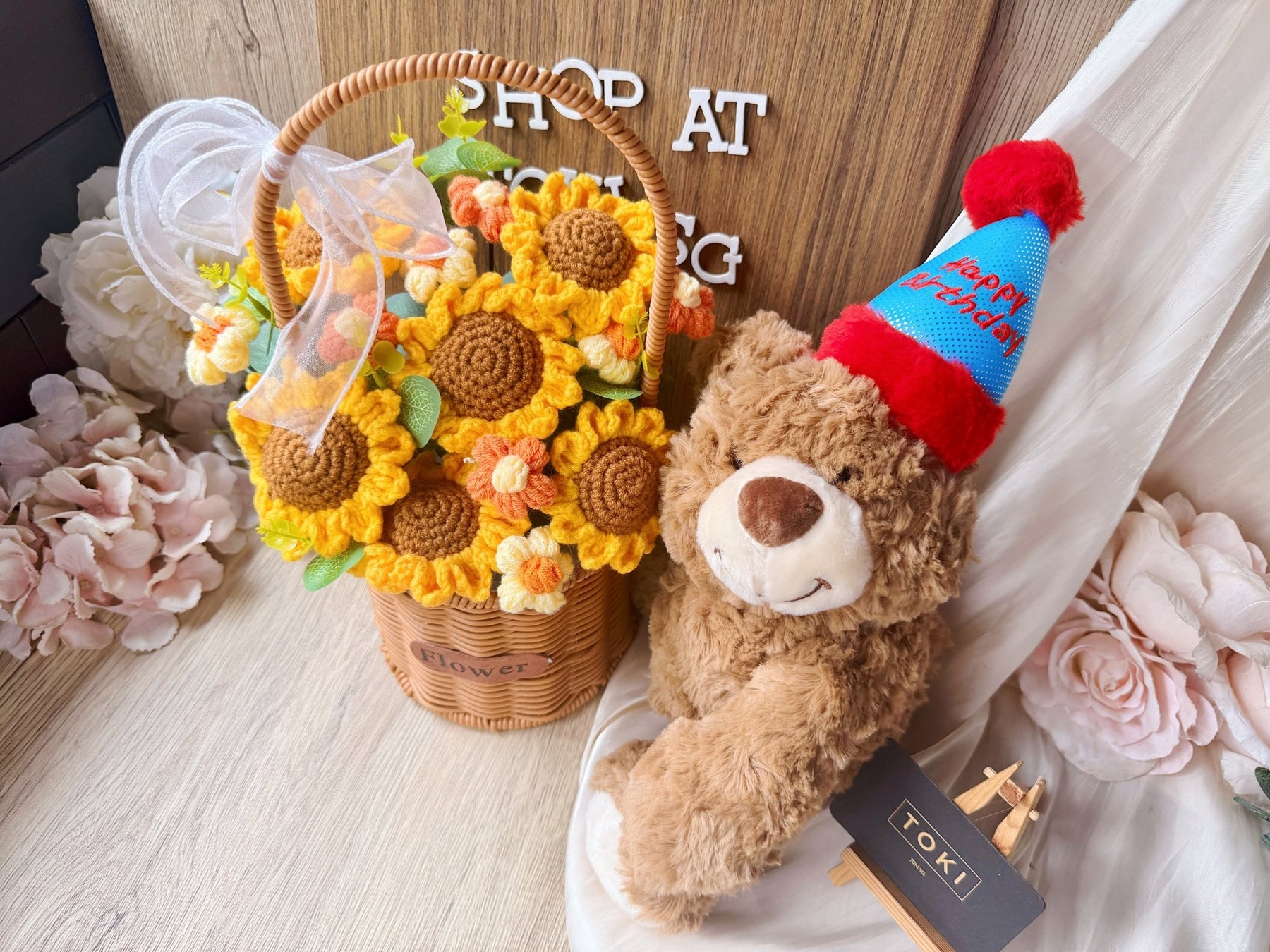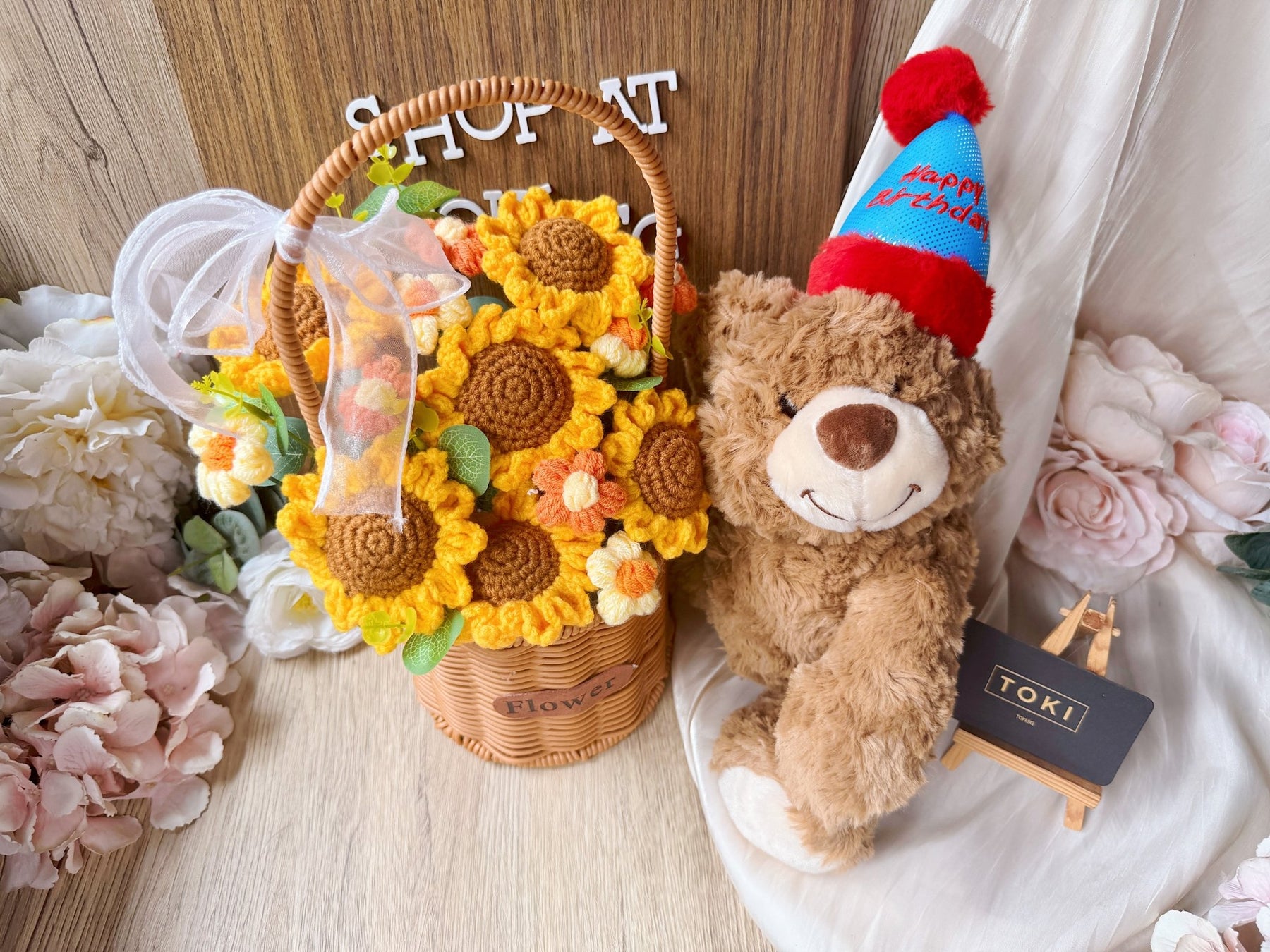 A charming gift featuring six vibrant crochet sunflowers nestled in a cozy basket, complete with an adorable bear companion perched on the side. The perfect keepsake to celebrate birthday—thoughtful, unique, and bursting with warmth. Each piece is crafted with care, making it an ideal present for graduates who appreciate everlasting treasures and meaningful tokens of achievement.