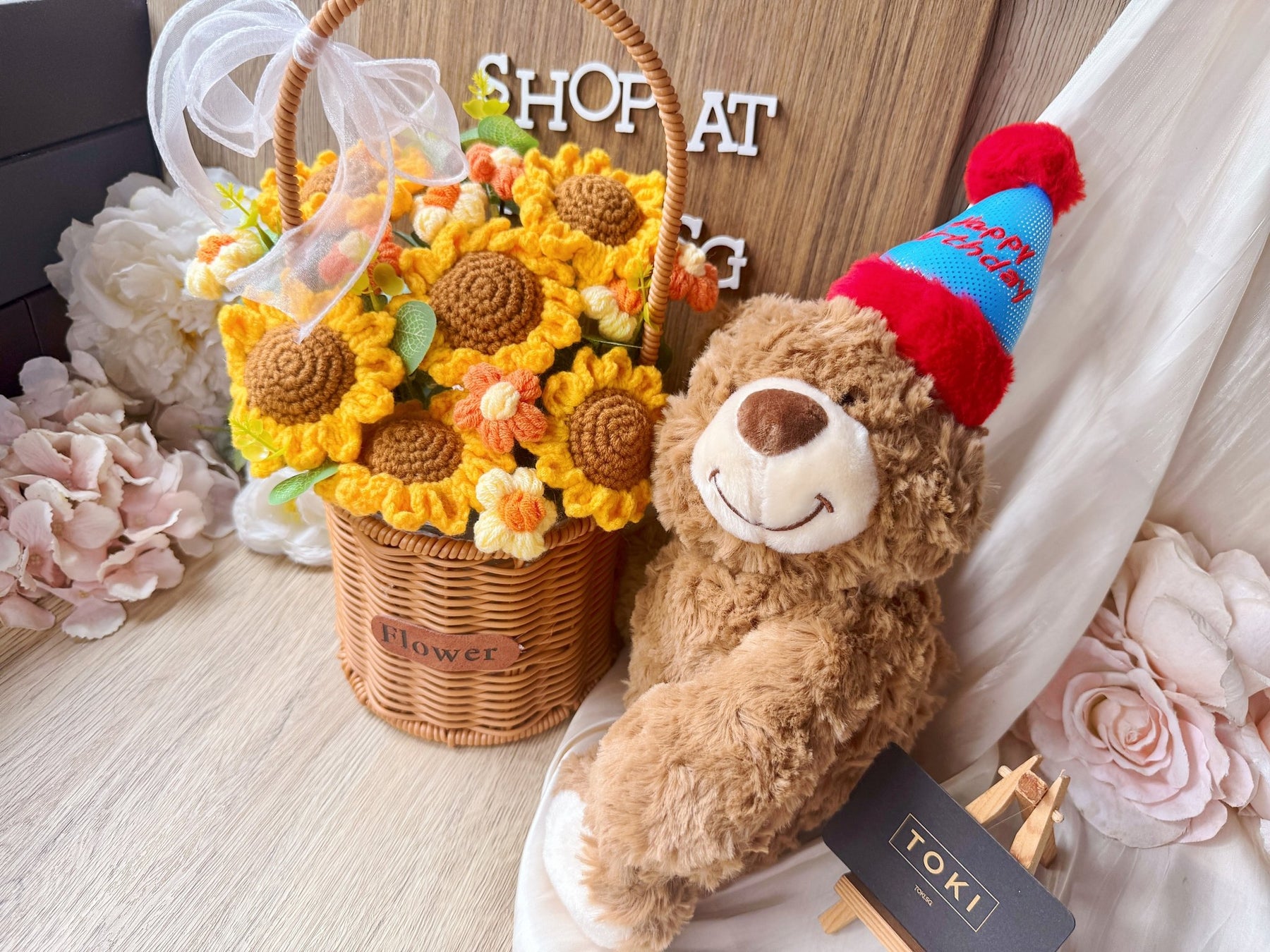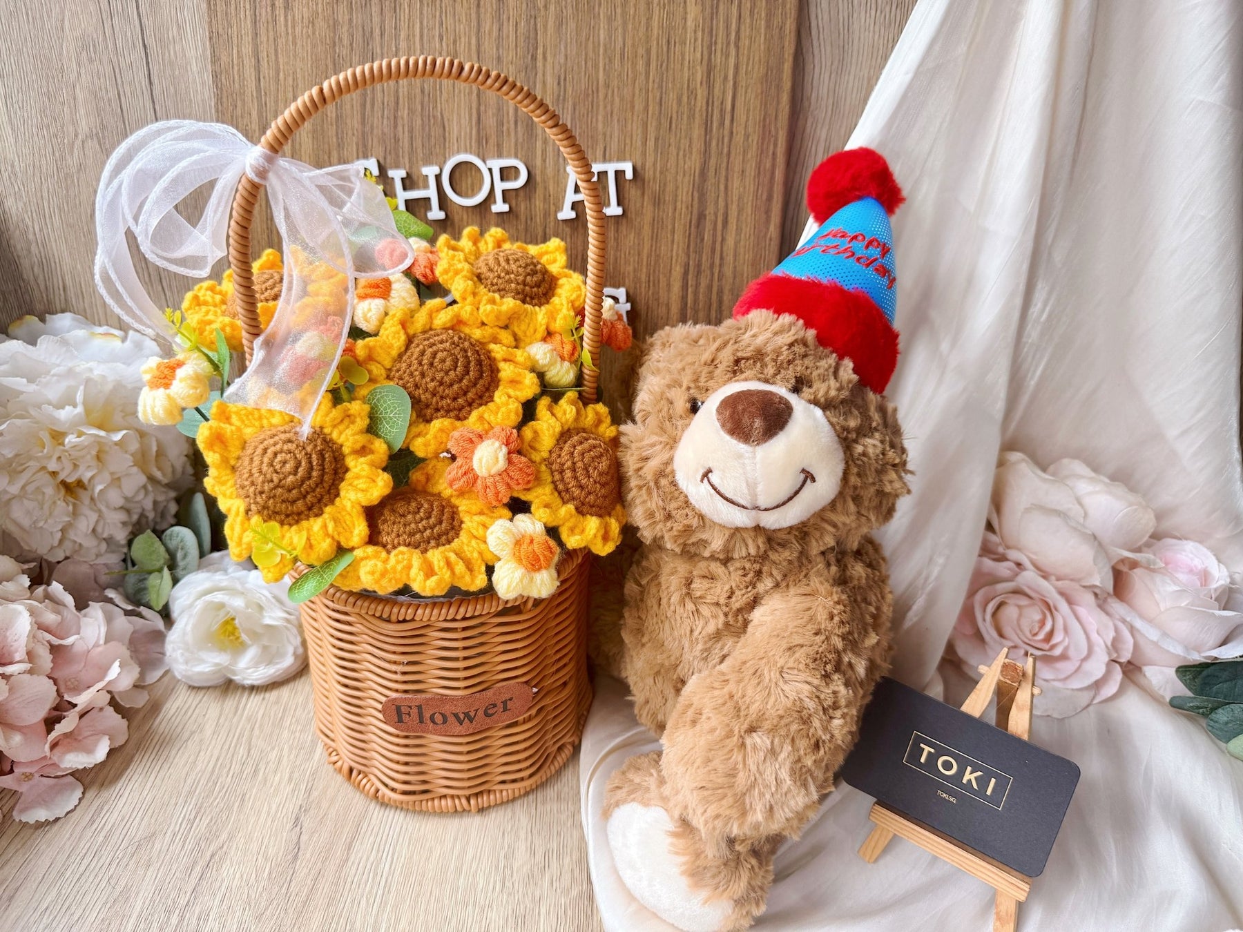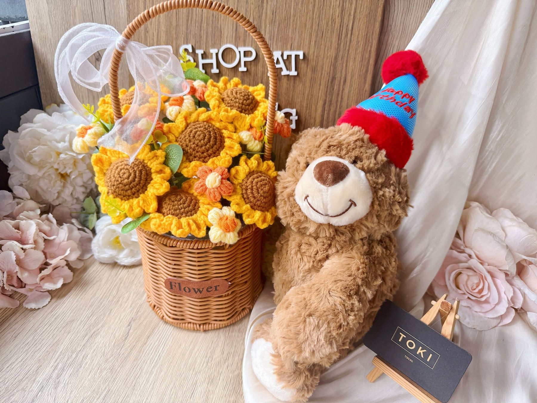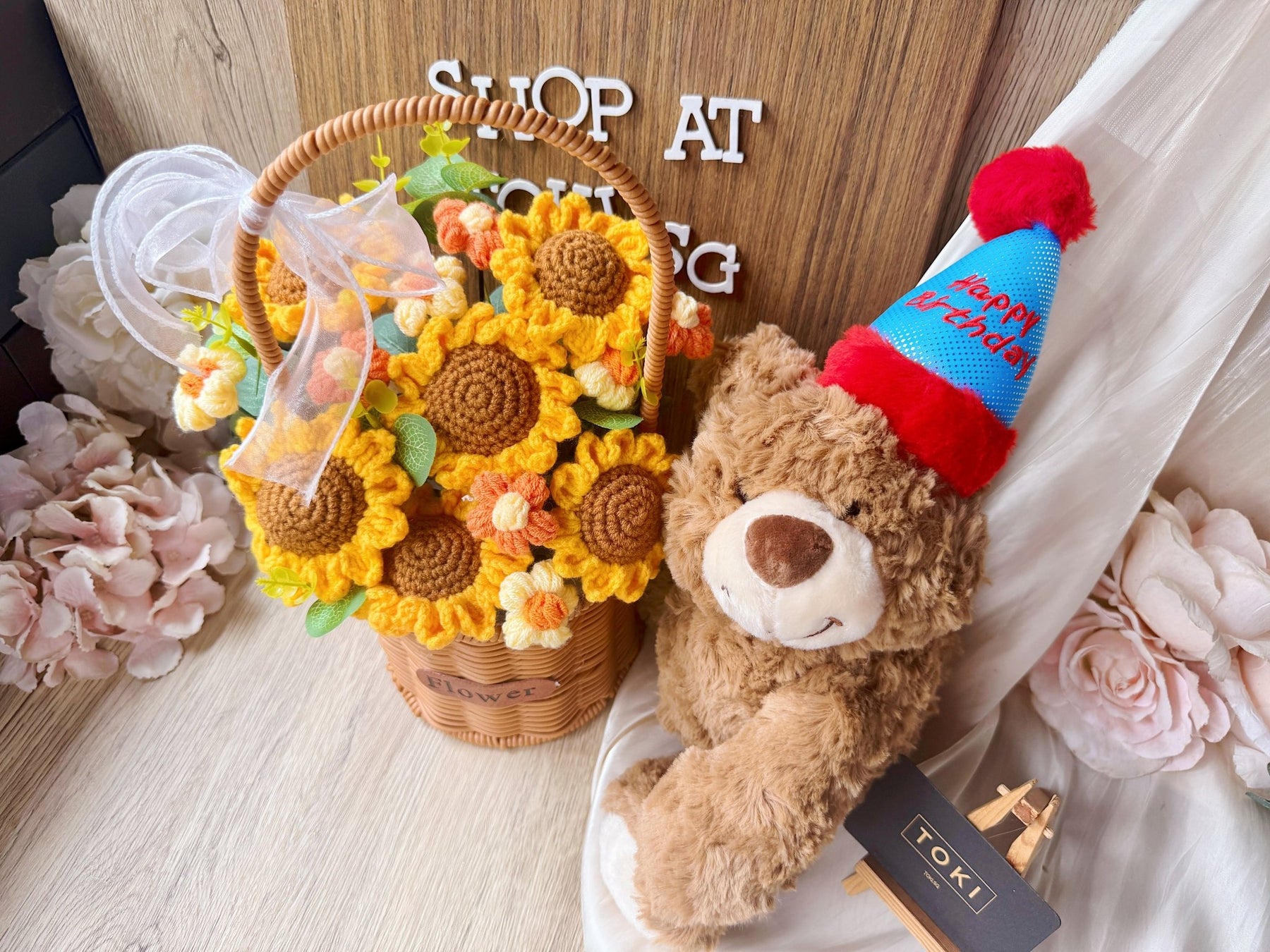 A charming gift featuring six vibrant crochet sunflowers nestled in a cozy basket, complete with an adorable bear companion perched on the side. The perfect keepsake to celebrate birthday—thoughtful, unique, and bursting with warmth. Each piece is crafted with care, making it an ideal present for graduates who appreciate everlasting treasures and meaningful tokens of achievement.