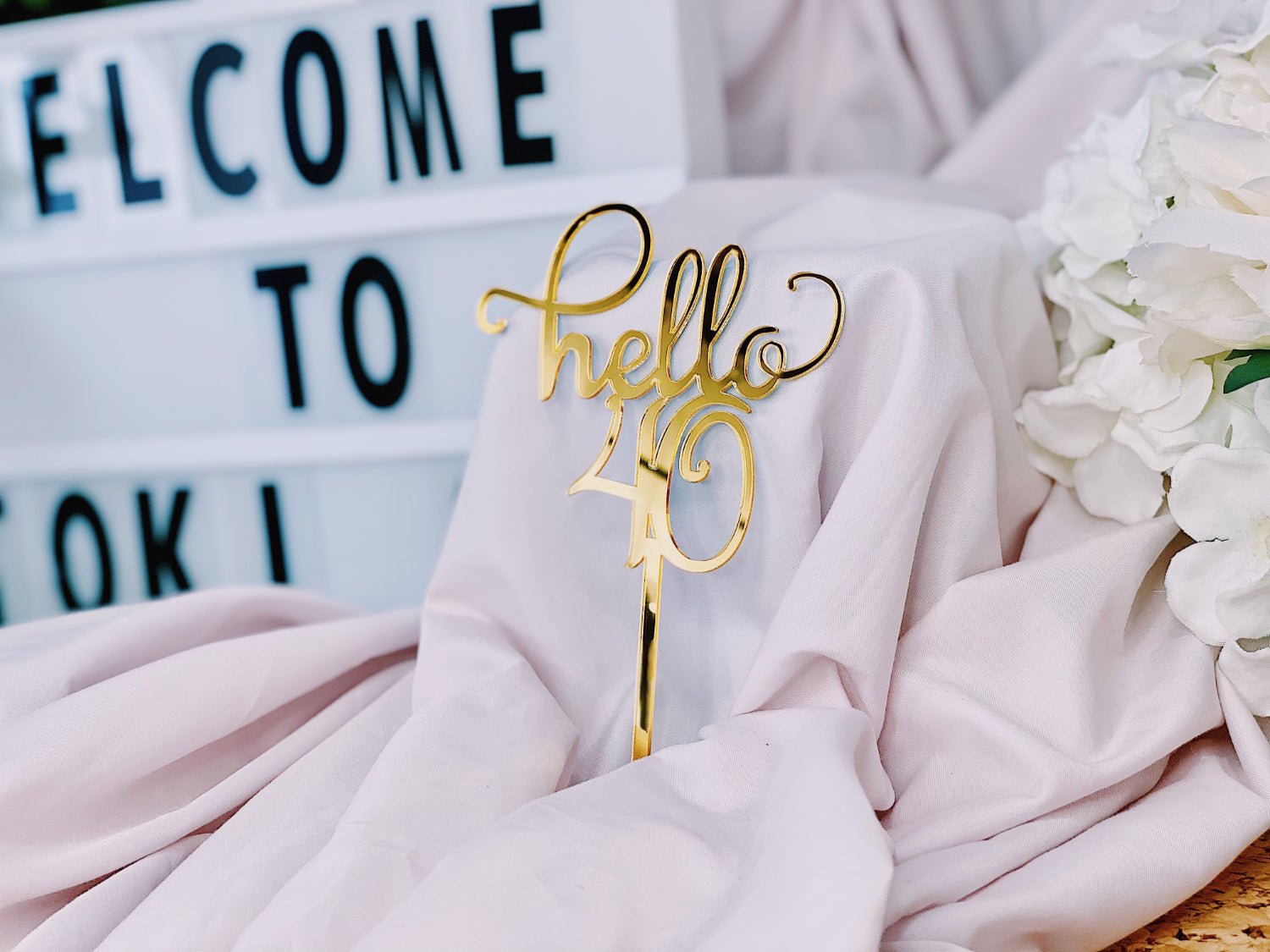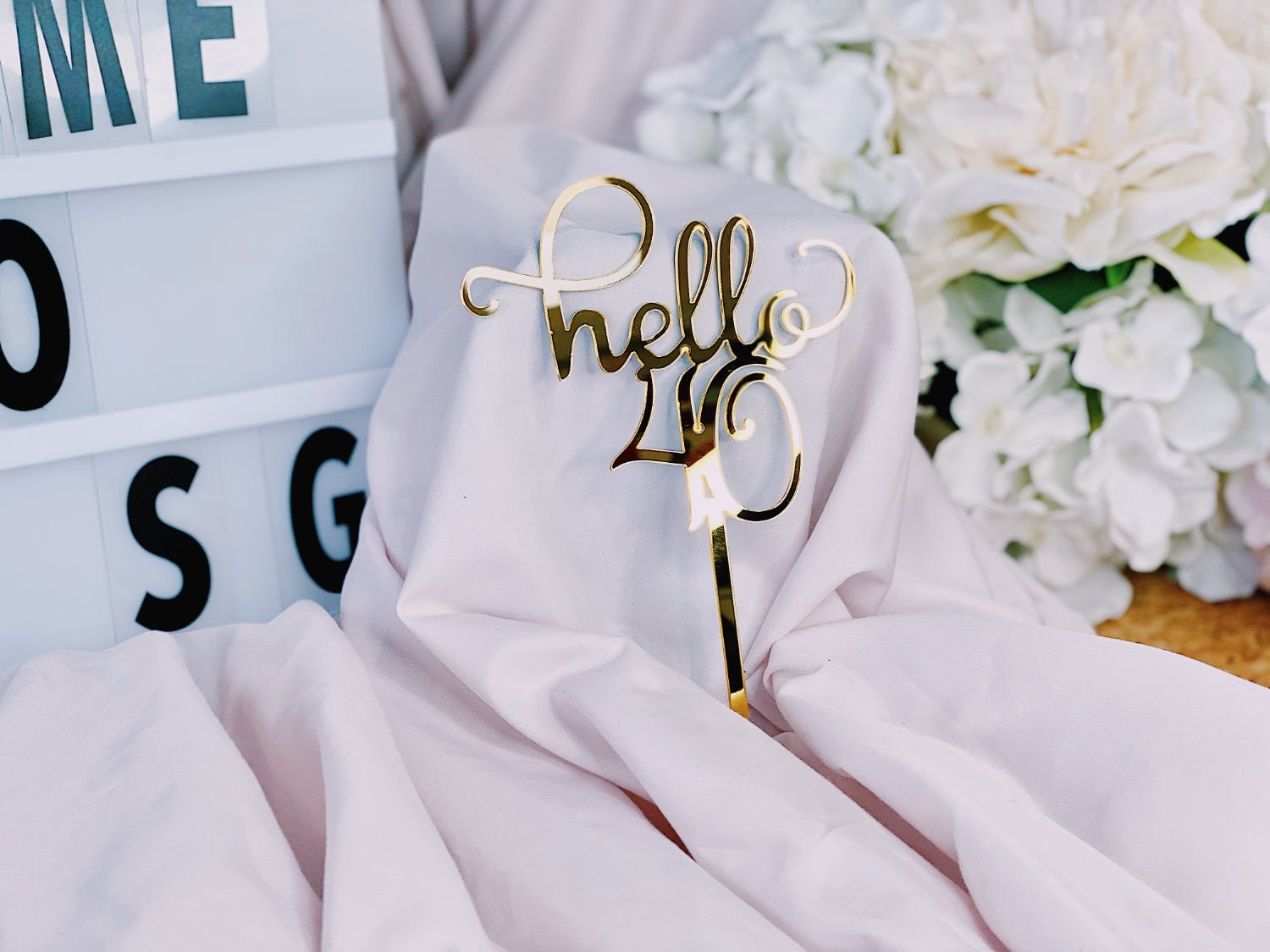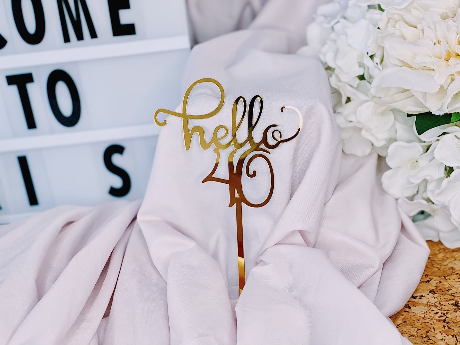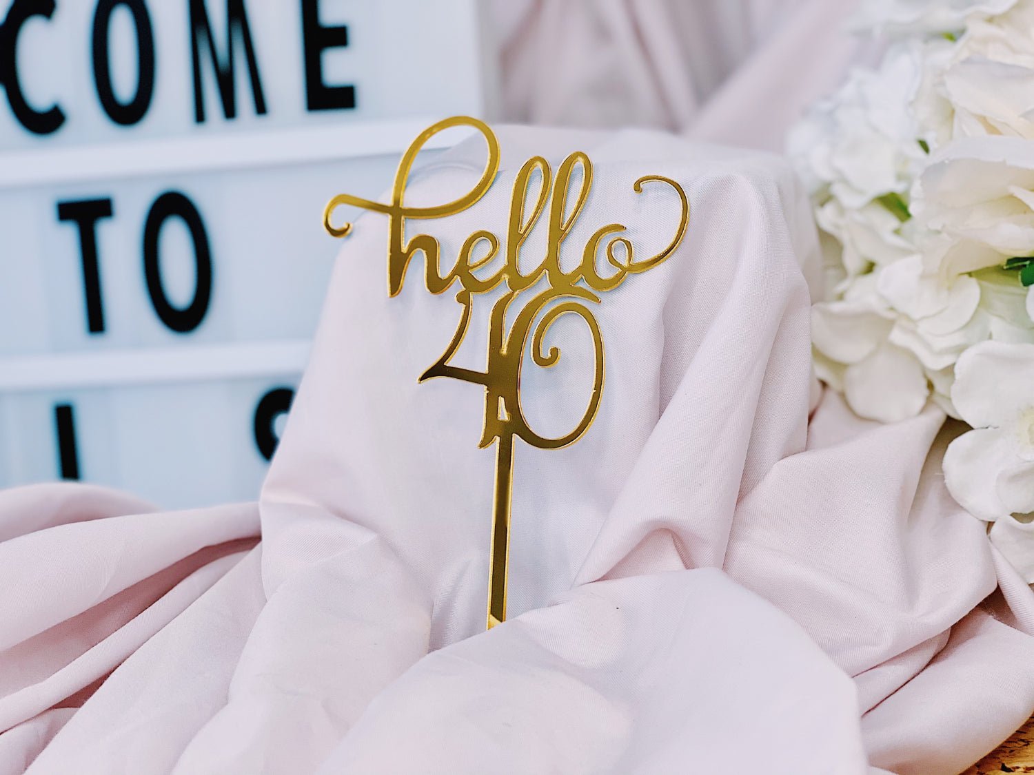 Celebrate a special "Hello 40" birthday with this elegant gold topper. Designed as a perfect add-on to any flower bouquet, it adds a personalized and festive touch to your gift arrangement. Durable and easy to place, this topper highlights the milestone in a stylish and memorable way.