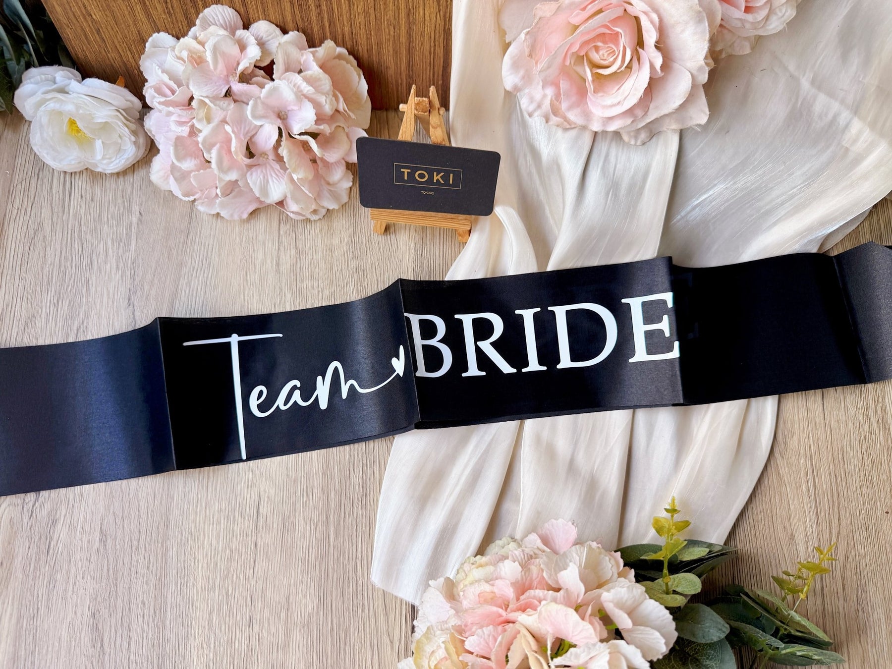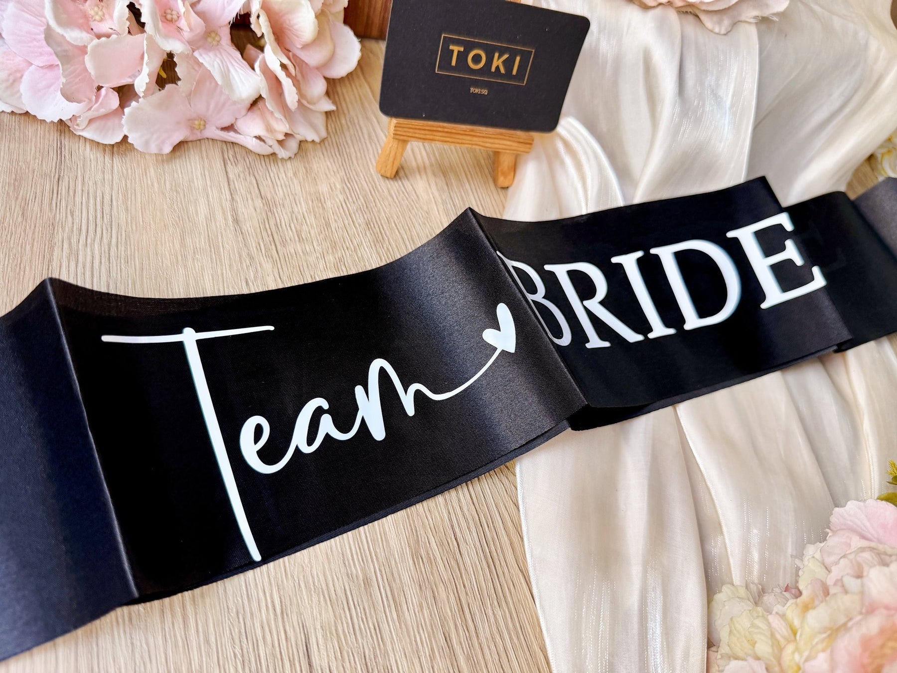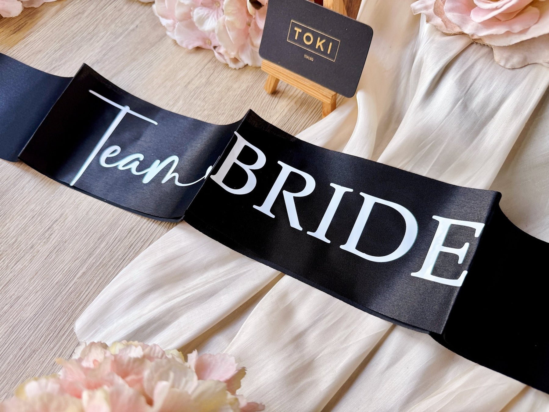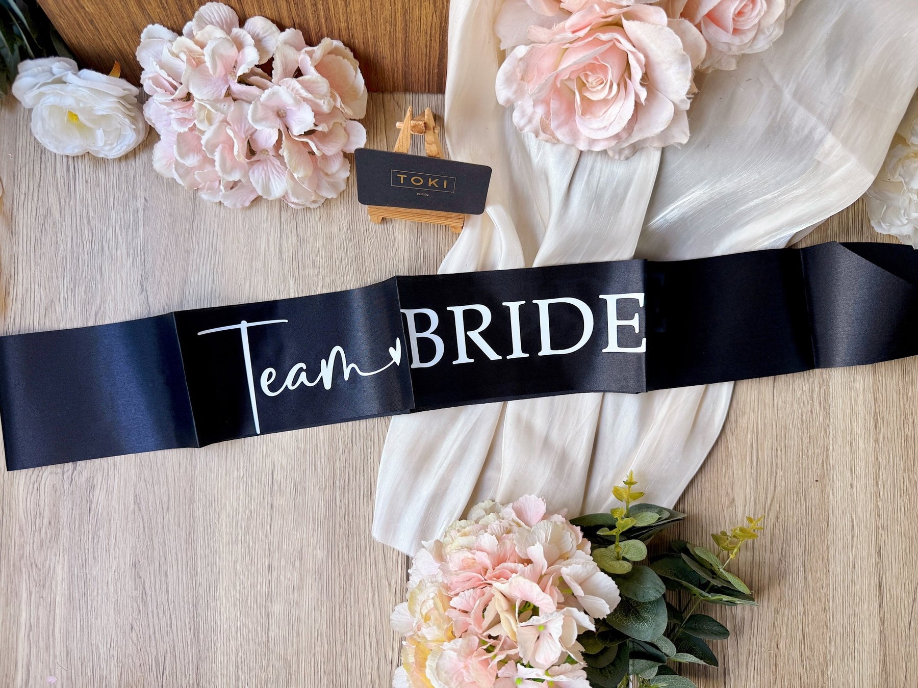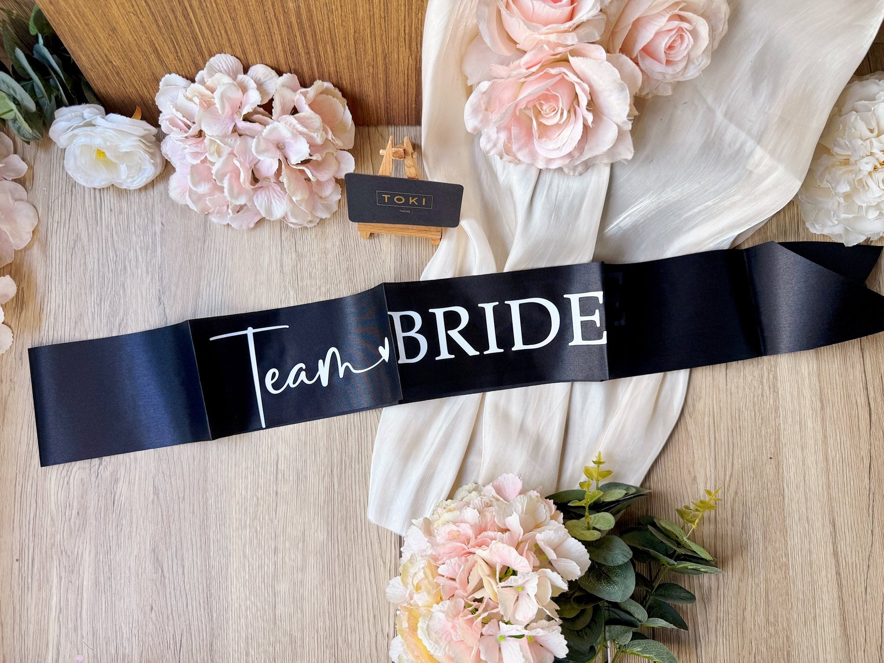 Celebrate in style with this elegant black cursive "Team Bride" sash, perfect for bachelorette parties. Designed for bridesmaids, it adds a fun and coordinated touch to any celebration, making everyone feel special and connected. Lightweight and easy to wear, it’s a great way to show your team spirit during pre-wedding festivities.