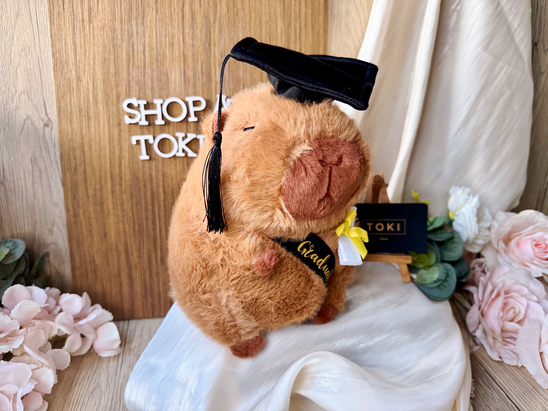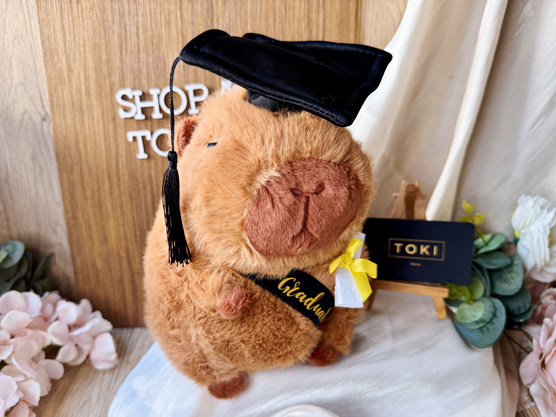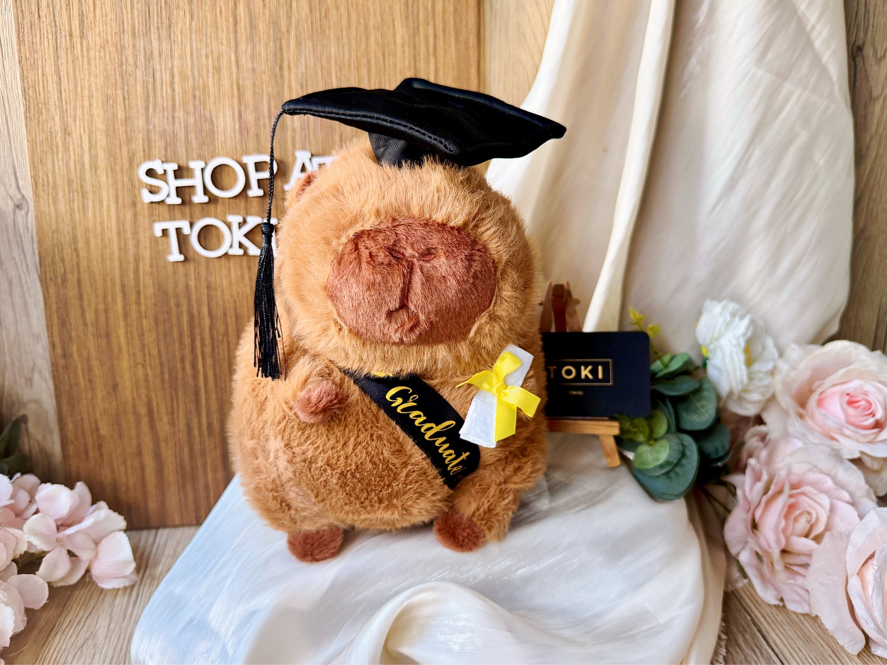 Introducing our cuddly Capybara plush! At 26CM, it's the perfect size for hugging and comes with a mortar board, sash & certificate. Makes a great gift for any graduate!