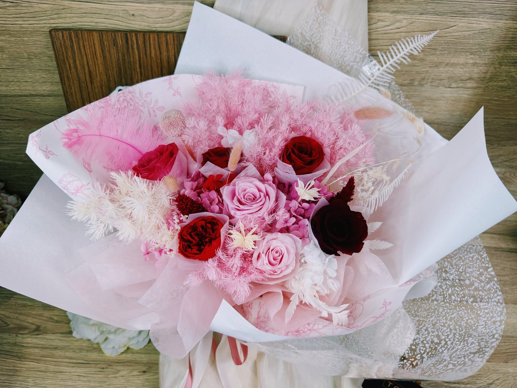 Express your love in a grand way with our "Grande" bouquet. Featuring 7 preserved roses in romantic shades, alongside fluffy feathers and delicate side flowers. This large, head turning bouquet is the perfect way to showcase your love.